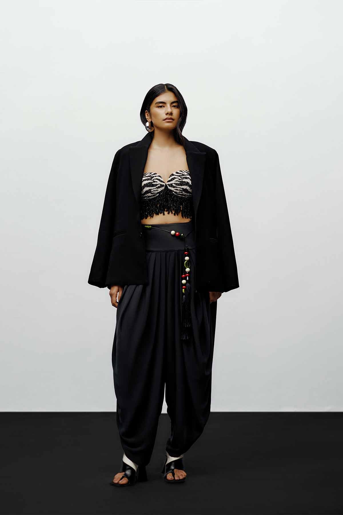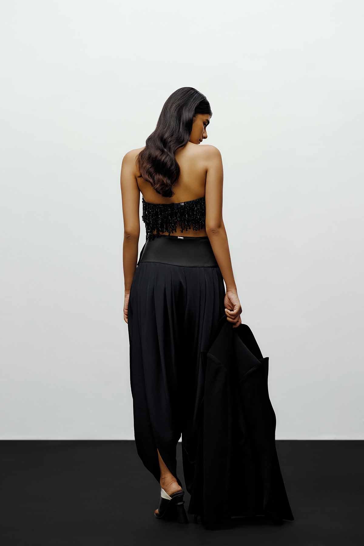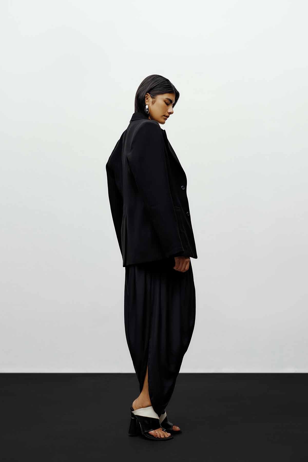 A sculptural take on relaxed elegance, the draped pants reinterpret traditional drapery through a modern lens. Crafted in fluid black fabric, the silhouette features a low-crotch drape with generous volume that tapers at the ankle, creating a distinctive flow and movement with every step. The pants sit gracefully on the waist, sculpting a fluid yet defined shape that merges ease and sophistication. Designed to be fitted at waist and flares at thigh and closed at hem