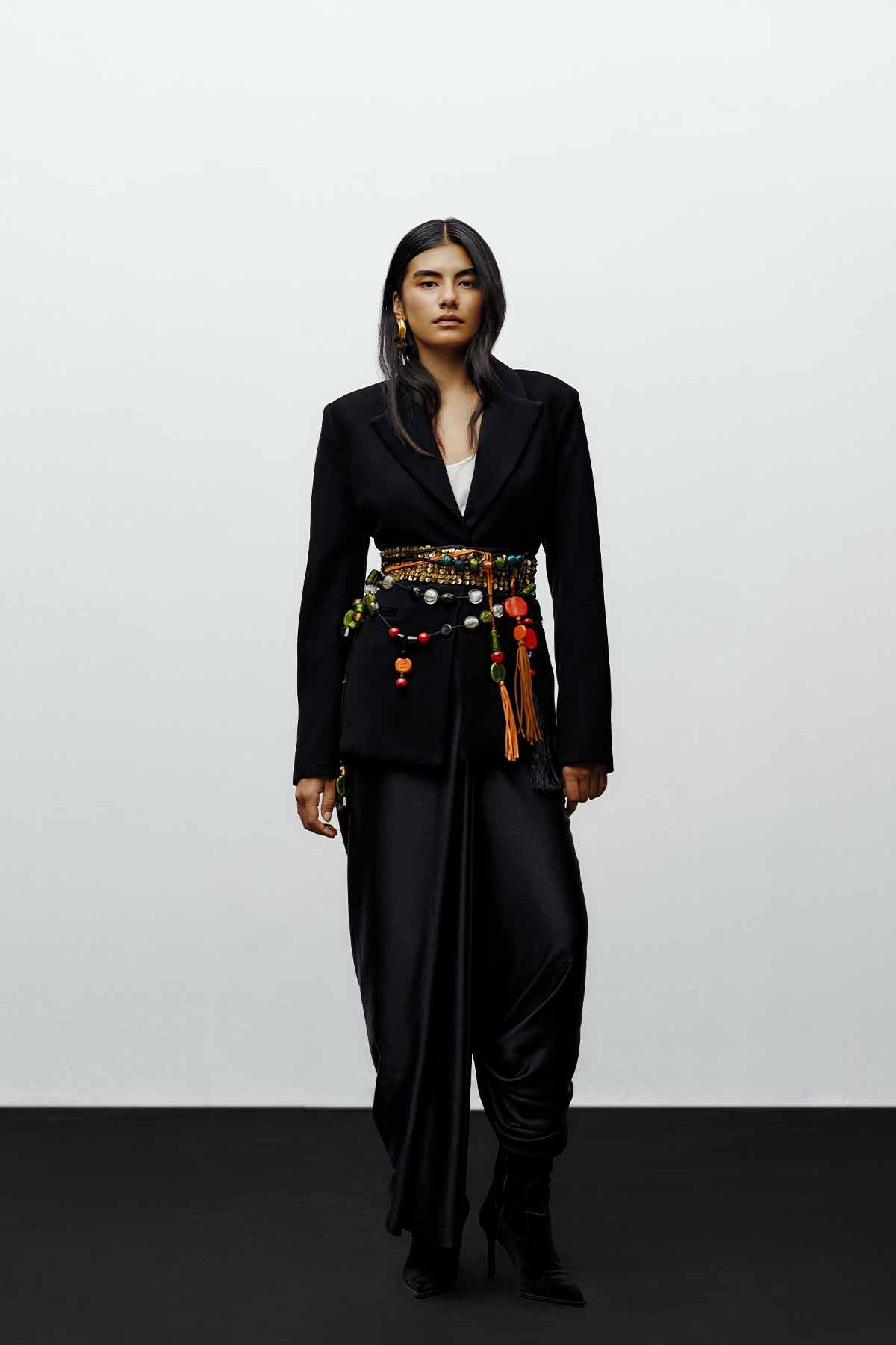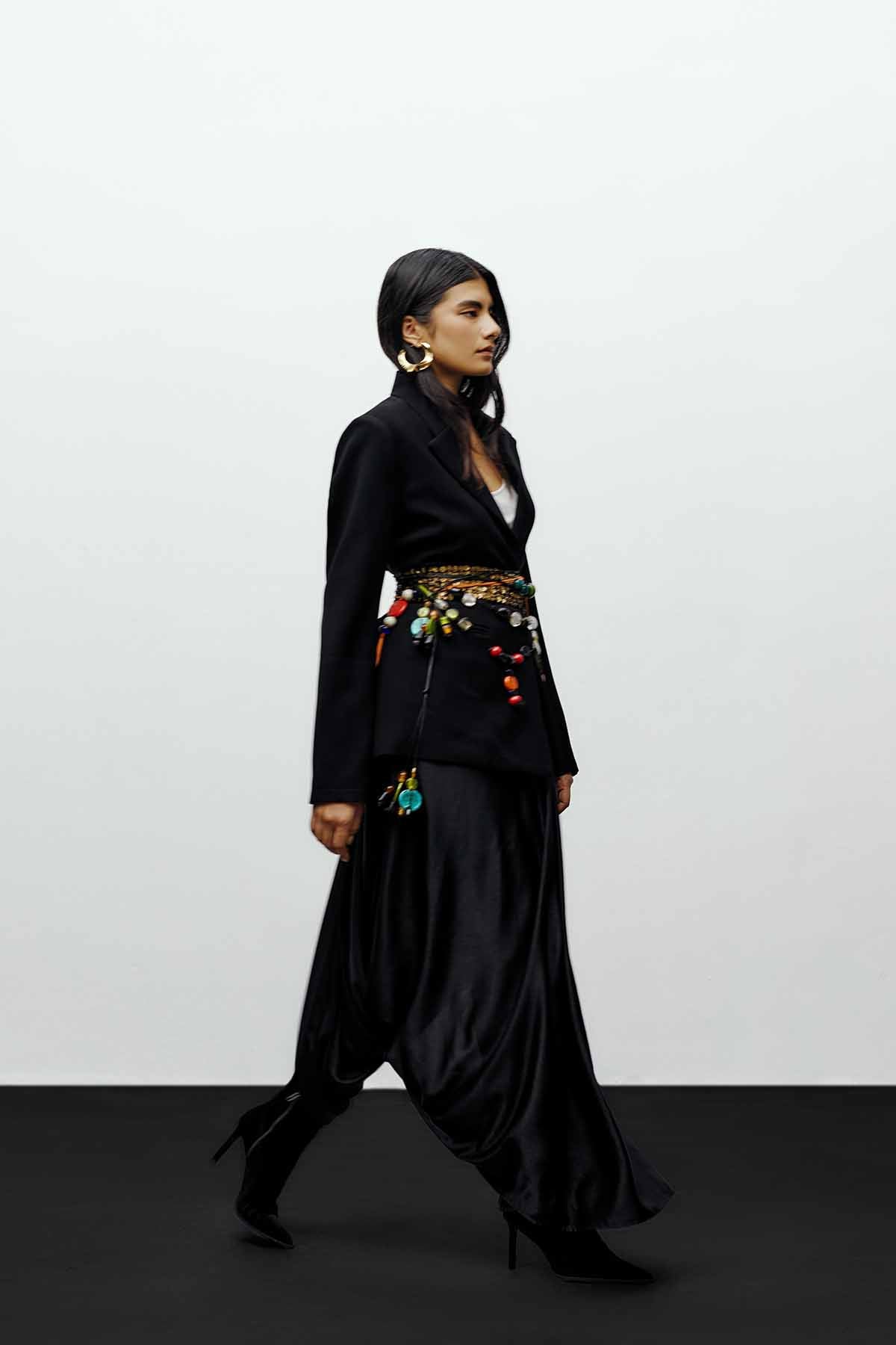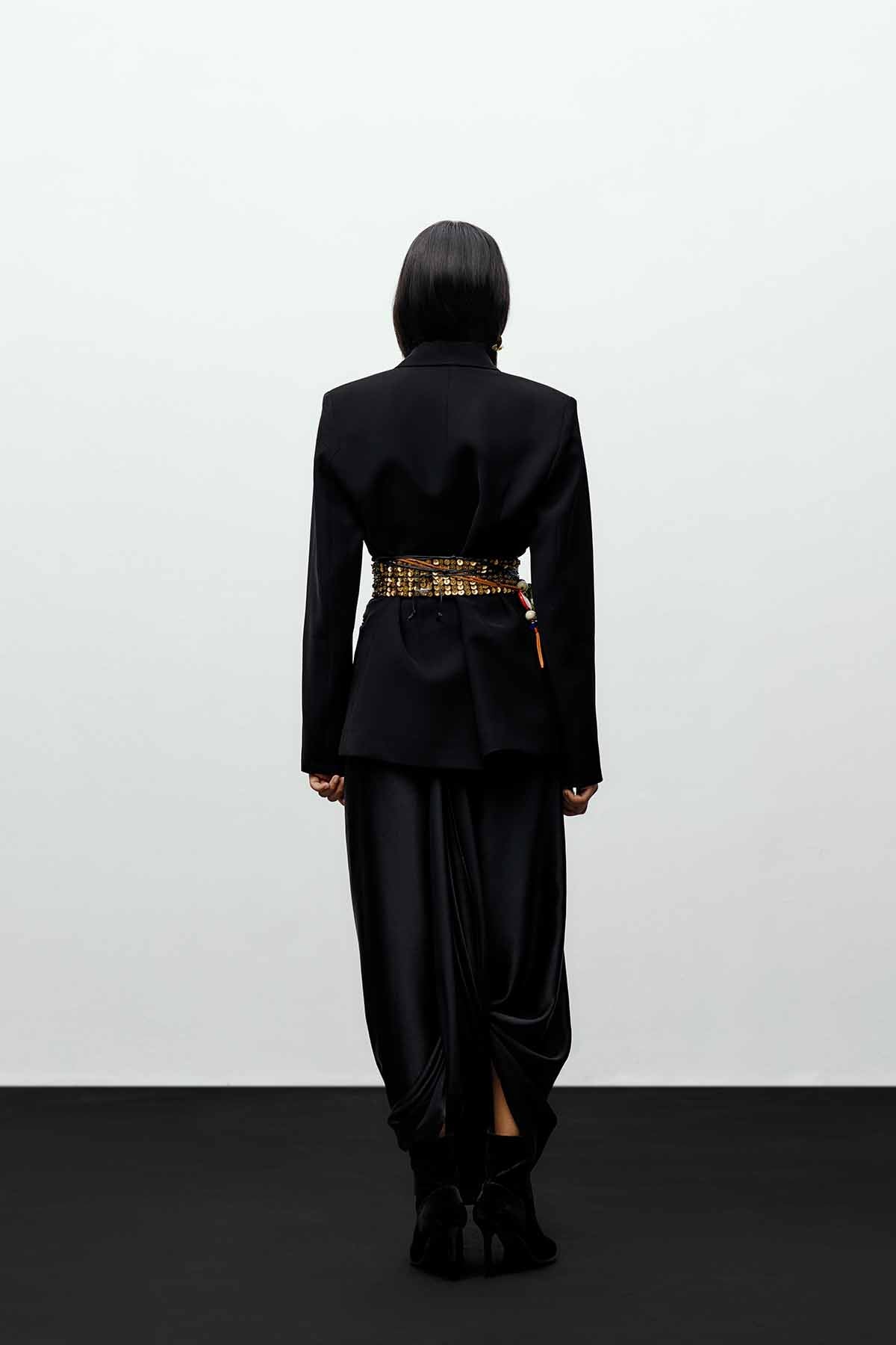 Timeless essential reimagined through the lens of modern elegance, the 431-88 black draped satin crepe pants blend structured tailoring with fluid movement. Crafted from luxurious satin, these pants feature a draped front panel that creates an elongated silhouette, offering both sophistication and ease. The design is elevated with delicate white bead embellishments that trace the edge of the drape, adding a subtle glint of light with every step. The high-waisted fit enhances the body’s natural lines, while the relaxed leg ensures effortless comfort and poise. Perfect for statement evenings or refined daywear, this piece embodies the essence of 431-88’s understated glamour.