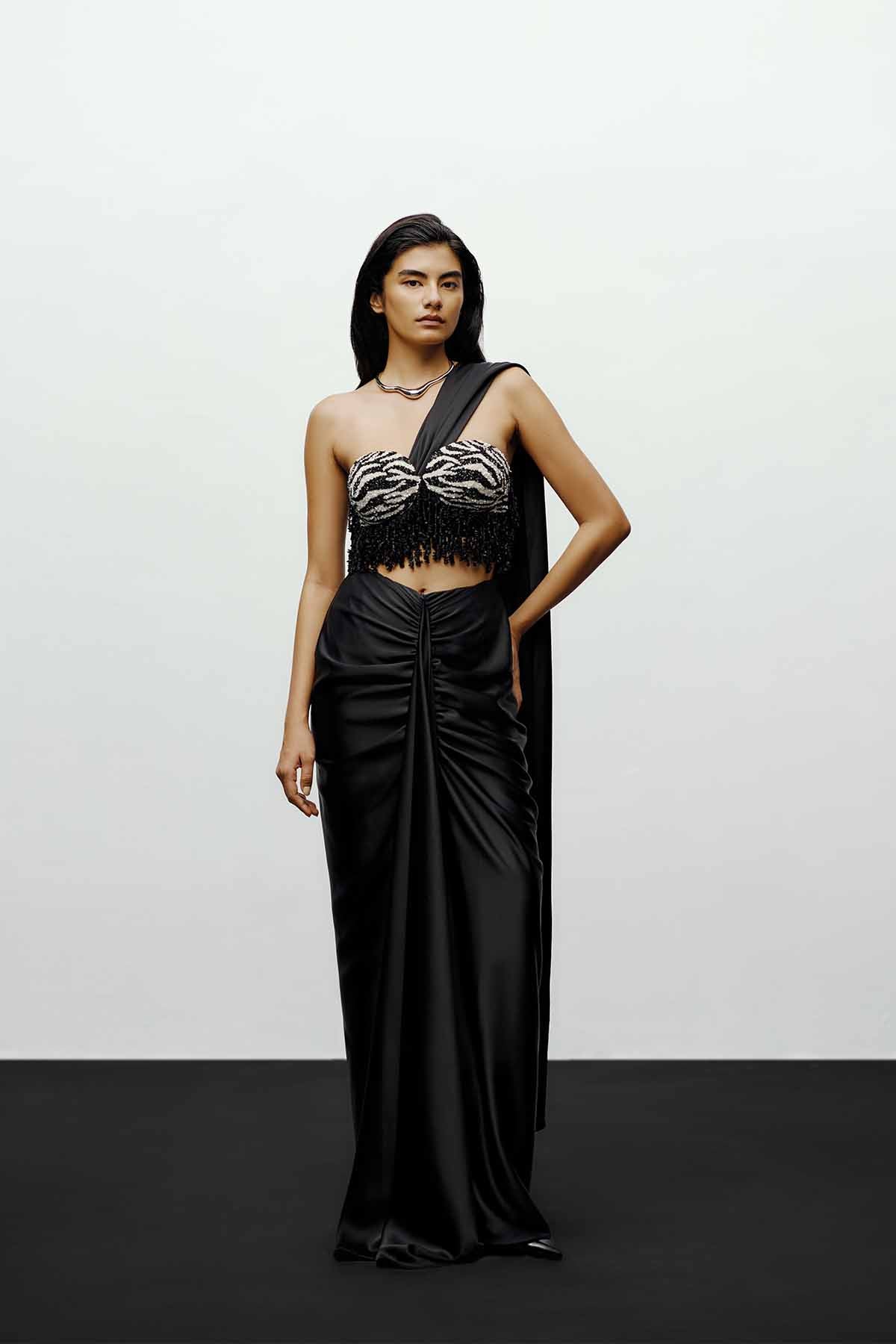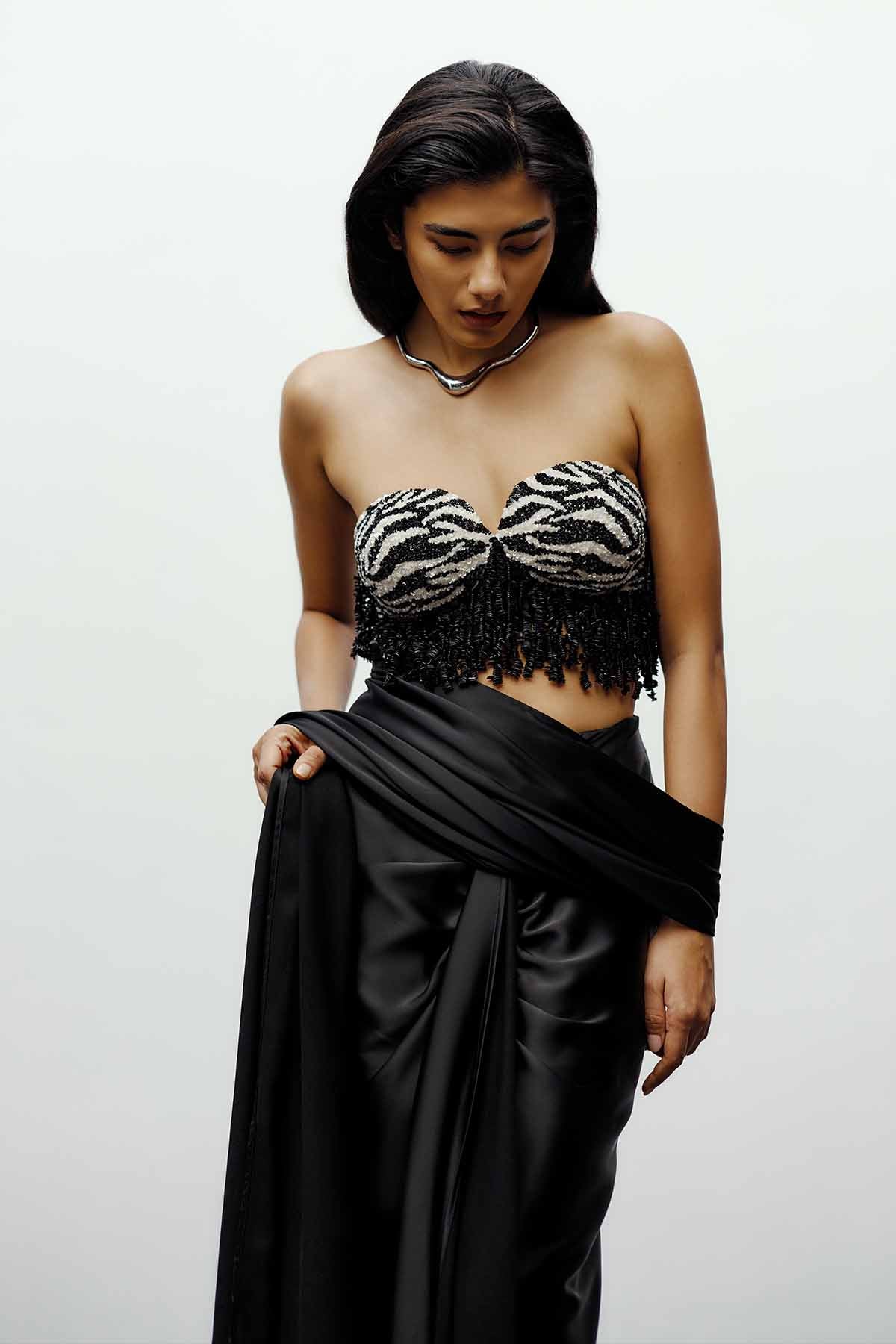 Make a bold statement with the 431-88 structured top, a piece that fuses craftsmanship with contemporary allure. Expertly hand-embellished with intricate beadwork tassels in a striking zebra pattern, this top redefines modern glamour. Designed with a structured, sweetheart neckline and subtle plunge detail, it sculpts and accentuates the silhouette. The hemline features fringe bead tassels, adding fluid movement and a touch of drama with every step.