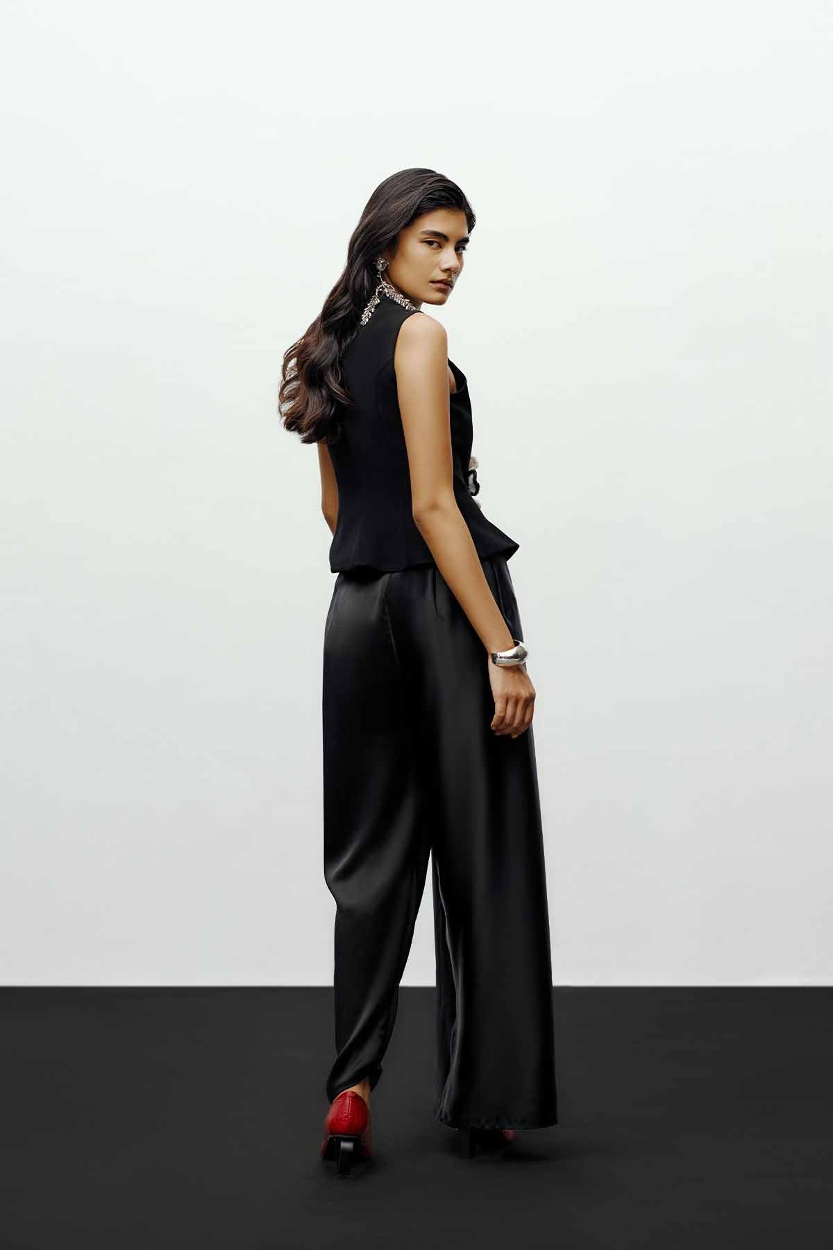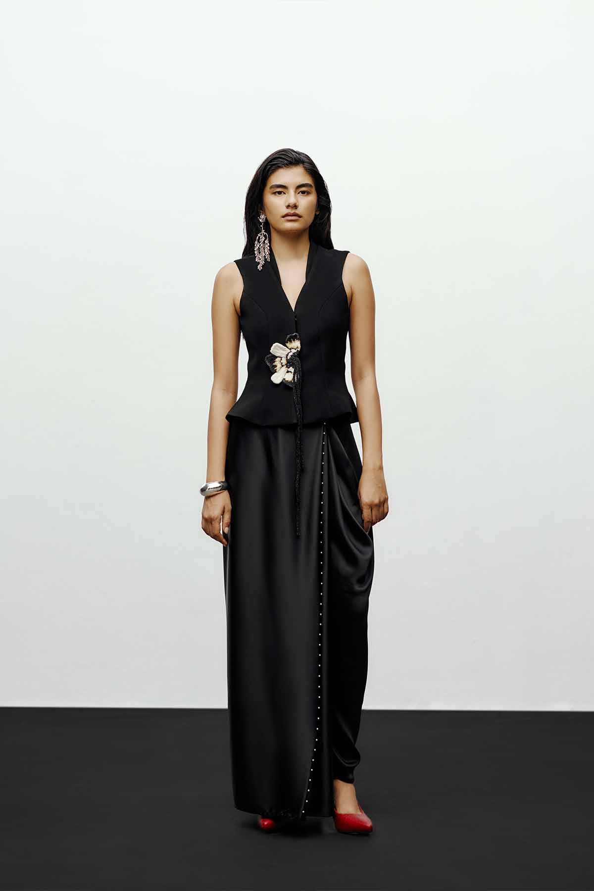 Sculptural elegance meets artisanal detailing in the 431-88 embellished black structured jacket. Tailored to perfection, this sleeveless piece features a clean, contoured silhouette that flatters the form while exuding quiet strength and sophistication. At its center, a hand-beaded floral applique in soft ivory, beige, and black tones adds a touch of intricate artistry—each bead meticulously placed to create a three-dimensional flower. The subtle shaping at the hem enhances movement, maintaining a balance between precision and fluidity.