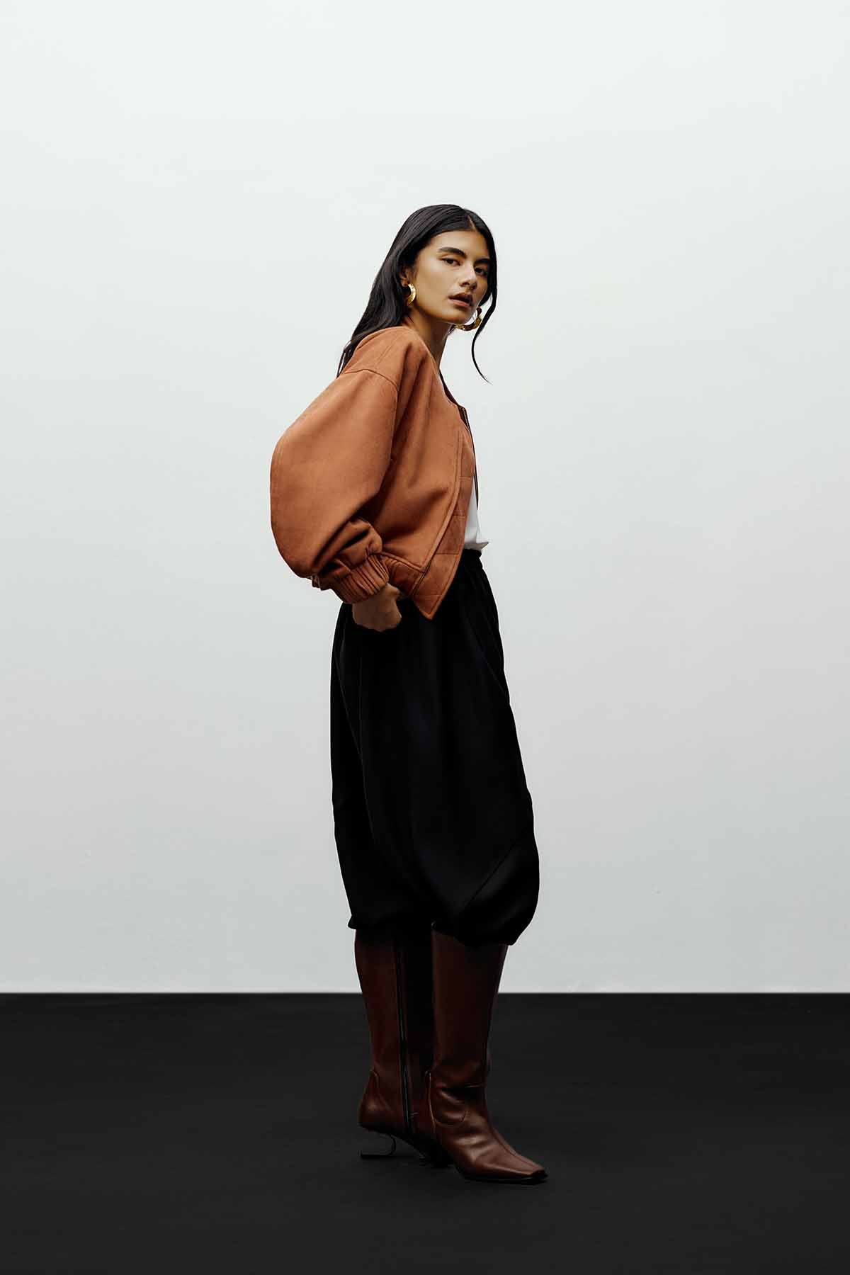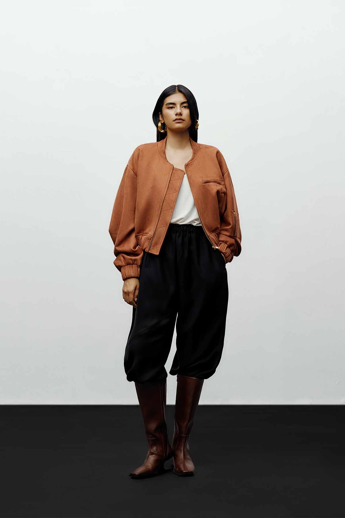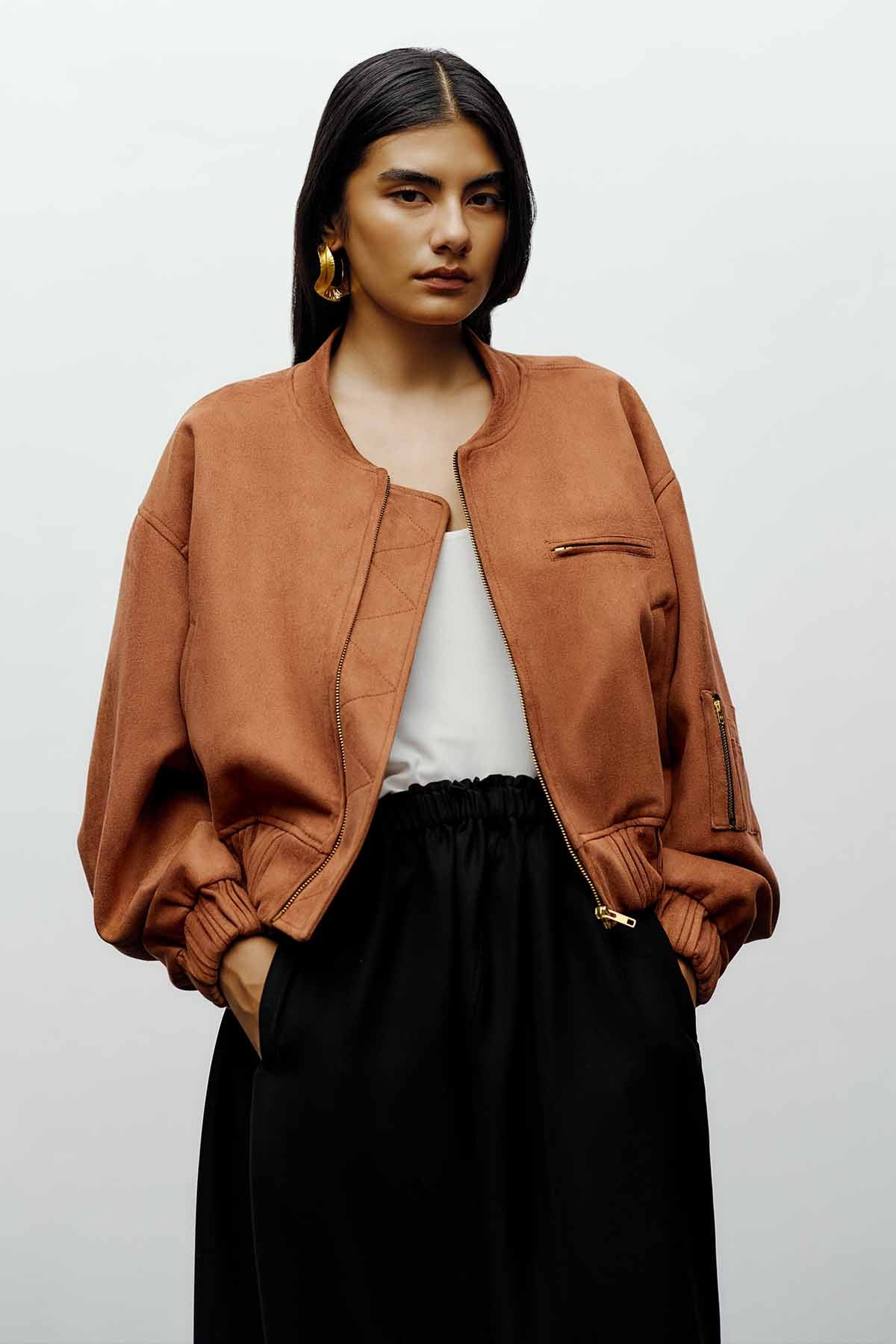 The  suede bomber jacket in brown  redefines utilitarian minimalism with a refined, sculptural edge. Crafted from soft faux suede, this jacket offers a structured yet fluid silhouette, creating a perfect contrast against the brand’s signature draped separates. The boxy fit, exaggerated sleeves, and gold-tone zipper details lend a touch of modern luxury while maintaining effortless wearability. Layered over bold hues or monochrome foundations, this jacket adds dimension, texture, and quiet confidence to any look — a true 431-88 essential for transitional dressing.