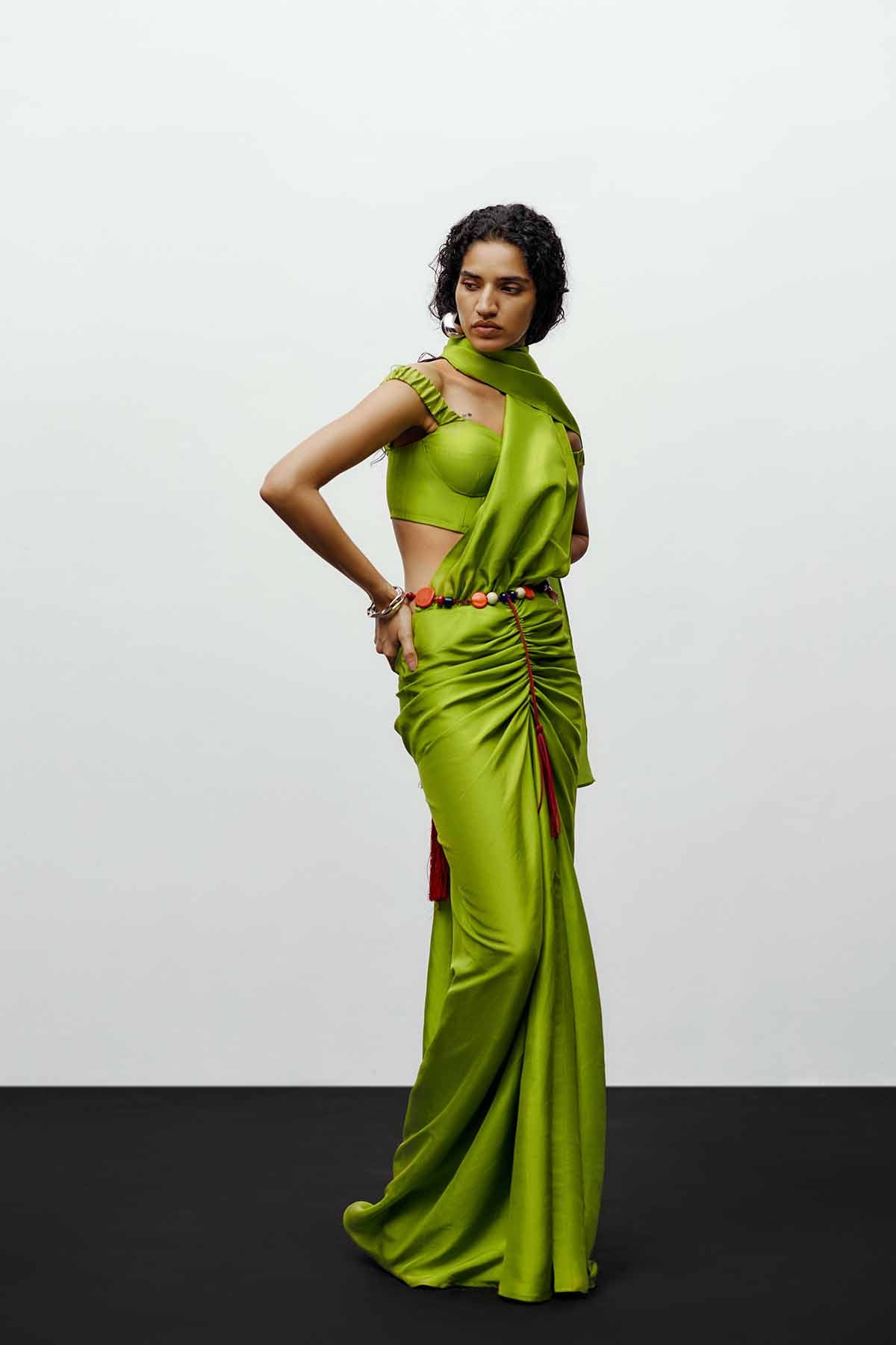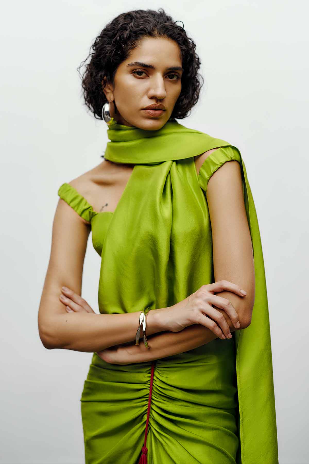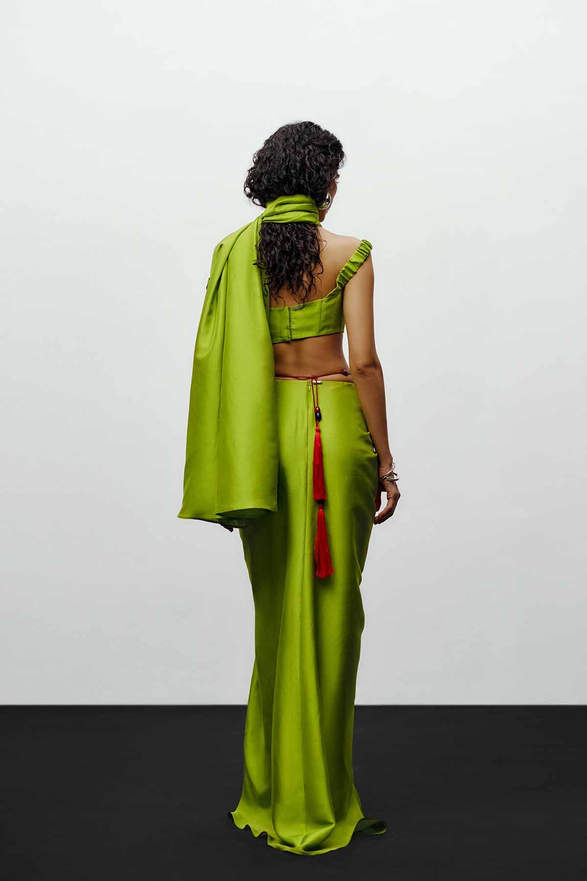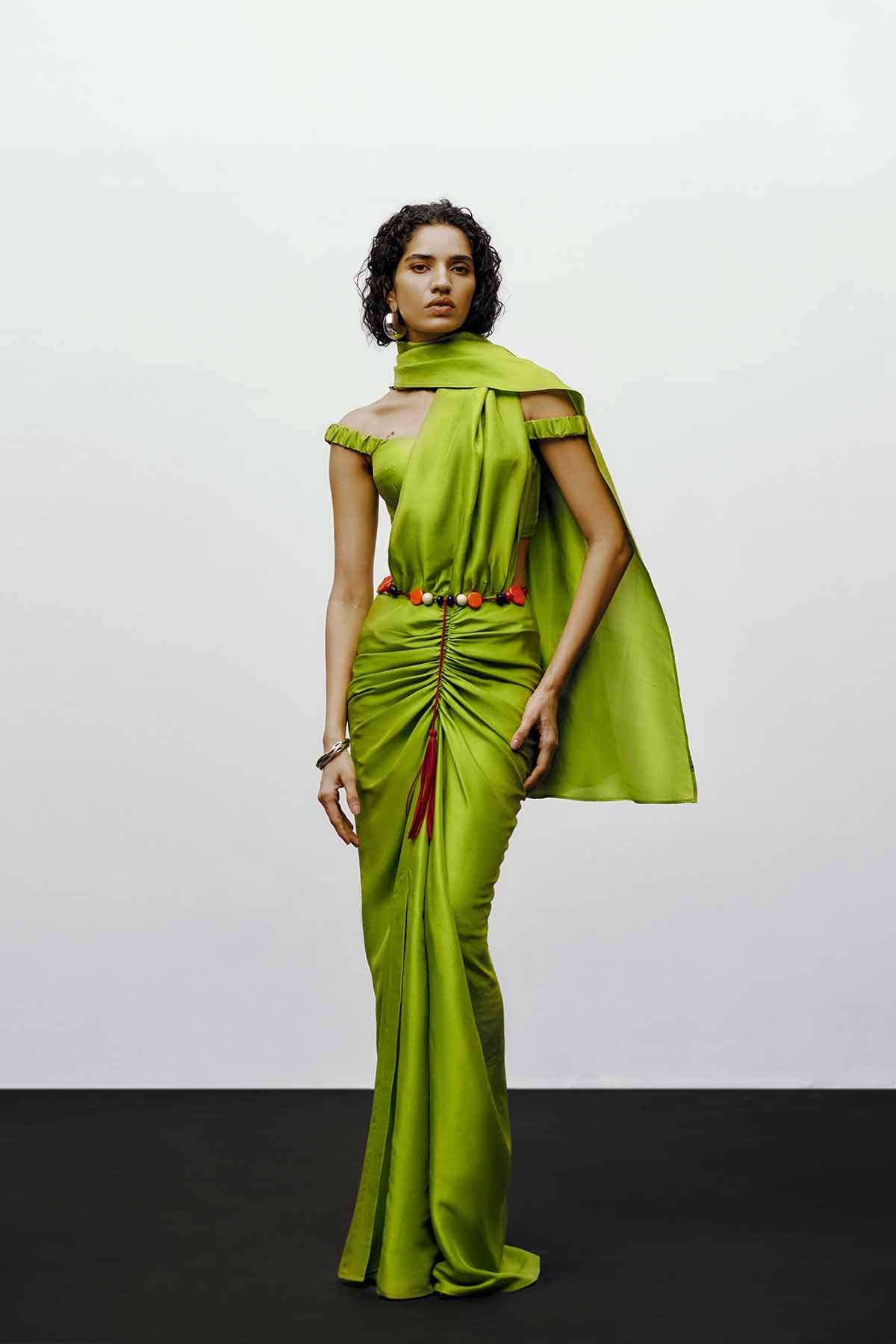 The  off-shoulder blouse in lime green  embodies the brand’s signature balance of sculptural elegance and contemporary ease. Crafted from lustrous silk-blend fabric, the off-shoulder blouse adds a touch of sensuality, contrasted beautifully by the bold, structured pleats. Elasticated sleeve for easy moment