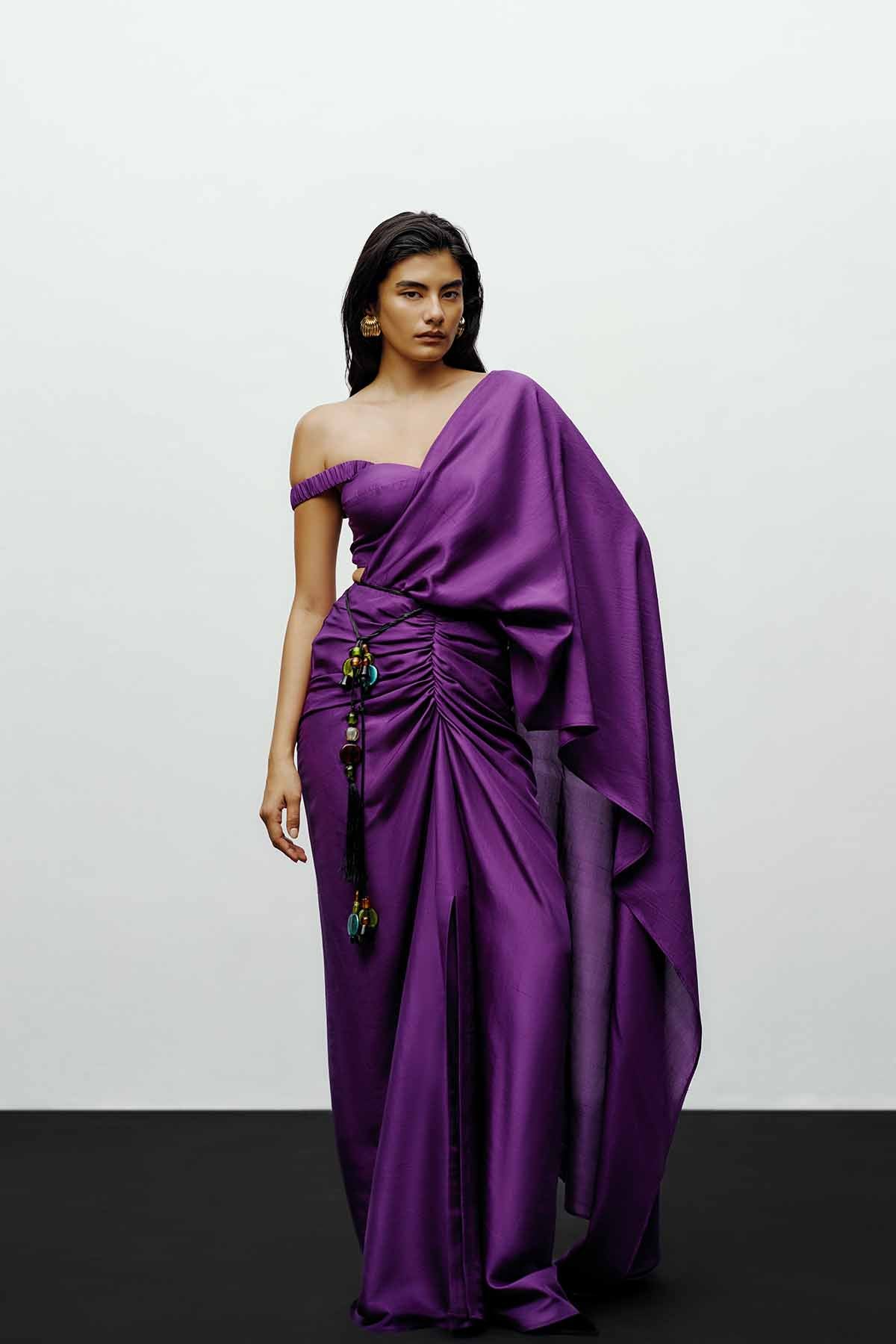 The  off-shoulder blouse in deep purple embodies the brand’s signature balance of sculptural elegance and contemporary ease. Crafted from lustrous silk-blend fabric, the off-shoulder blouse adds a touch of sensuality, contrasted beautifully by the bold, structured pleats. Elasticated sleeve for easy moment.