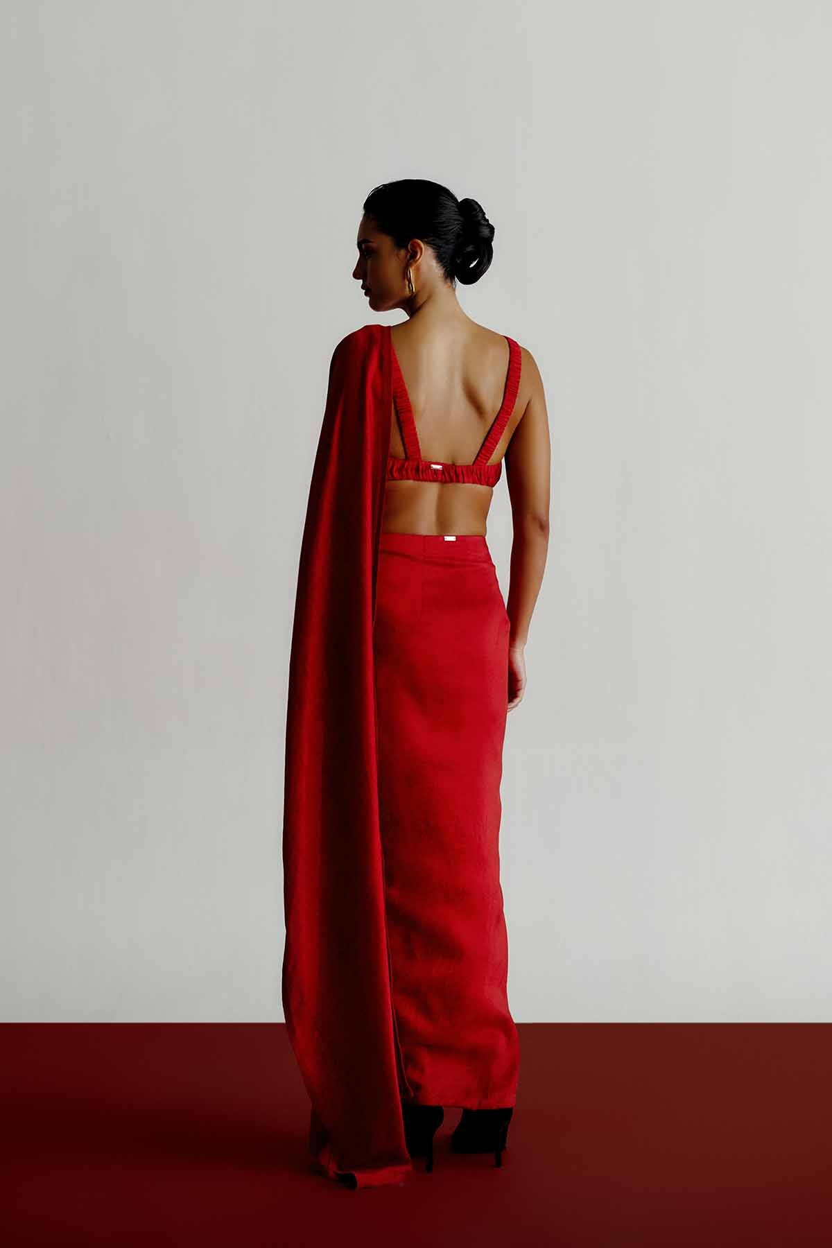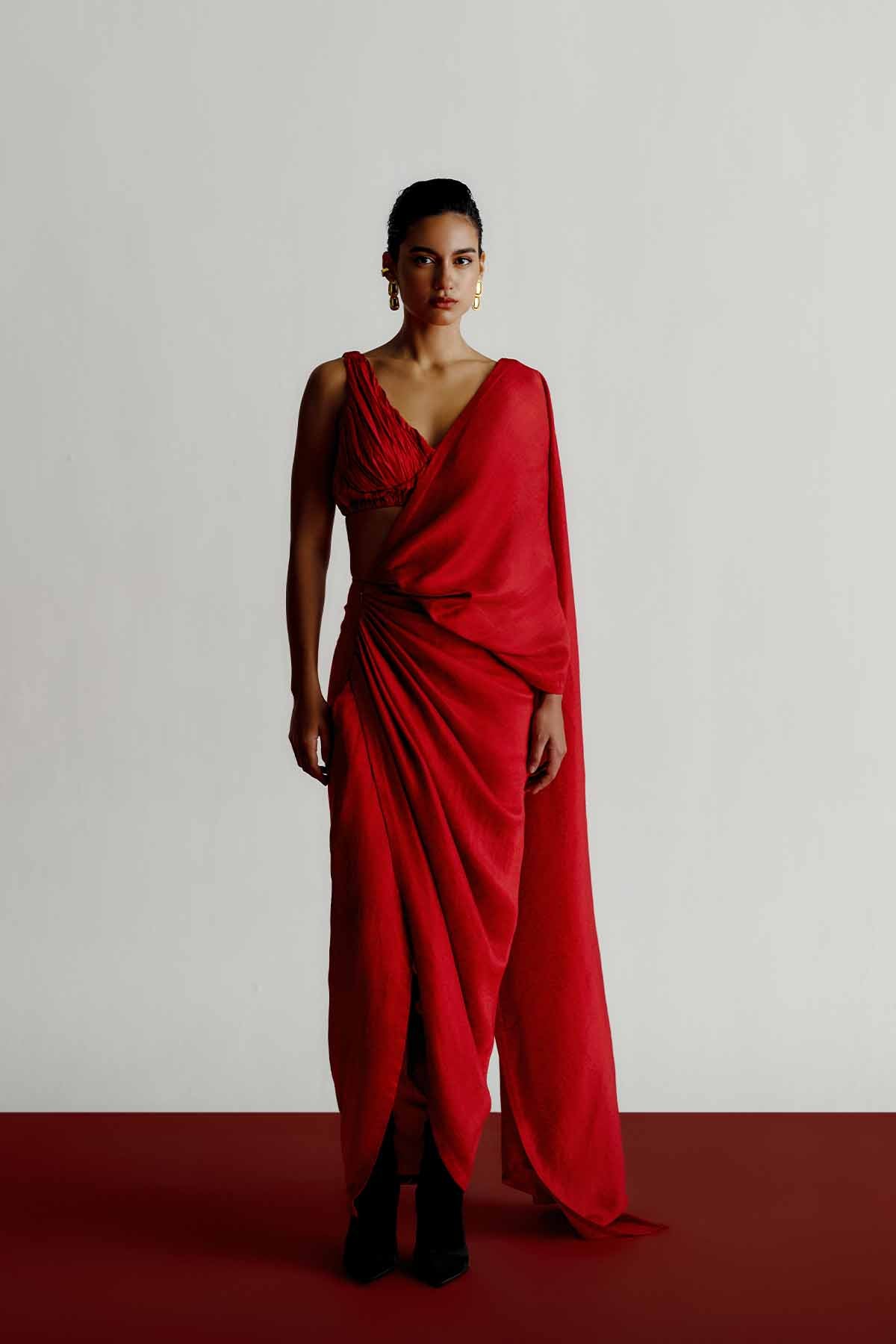 The dew sari redefines modern elegance through fluid structure and bold simplicity. Crafted from luminous silk with a subtle print, the drape accentuates natural movement while maintaining architectural precision. The vibrant red hue embodies the brand’s contemporary edge, refreshing, refined, and effortlessly sophisticated. This sari is pre-draped for ease of wear and paired with a tonal blouse to highlight its sculptural fall. Designed for the woman who moves seamlessly between tradition and modernity, it merges timeless craftsmanship with a progressive silhouette.