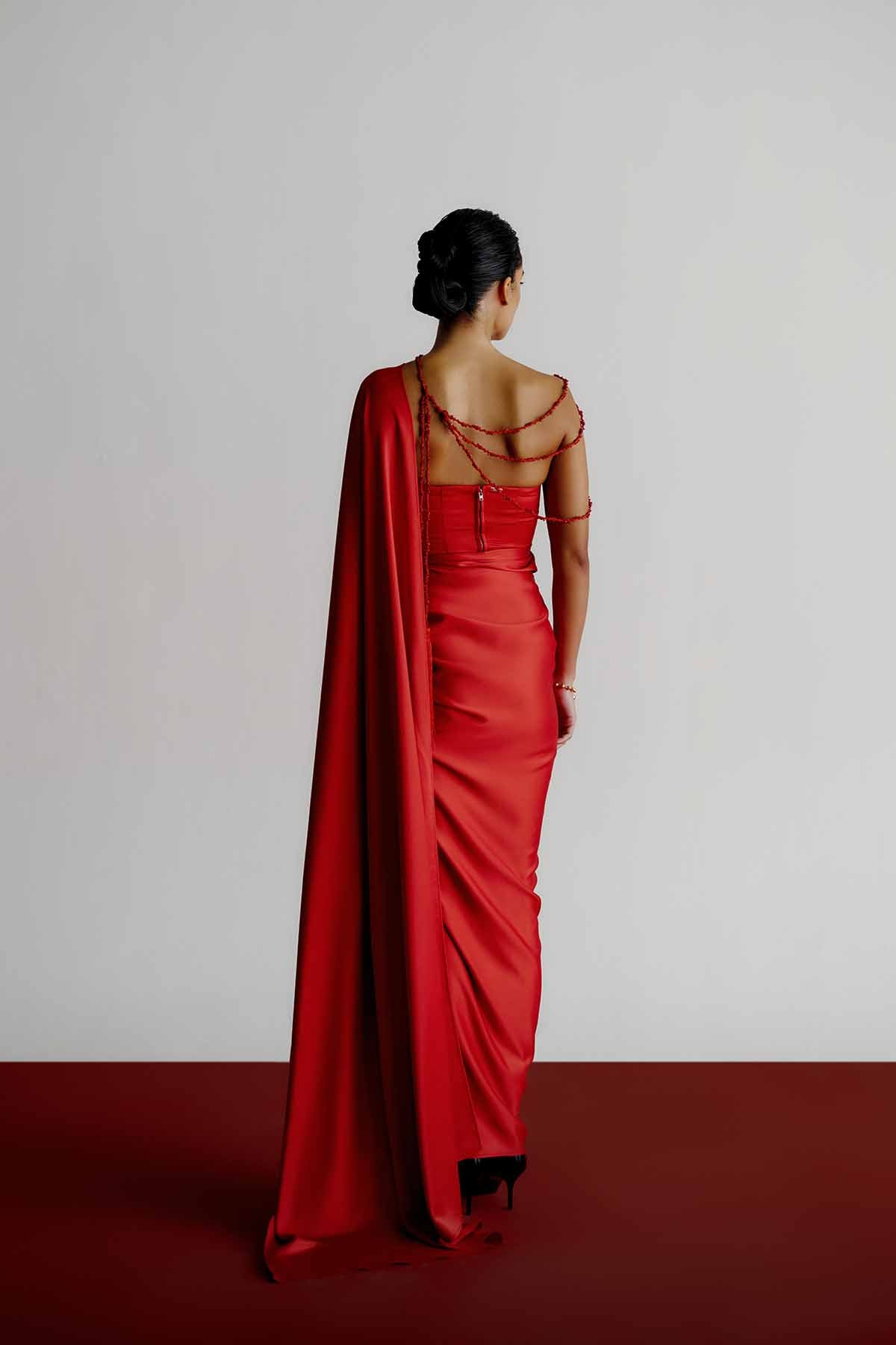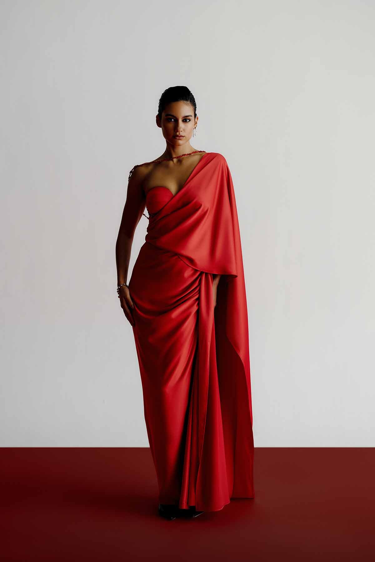 A statement in sculptural draping and liquid elegance, kaai sari redefines traditional femininity with a contemporary edge. Crafted from luxurious crepe, the sari flows seamlessly to create a fluid silhouette that flatters every curve. The one-shoulder drape lends a bold architectural structure, perfectly balanced by the soft pleats cascading along the side. Paired with a structured bustier blouse, this look embodies modern glamour, minimal yet striking.