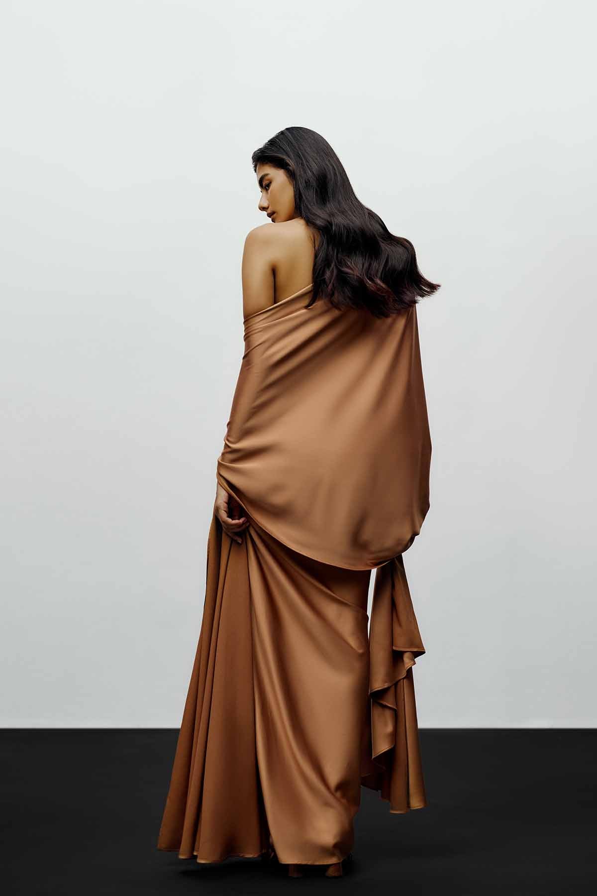 The fitted bodice includes built-in boning for shape and support, while the subtle black chain detailing under the bust adds a touch of modern edge and luxury. A sleek back zipper ensures a secure and seamless fit.