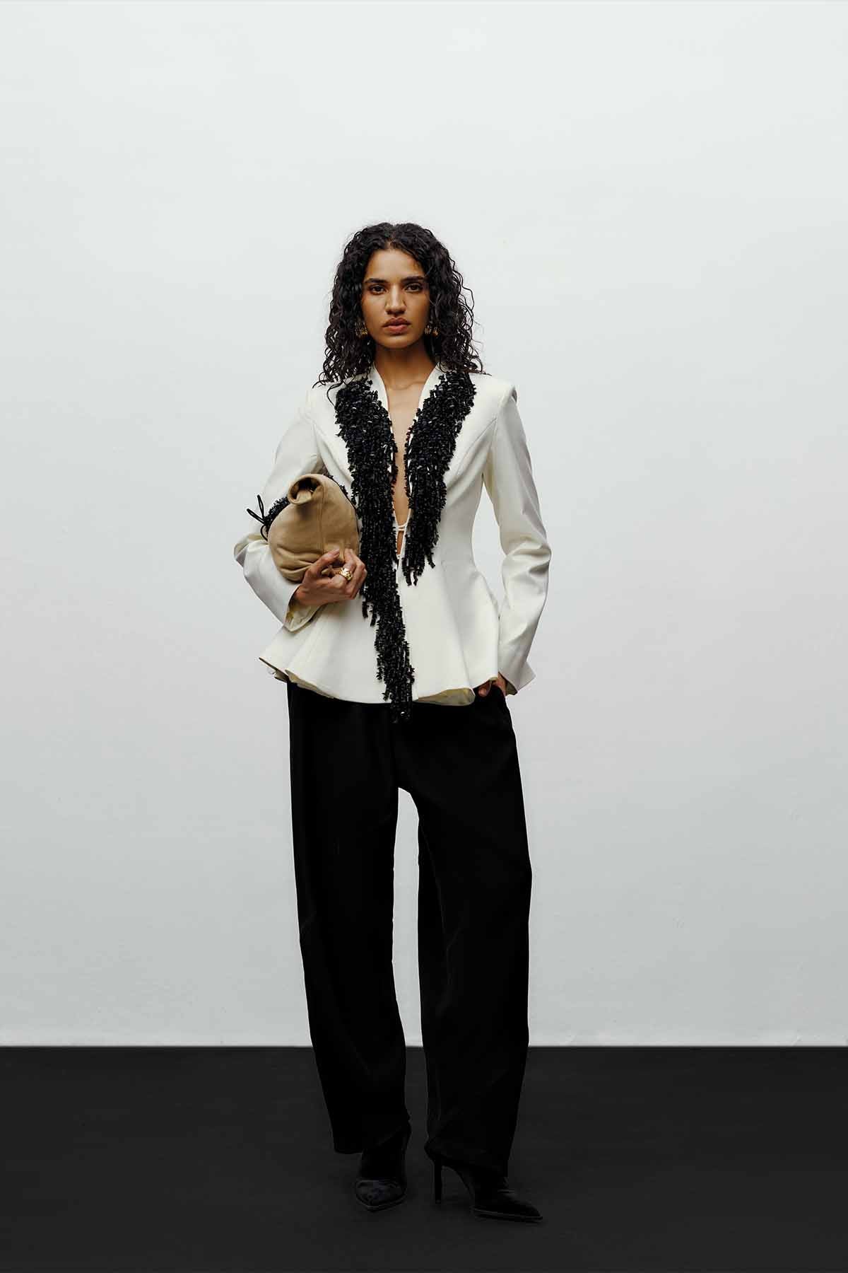 Sculptural elegance meets tactile artistry in the 431-88 embellished peplum jacket. This structured ivory jacket is meticulously tailored to accentuate form, featuring a cinched waist and flared peplum hem that creates an effortlessly feminine silhouette. A striking hand-embroidered black beaded embellishment tassels down the front, adding depth, texture, and movement to the minimalist design. The open plunge neckline introduces a sense of fluid sensuality, perfectly balancing the jacket’s sharp architectural lines.