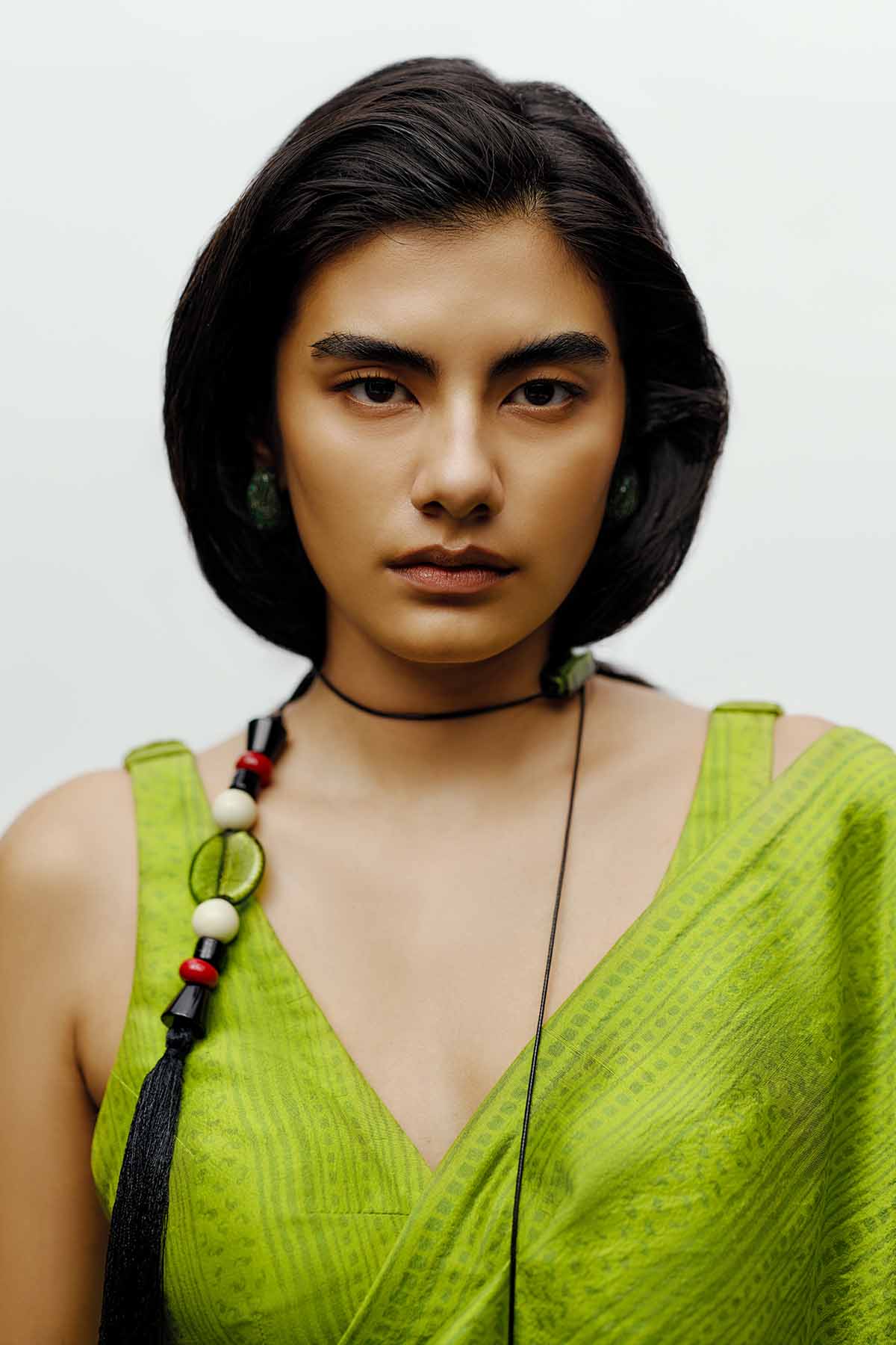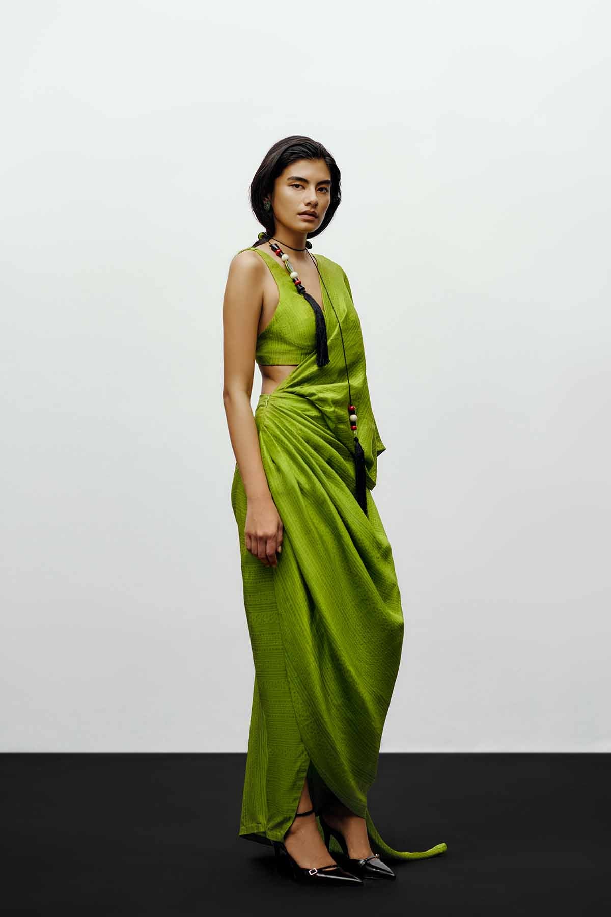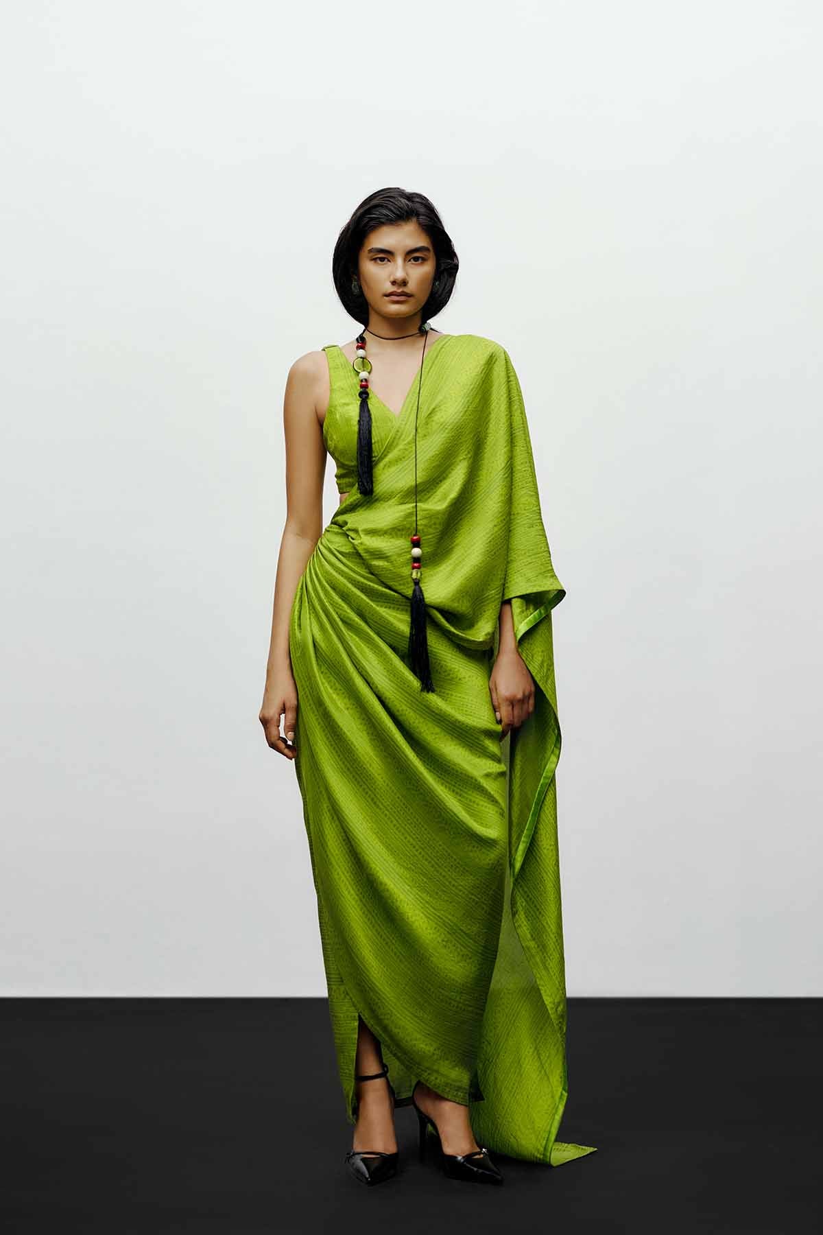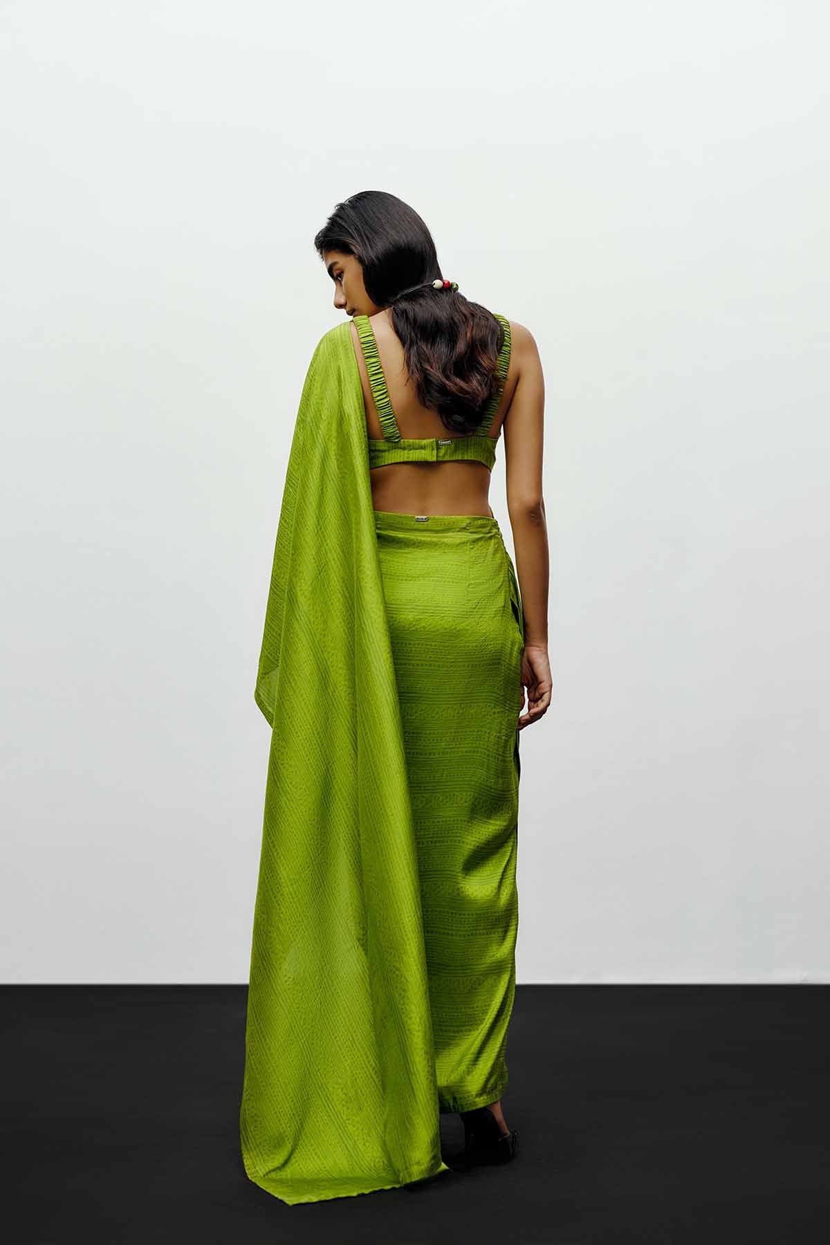 The 431-88 draped silk sari in lime green redefines modern elegance through fluid structure and bold simplicity. Crafted from luminous silk with a subtle print , the drape accentuates natural movement while maintaining architectural precision. The vibrant lime hue embodies the brand’s contemporary edge — refreshing, refined, and effortlessly sophisticated. This sari is pre-draped for ease of wear and paired with a minimal inner layer to highlight its sculptural fall. Designed for the woman who moves seamlessly between tradition and modernity, it merges timeless craftsmanship with a progressive silhouette