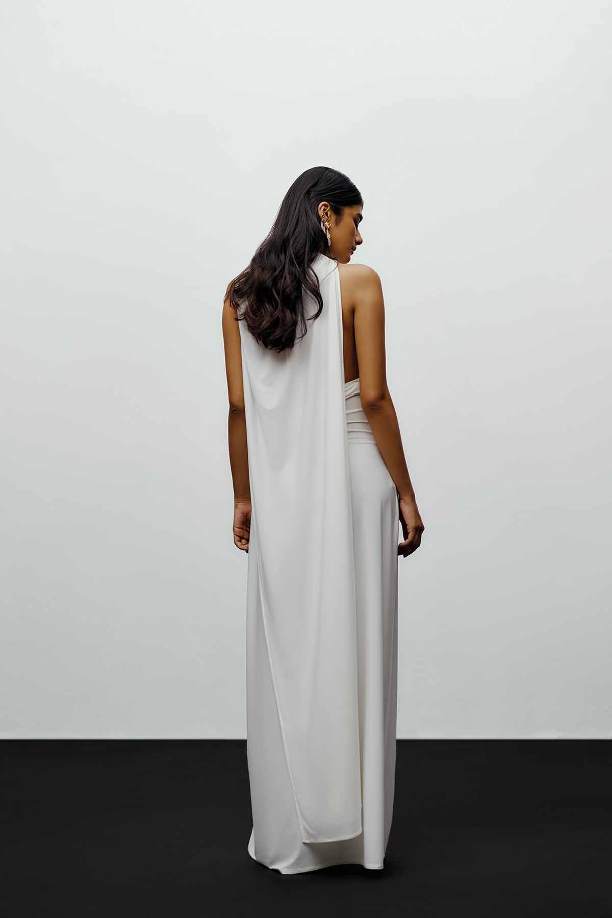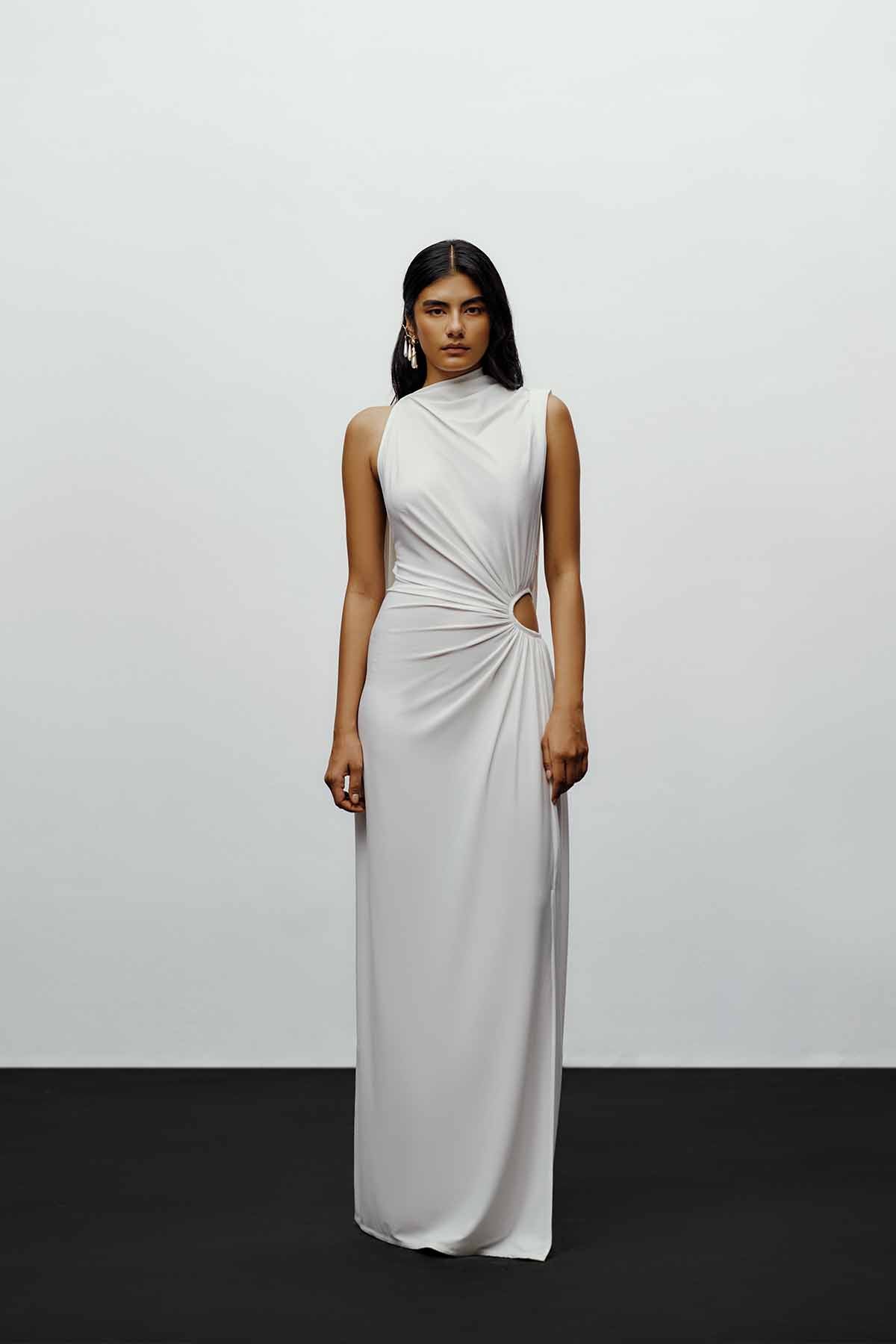 Sleek, sculptural, and timeless — the 431-88 draped cut-out  dress embodies understated sophistication through precise tailoring and fluid draping. Crafted from a soft, stretch fabric that skims the body, this dress features a high neckline and asymmetric side cut-out, creating a modern interplay of conceal and reveal. The delicate drape gathers at the waist, enhancing natural contours while maintaining effortless movement. Its floor-length silhouette exudes quiet drama, making it ideal for both contemporary eveningwear and elevated resort occasions