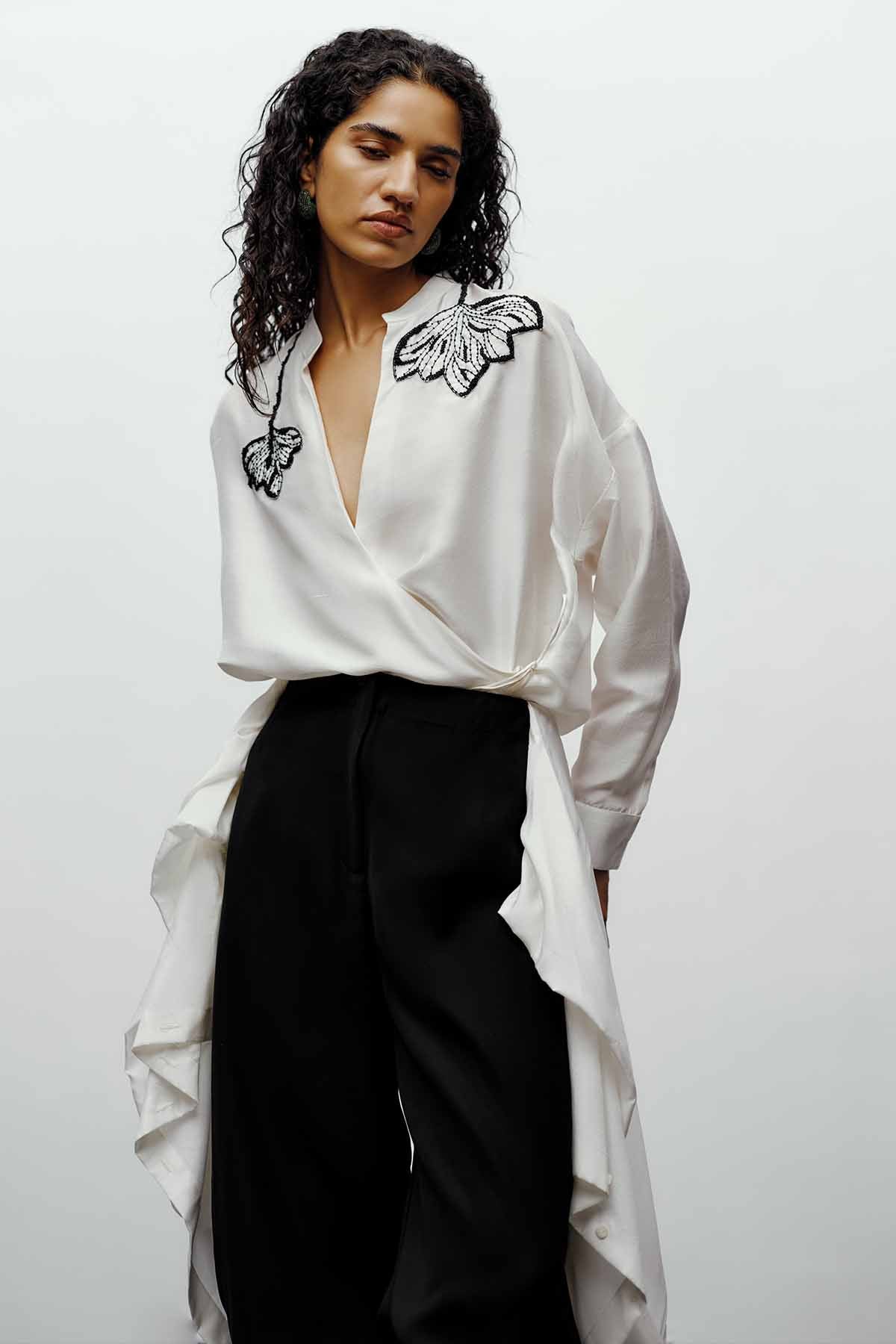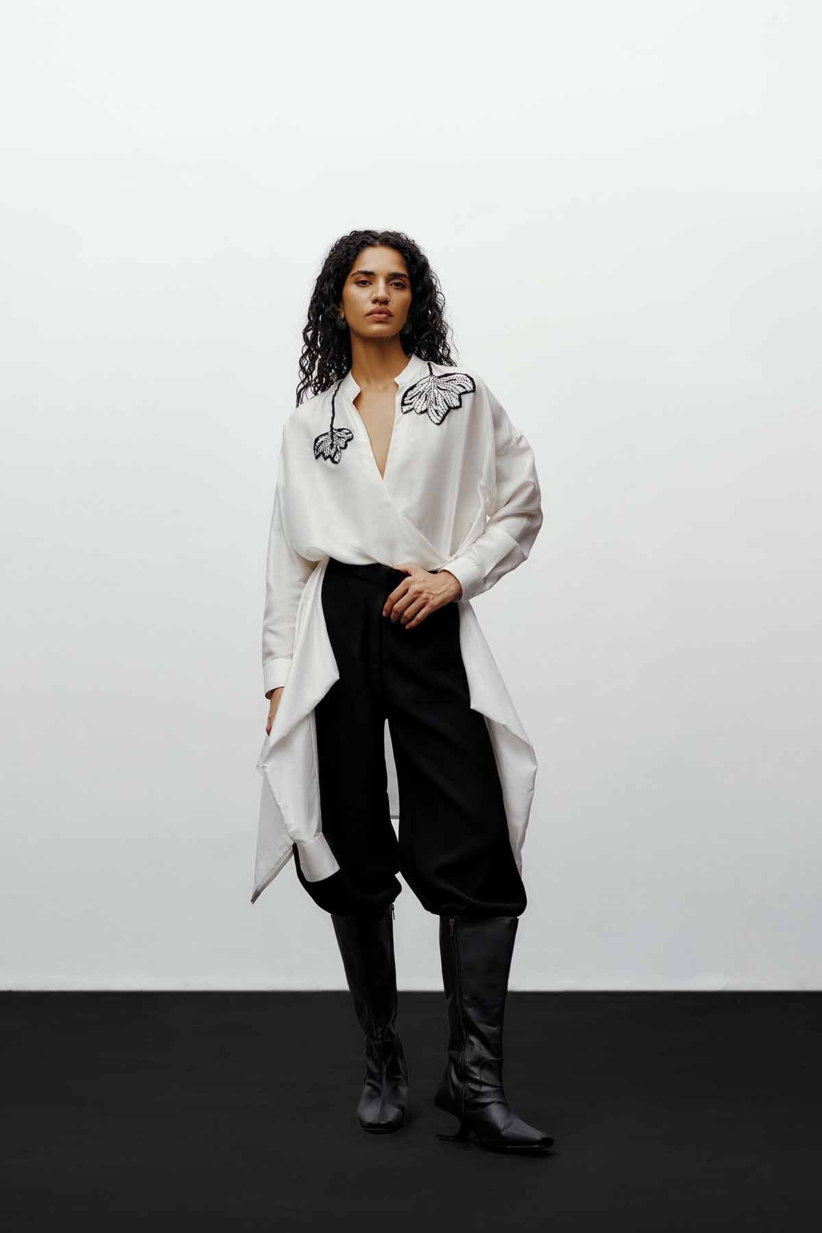 The 431-88 structured draped pants merge architectural precision with fluid tailoring. Crafted in rich black fabric, the silhouette balances volume and structure — with a sculpted, cocoon-like shape that tapers at the hem for a clean, modern finish. The high-waisted fit offers a flattering frame, while soft pleats and curved seams create natural movement through the leg. The pants have a mock shirt tie-up detail which makes it looks like a complete look already . Finished with a cropped length that pairs effortlessly with boots or heels, these pants redefine everyday elegance with a contemporary edge.