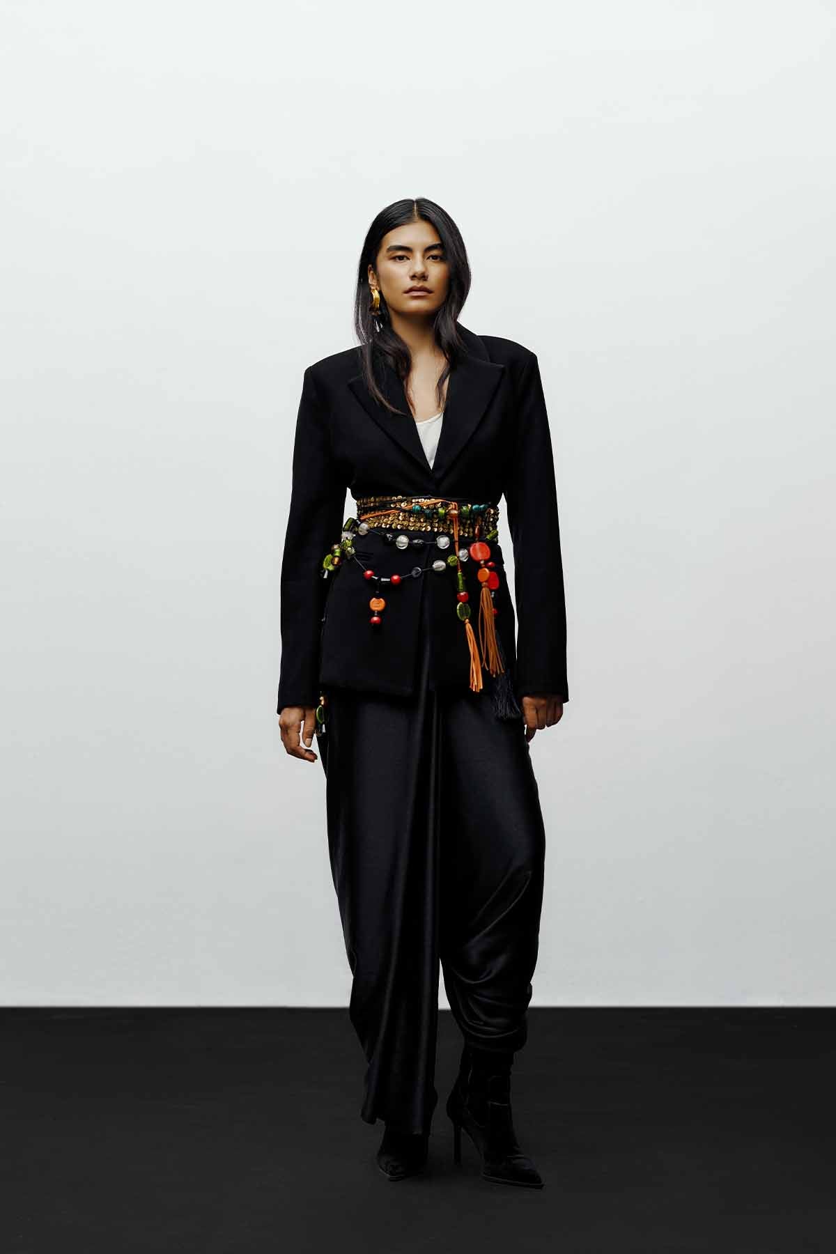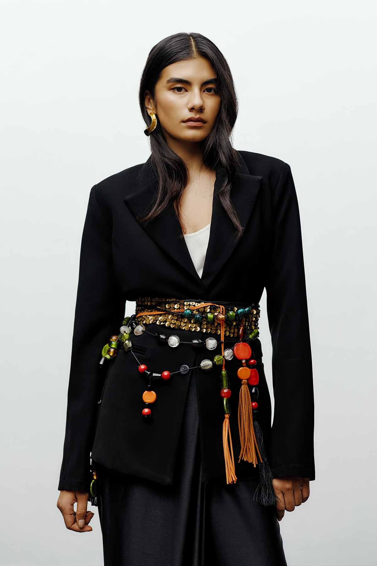 Bold. Timeless. Effortlessly refined. The 431-88 structured black blazer is a modern reinterpretation of classic tailoring — blending sleek minimalism with statement sophistication. Crafted in a sharp, structured silhouette, this blazer features a defined shoulder line, notched lapels, and a clean single-breasted front that exudes quiet power. Designed to move seamlessly from day to night, it’s cut from a premium fabric that drapes beautifully and pairs flawlessly with everything from relaxed separates to statement belts and accessories.