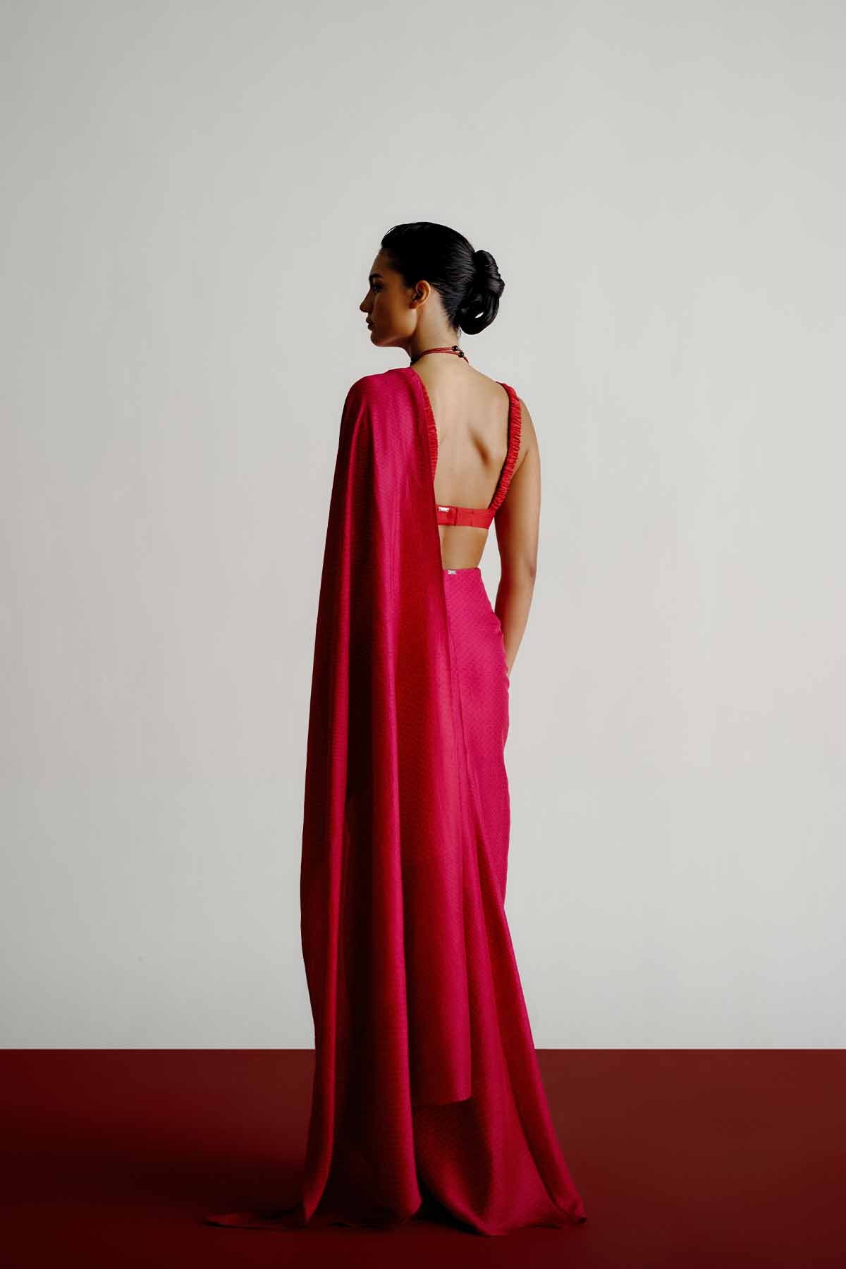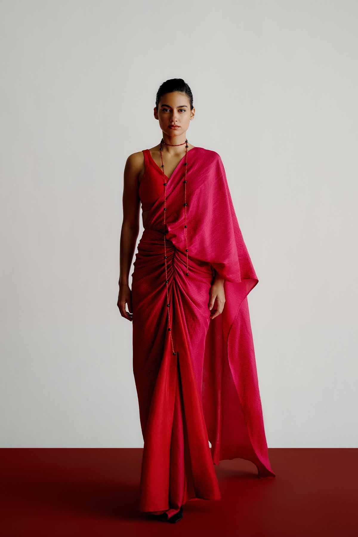 The Soho Sari embodies the brand’s signature balance of sculptural elegance and contemporary ease. Crafted from lustrous silk-blend fabric, the pre-draped silhouette features a gathered front that flatters the waist and flows seamlessly into a fluid drape. A different print in the front godet makes the drape even more attractive.