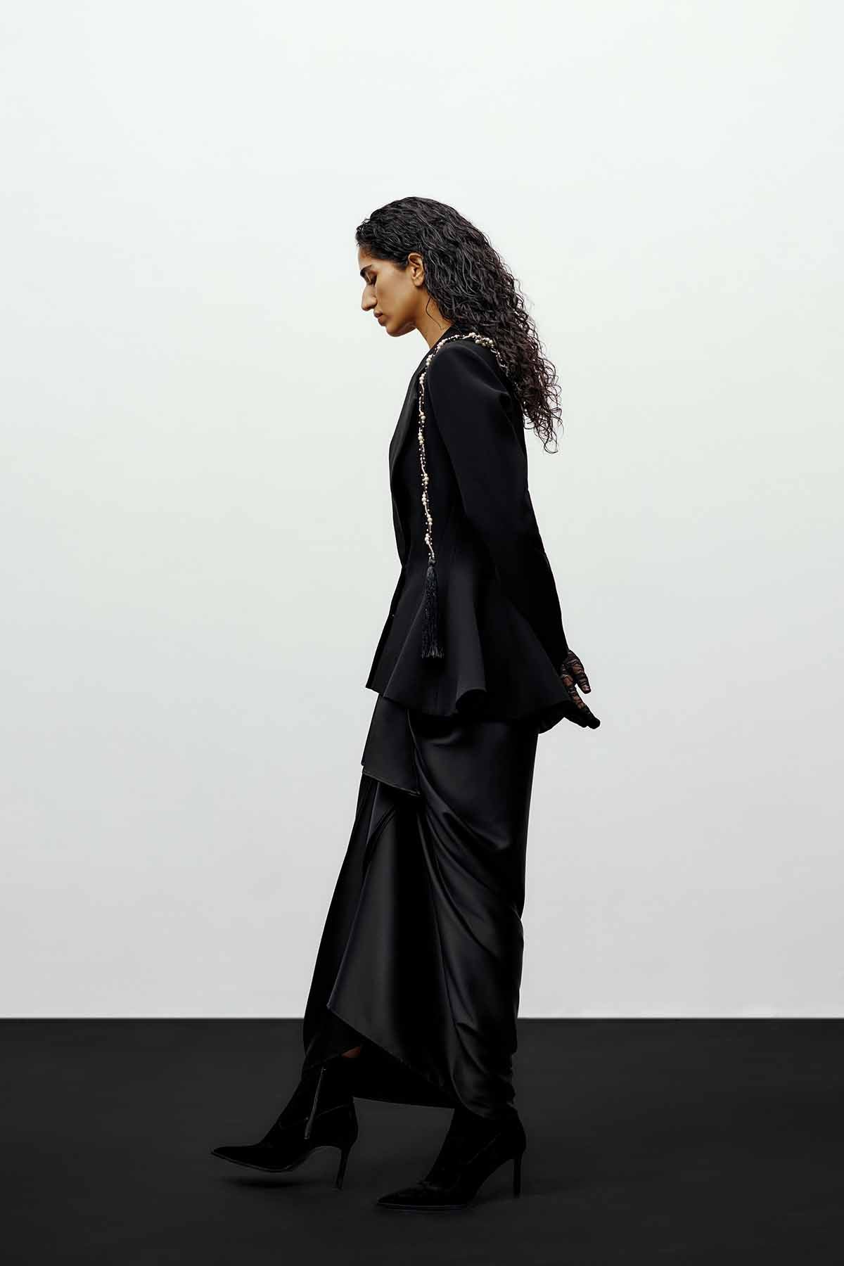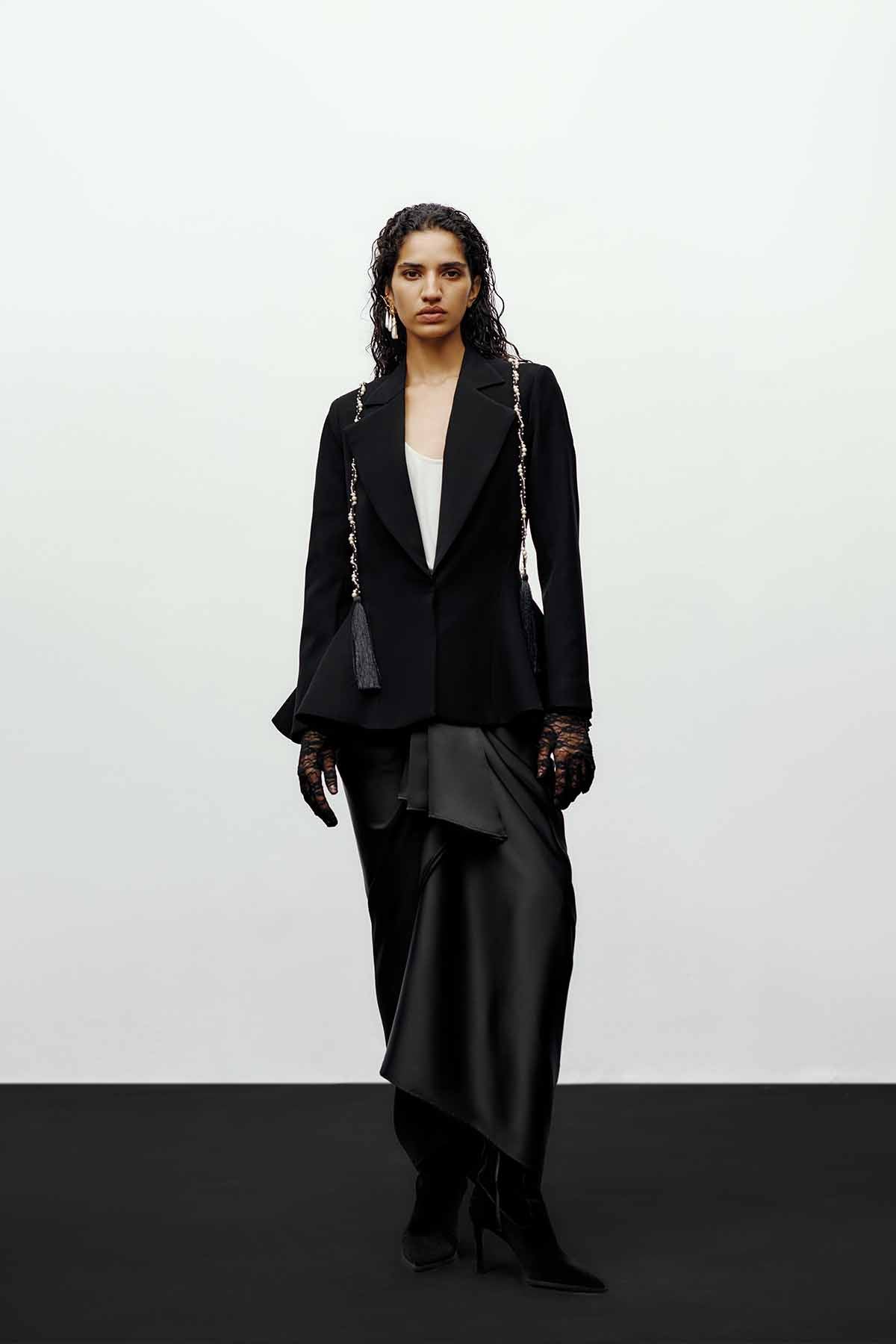 The embellished structured blazer in black redefines power dressing through a lens of sculptural femininity. Expertly tailored to contour the body, the blazer features sharp shoulders, a nipped-in waist, and a dramatic flared hem that creates a bold yet fluid silhouette. Hand-embellished pearl and tassel detailing along the shoulders adds a touch of opulence — merging precision tailoring with signature 431-88 artistry. A versatile statement piece, it transitions seamlessly from formal occasions to evening wear, embodying strength and sophistication in equal measure.