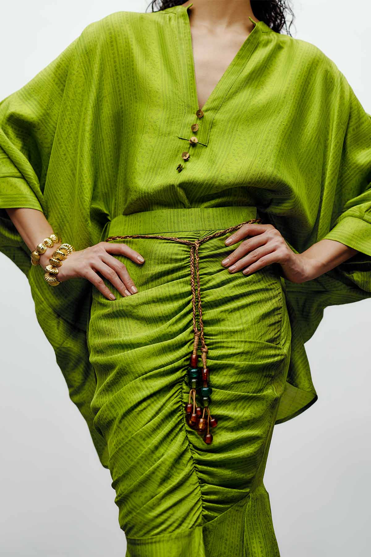 Striking the perfect balance between fluidity and form, the zin shirt redefines contemporary elegance. The free-flowing shirt features exaggerated sleeves and a relaxed silhouettein heather print that drapes effortlessly, creating a sense of movement and ease. Designed for the modern muse who values both comfort and individuality, this look transitions seamlessly from day events to evening occasions.