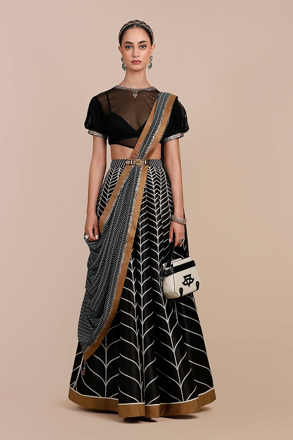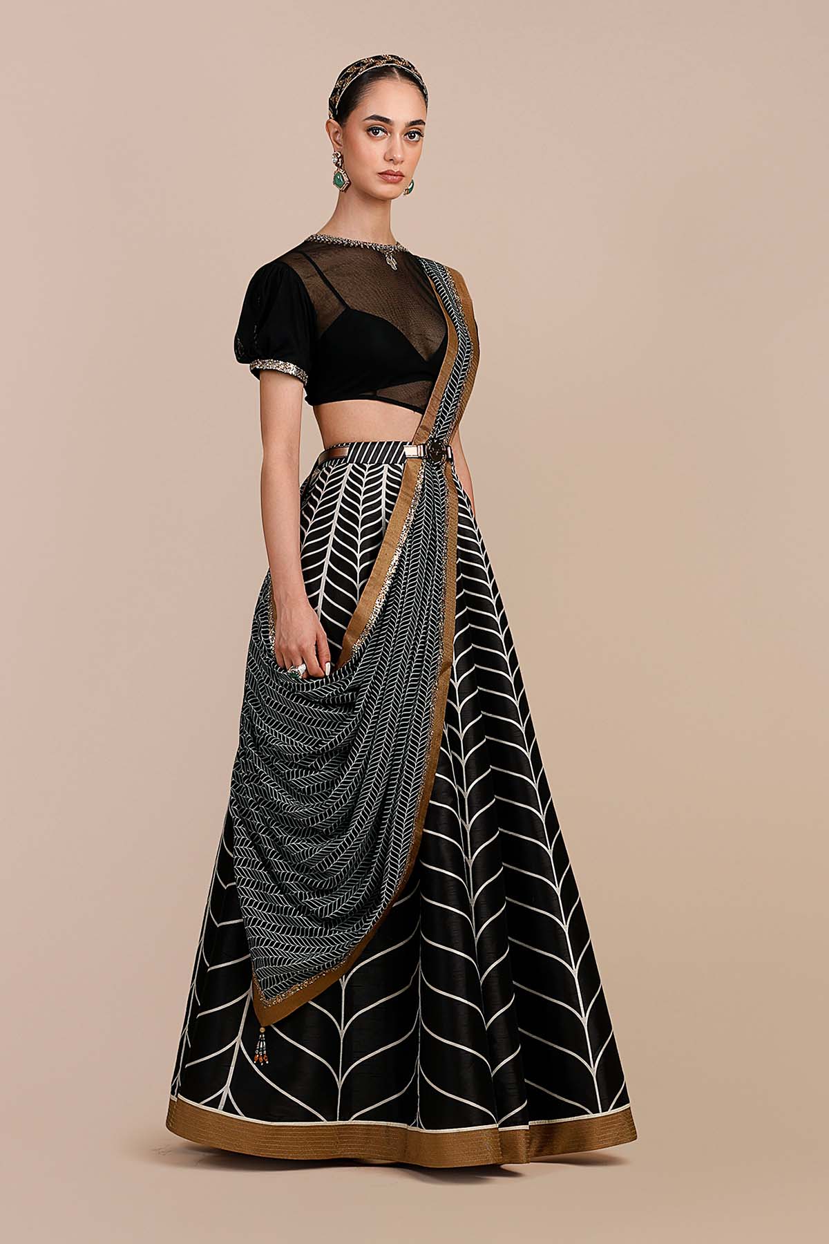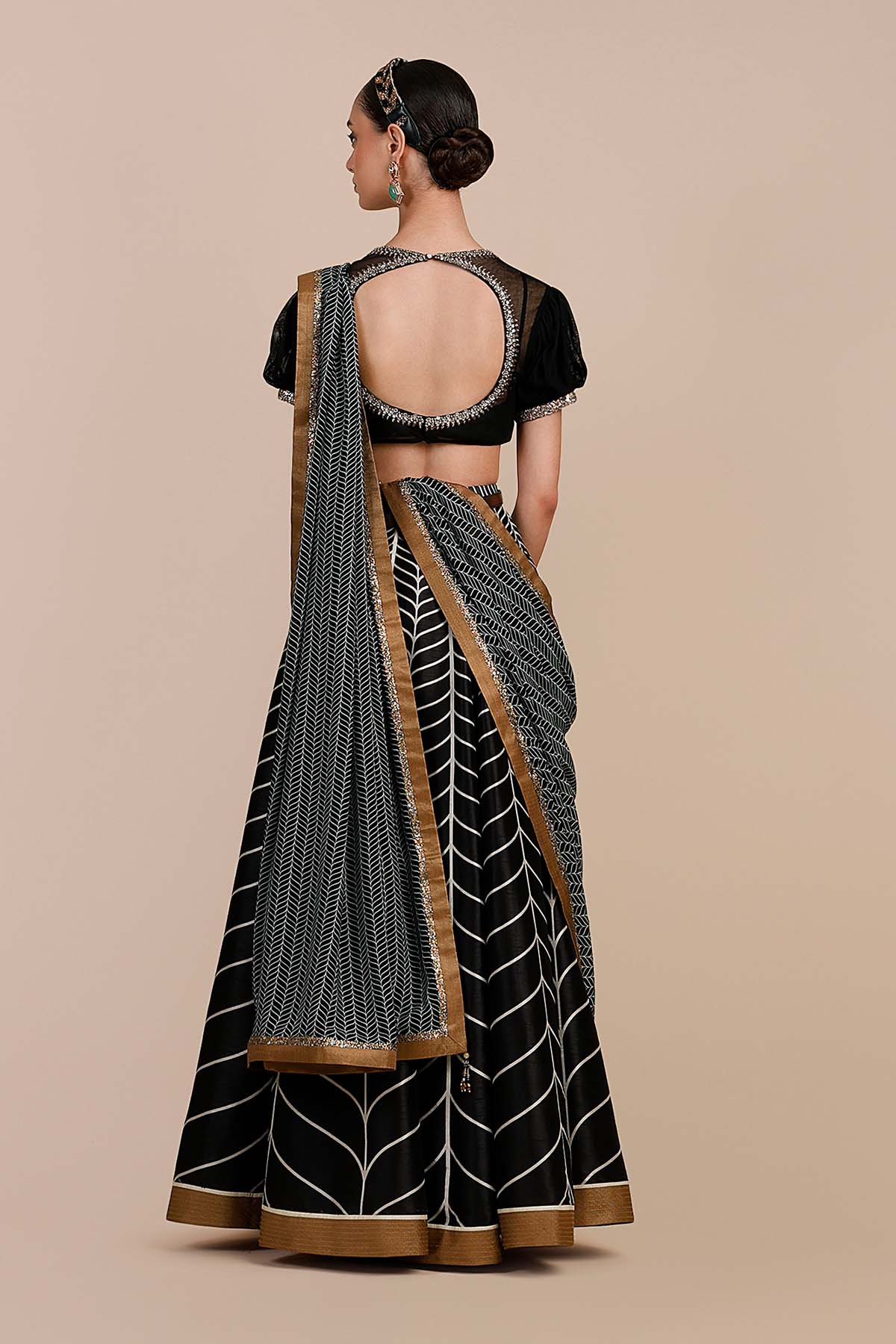 The stole is accented with a metallic gold gota border and features Valaya’s signature antique metallic assorted embroidery along the border, finished with beaded tassel details.