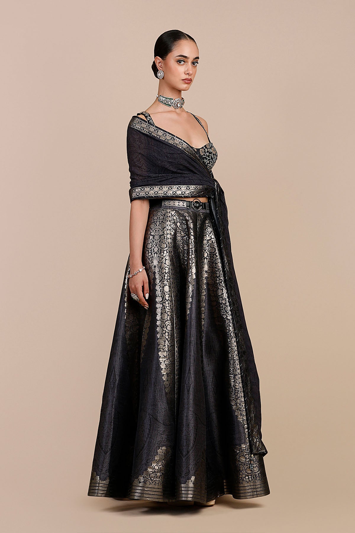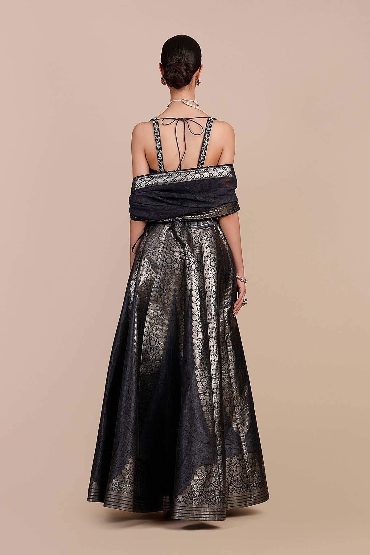 The sheer georgette stole features a jamawar print enhanced with metallic foil detailing. The border is adorned with intricate metallic foiling with stripe piping and beaded tassels details.