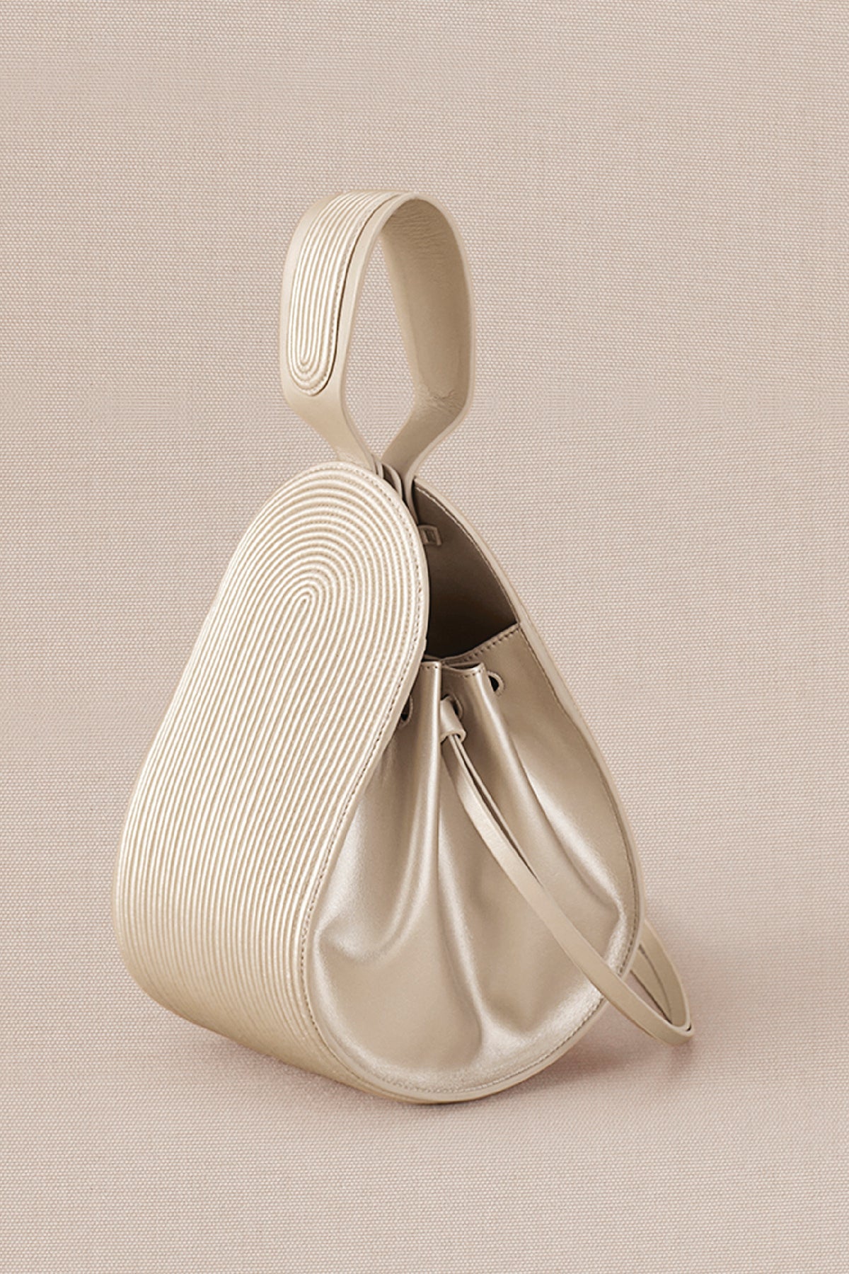 Corded metallic pearl bucket bag in faux leather with corded handle detail. Nésara in the perfect festive flavour.