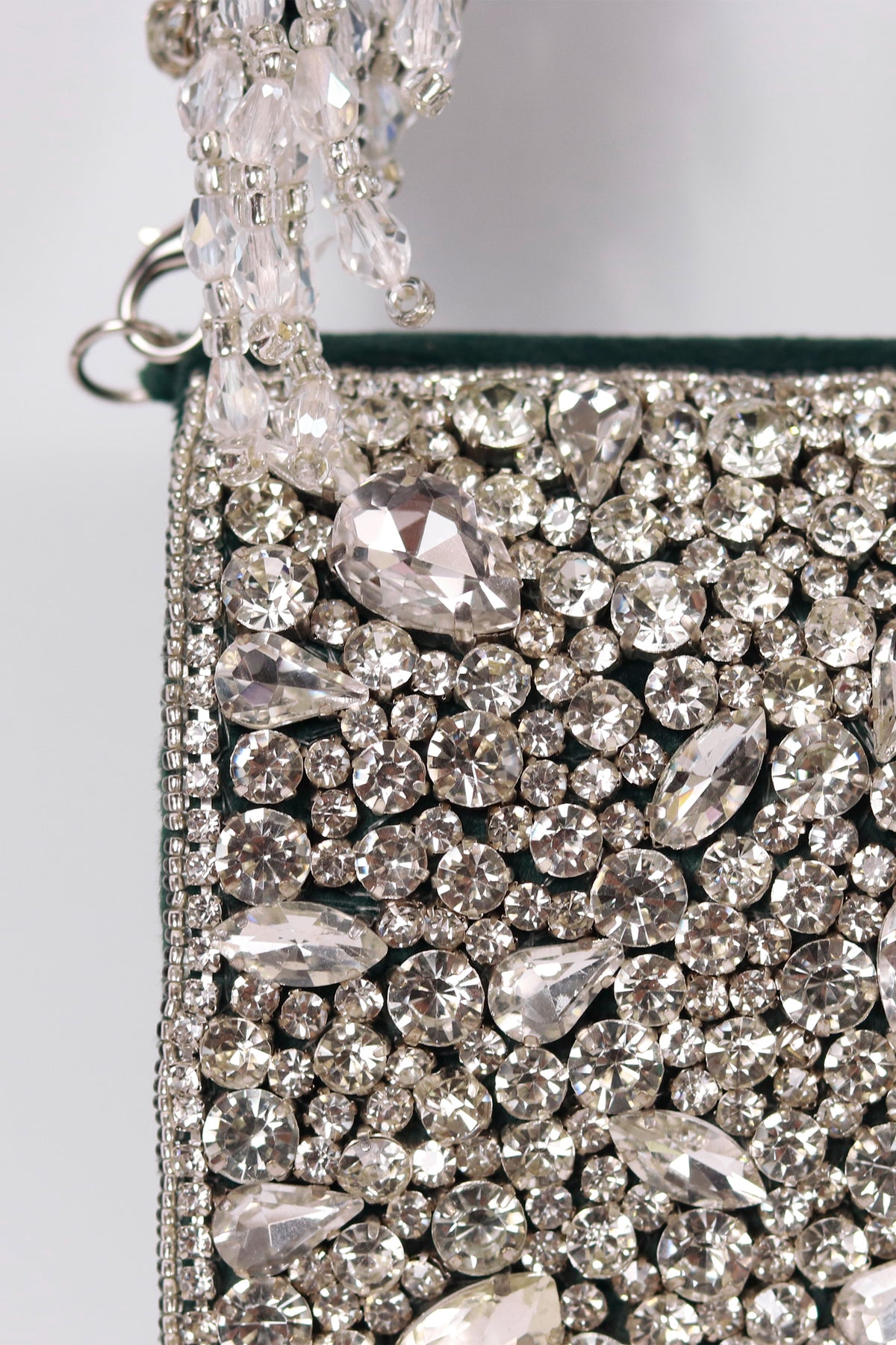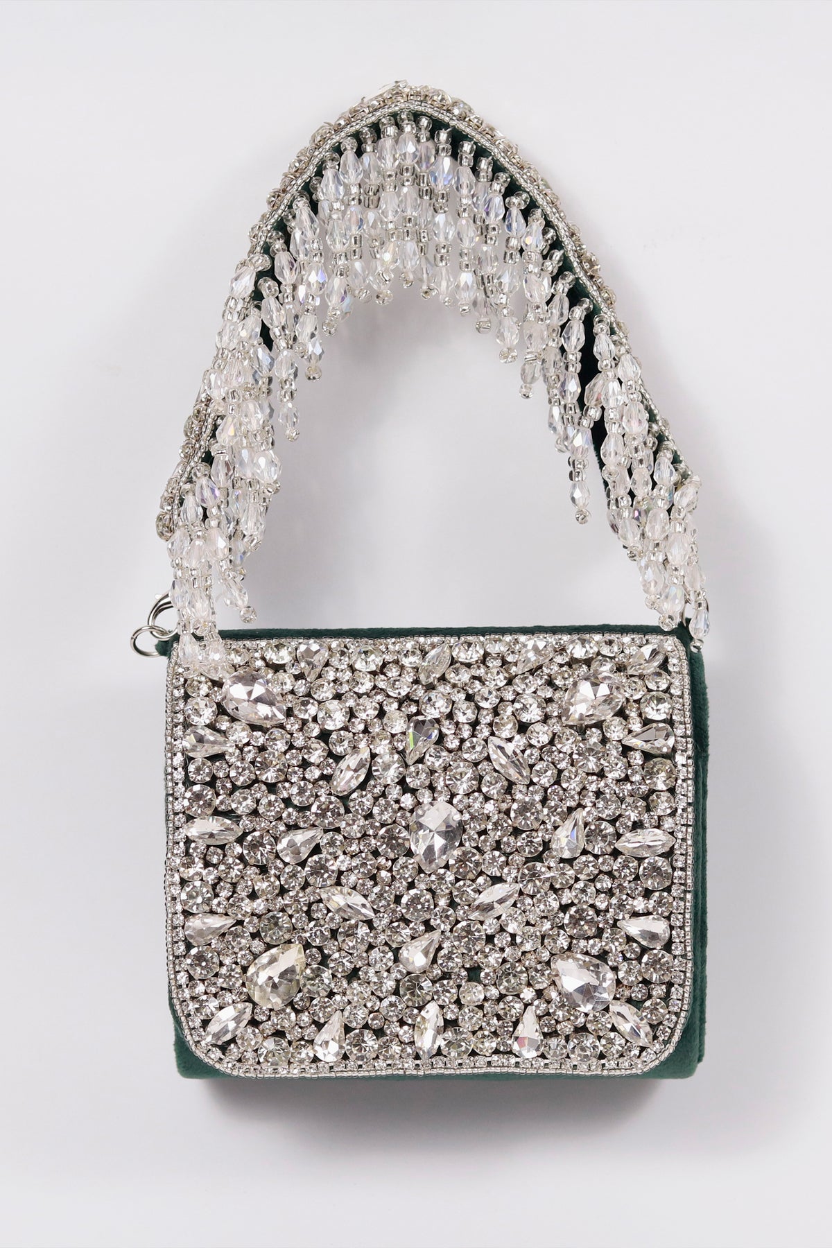 The grace mini bag is a symphony of style and sophistication designed for those who appreciate the finer things in life. Its captivating design features intricate handwork delicately executed with a symphony of sterling stones that glisten like stars in the night sky. Each is placed on the handle by skilled hands, ensuring a level of detail and craftsmanship that is second to none.Ā
