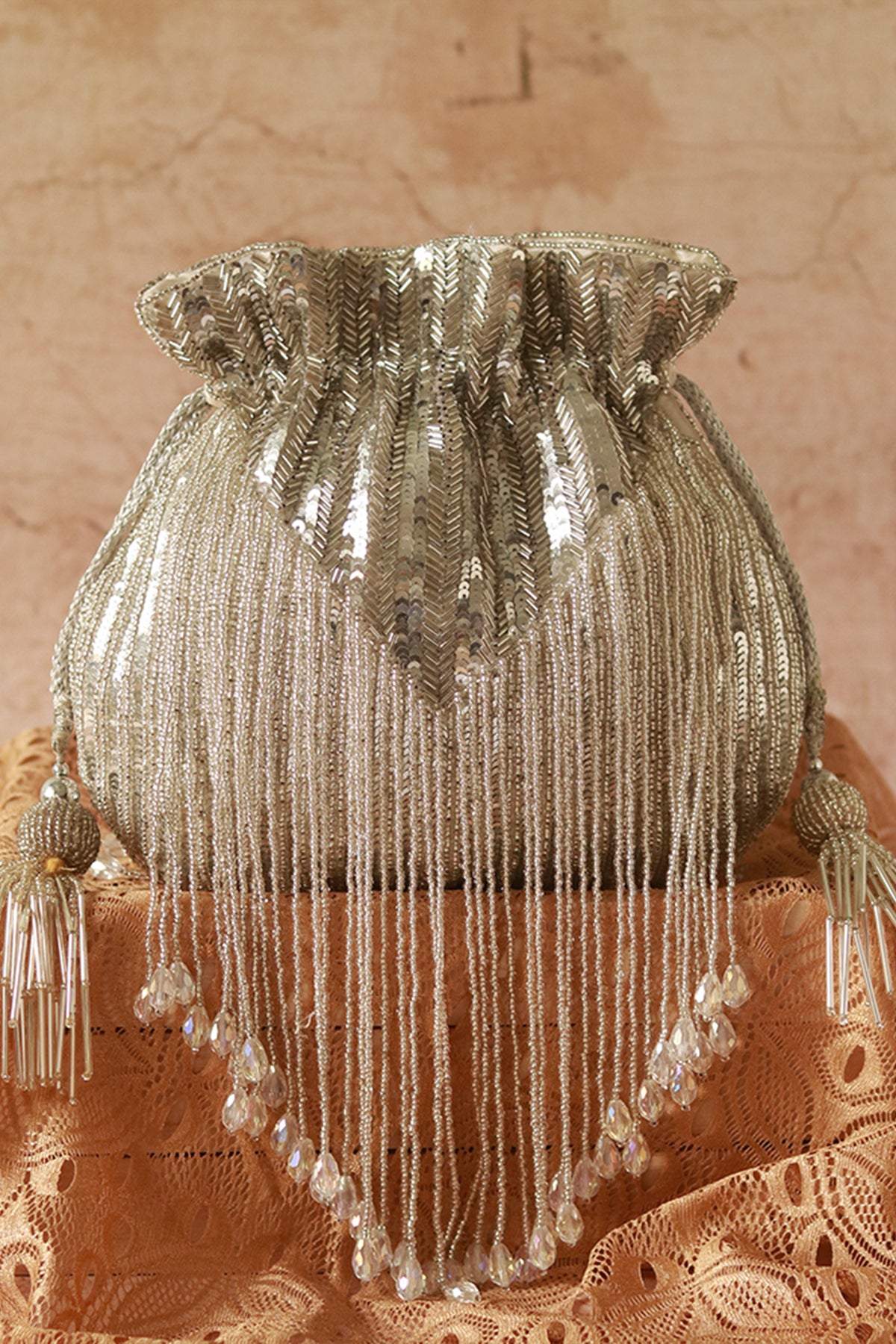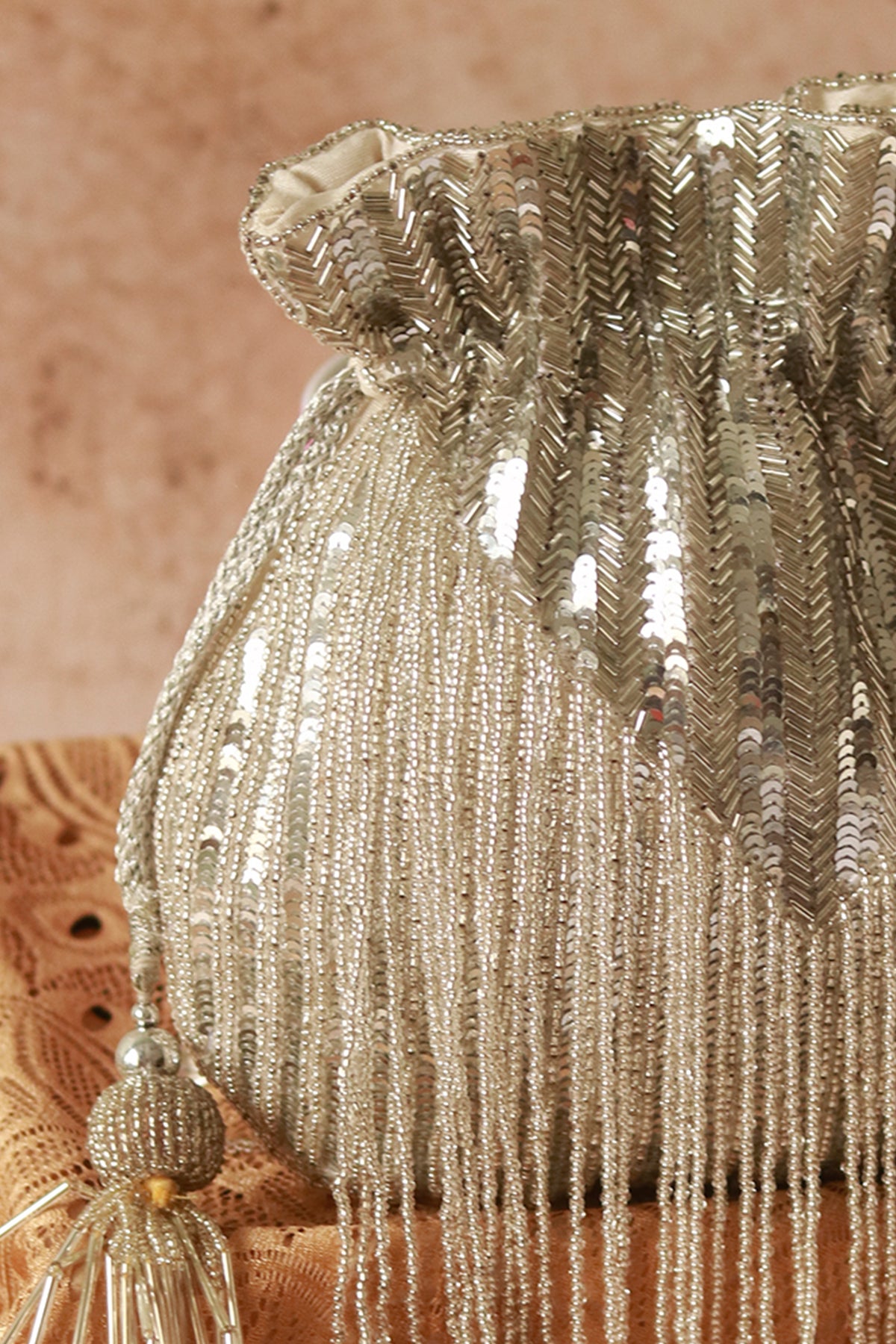 The Tan Clan Twinkle Silver Heavy Tassles Potli With Handle