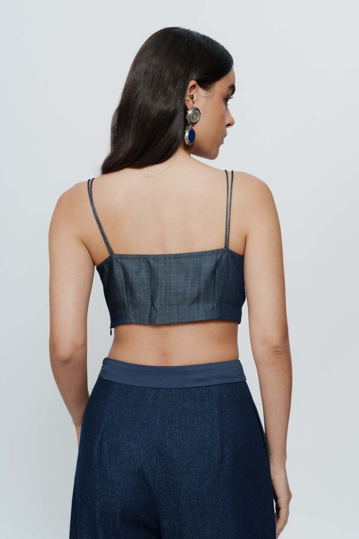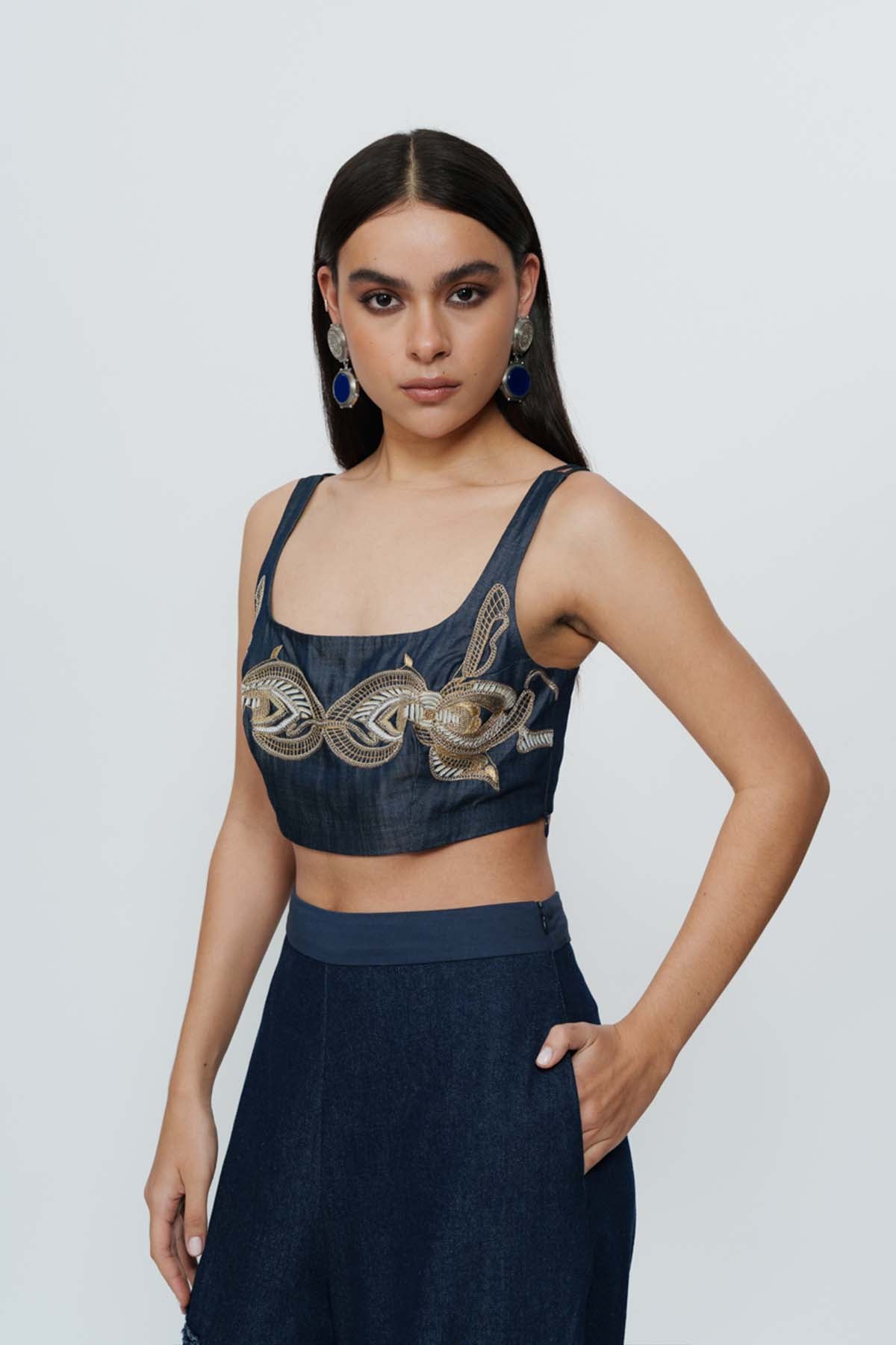 Intricate threadwork brings depth to this black crop top. Compact yet powerful, it’s designed to anchor dramatic skirts or tailored trousers. Made for sangeet nights, cocktail evenings, or layered festive styling.