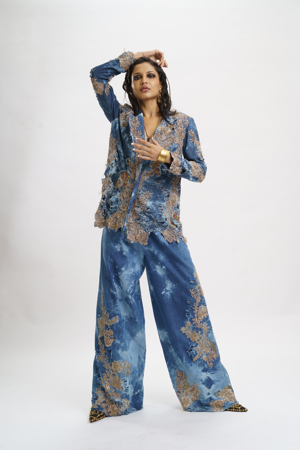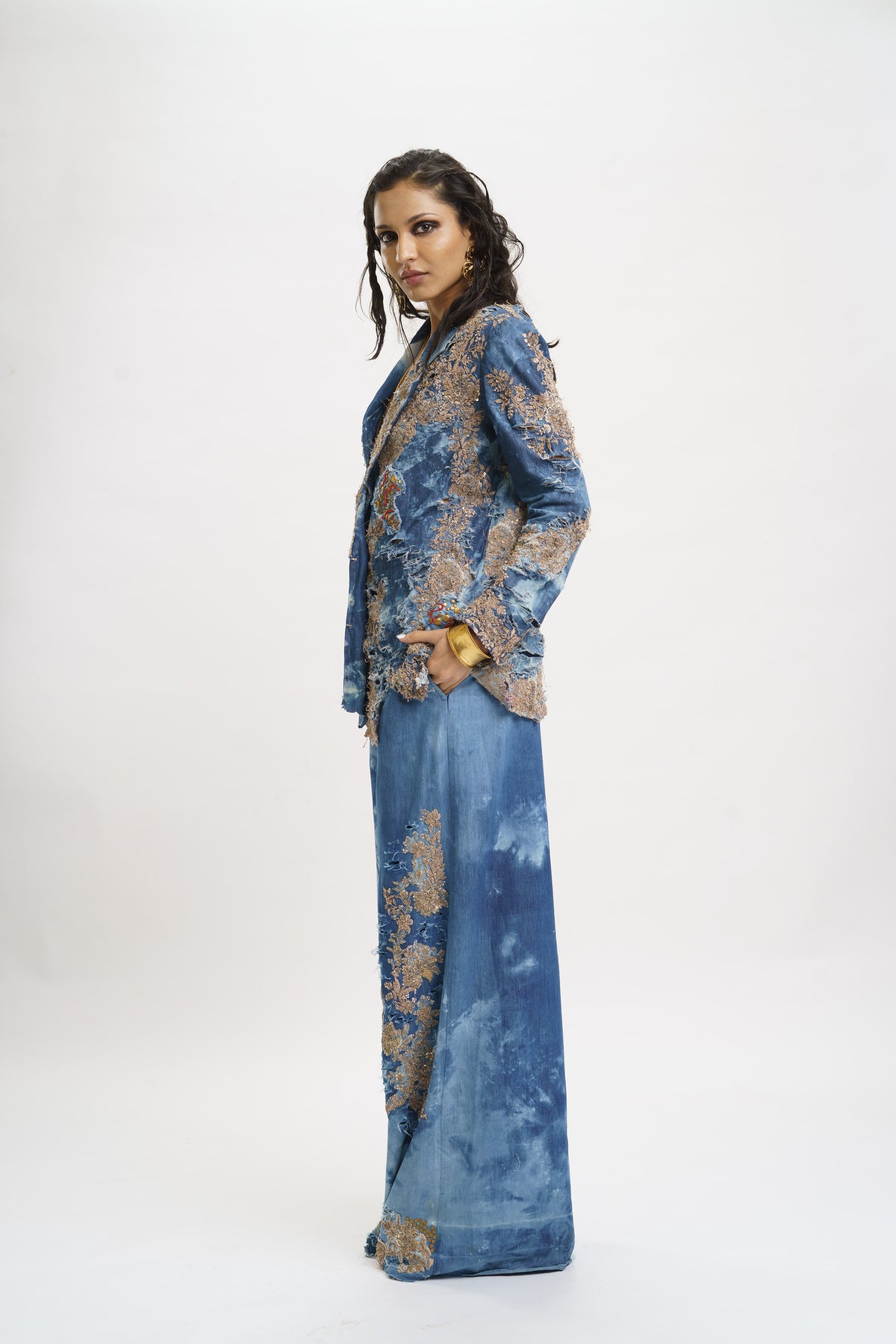 The emsemble is a standout piece that combines casual elegance with the opulance of golden zari thread embroidery.It seamlessly merges contemporary fashion with modern interpretation of traditional craftsmanship.