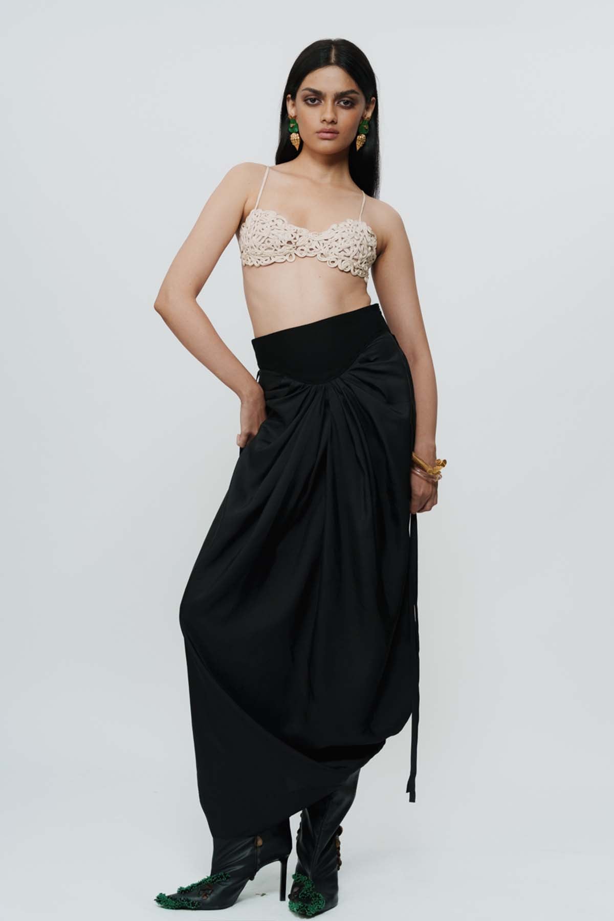 Fluid drapes meet sharp intention. This ivory-toned knotted skirt creates sculptural movement with every step. Designed for statement evenings, contemporary festive styling, or fashion-forward celebrations.