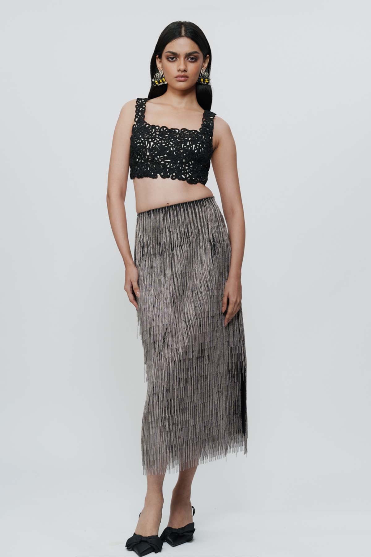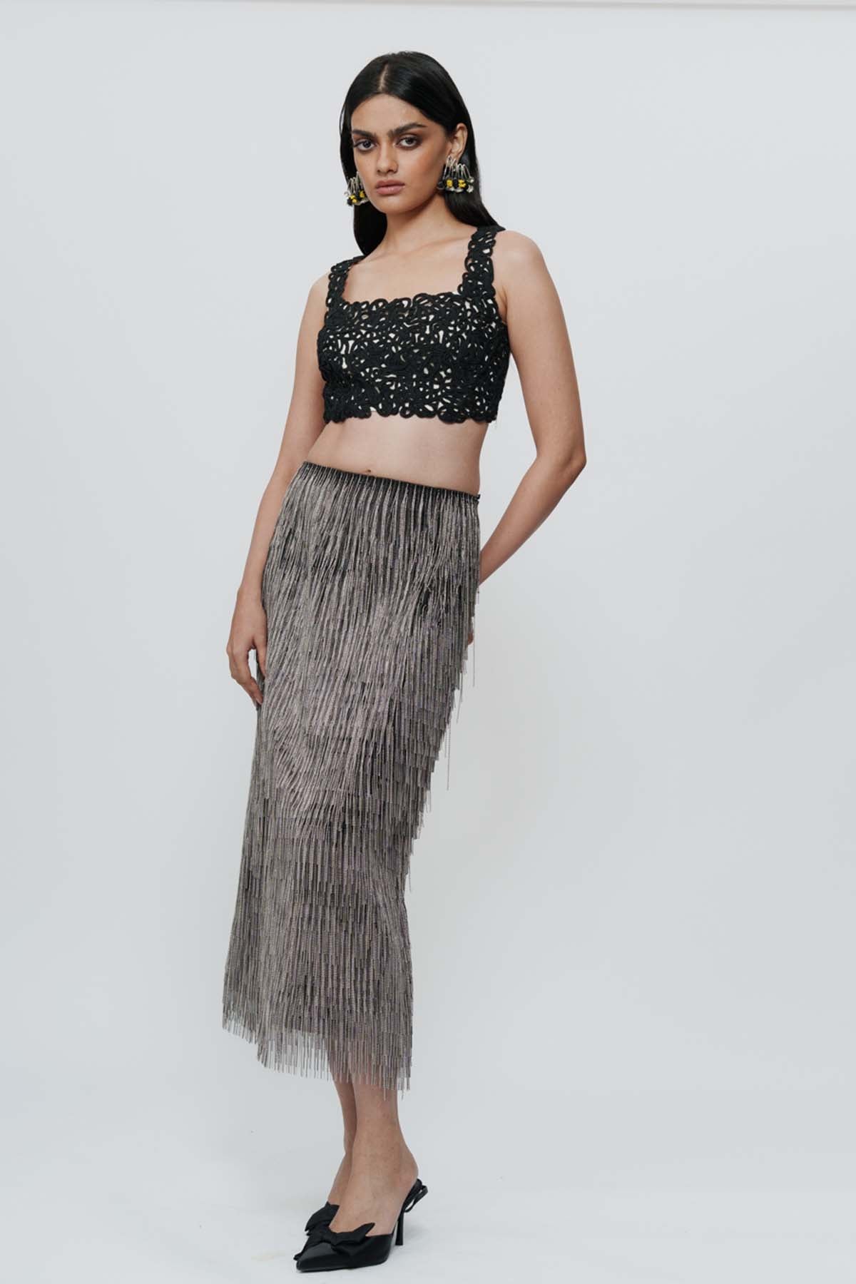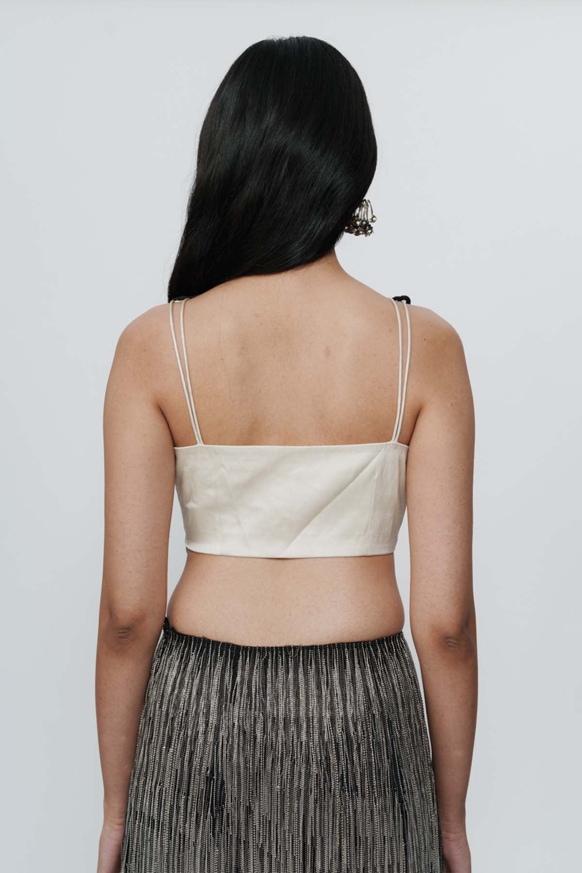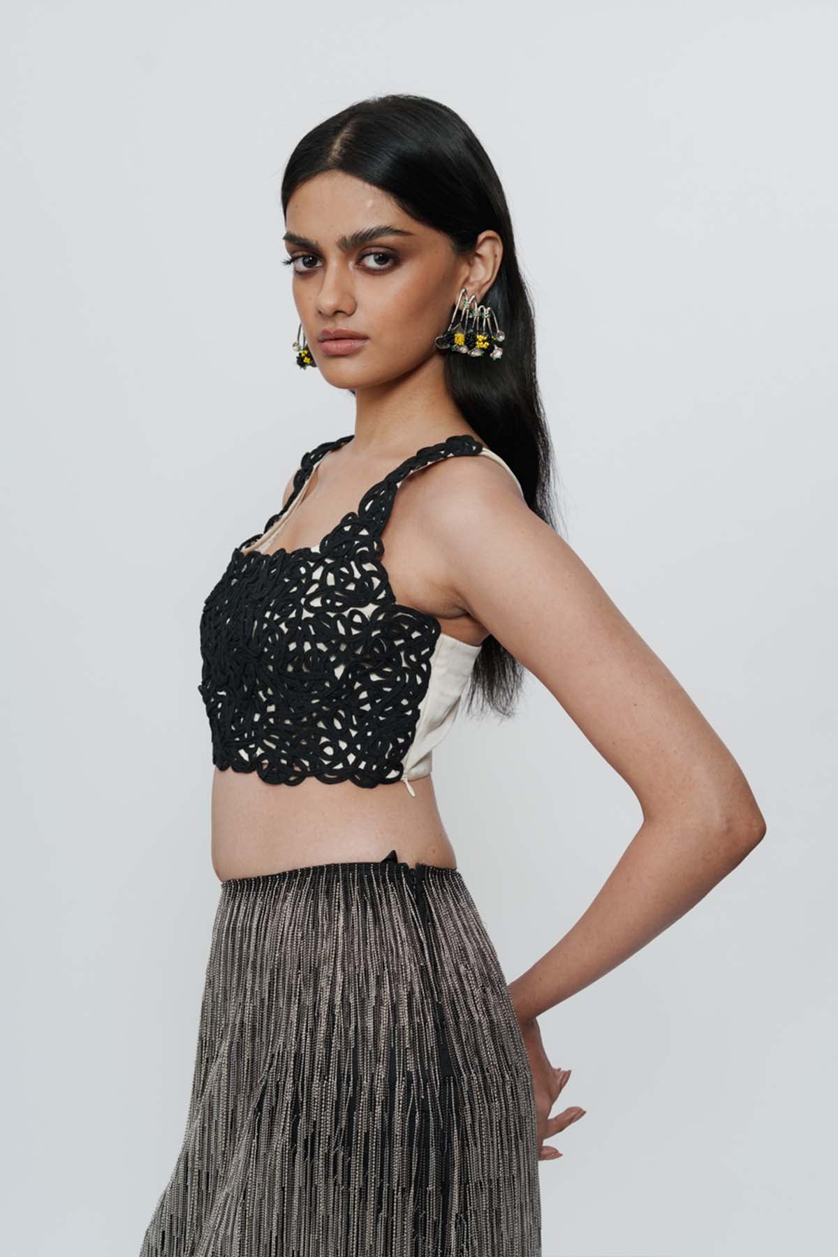Delicate lace meets confident structure. This ivory lace crop top feels romantic, yet undeniably bold. Style it with high-waisted skirts, shararas, or structured pants for weddings or celebratory evenings.
