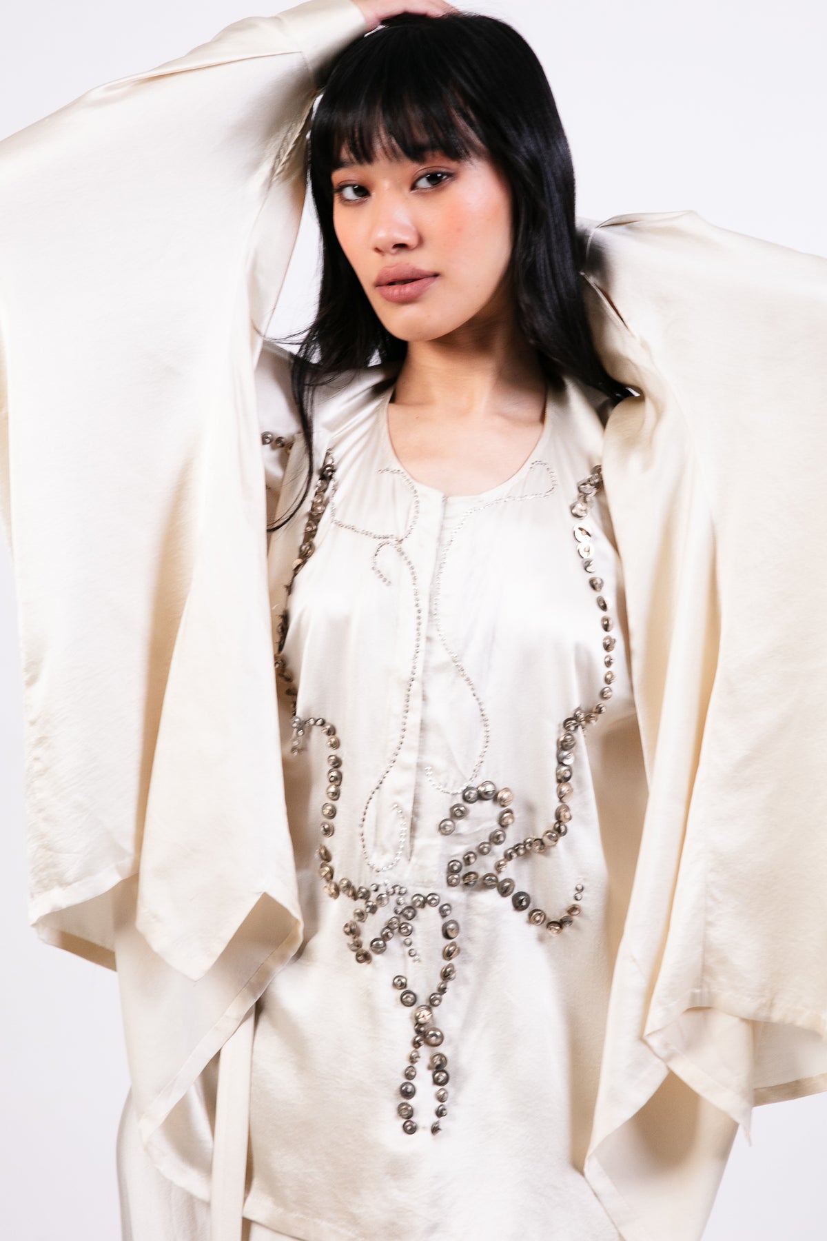 Akok classic & effortless silk ivory short boxy kurta with Lungi skirt, highlighted with metal sequins & coins hand-embroidery, very chic and stylish look to carry day-to night perfect for any occasion.