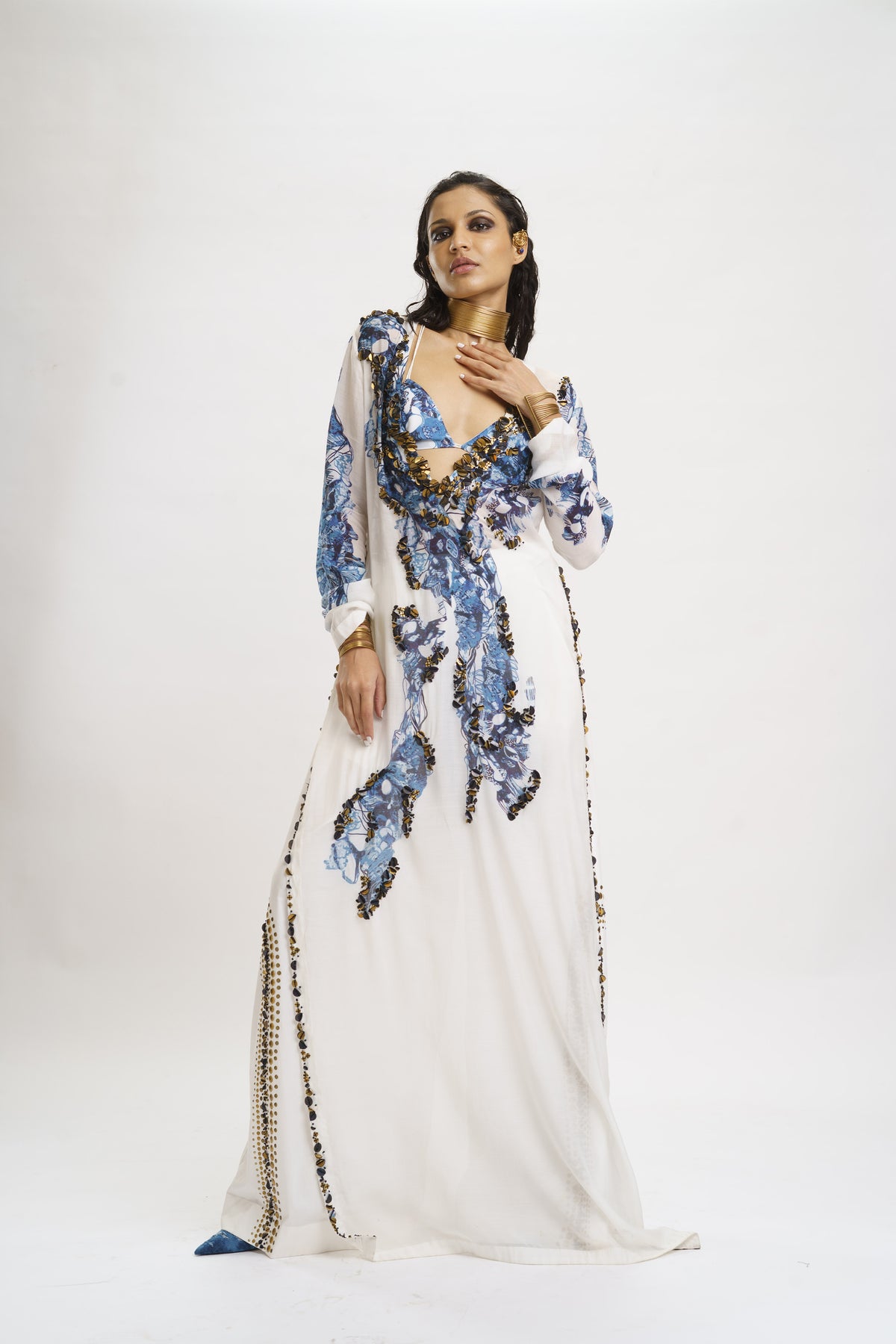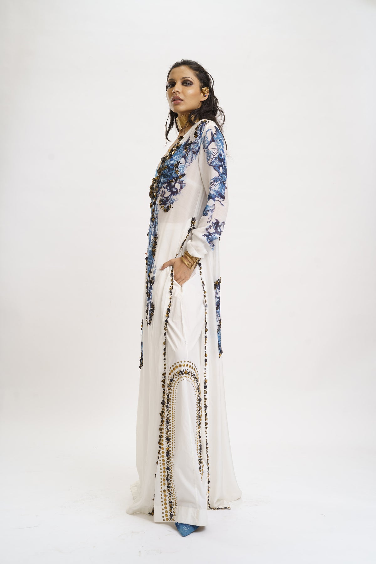 This ensemble offers a unique blend of traditional attire with modern contemporary styling . The juxtaposition of bold prints and embroidery textures creates a fashion-forward and eclectic aesthetic that appeals to those with a keen sense of style and individuality. It offers one of a kind ensemble that embodies creativity, individuality and confidence in fashion expression.