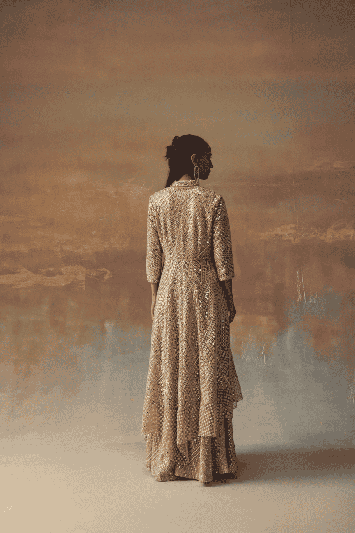 Asym tux collar drawstring peplum blazer with mirrorwork and beadwork on collar