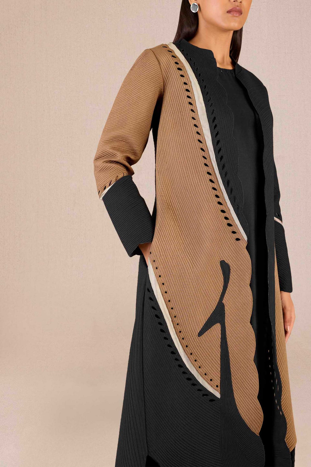 A medley of colourblocking and intricate quilting, our asira jacket set is pure craft. Vines trail around the jacket and its sleeves, depicted by cut-out leaf motifs and applique stems, amongst which a quilted peacock rears its head. With a matching inner tunic that features the same cut-work around its neckline and palazzos, the asira set will bring style and comfort to your next office outing.