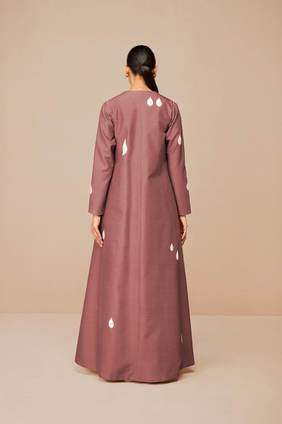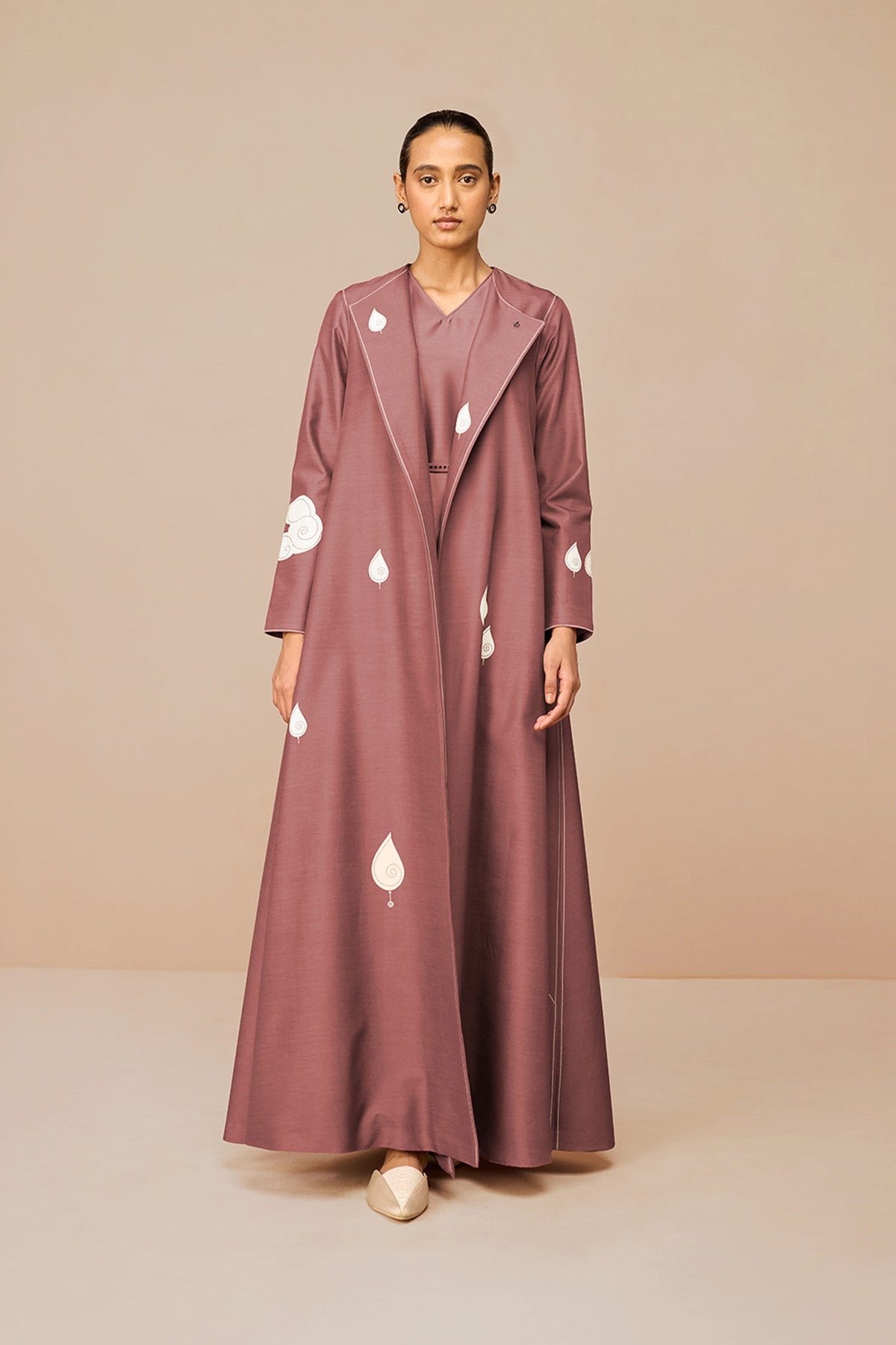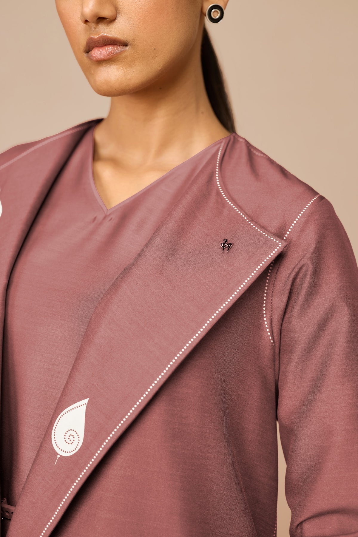 Like freshly thrown clay, azar’s vibrant terracotta colour gleams under the sunlight. Made of luxe cotton silk, light and airy, azar is a simple jacket set where the details shine. A wide lapel, ivory paisley prints arranged like falling raindrops and blooming flowers on the sleeves make the set. A small abstract horse charm shines on the lapel. The set is complete with a matching inner dress and a faux leather belt with silver charms looping through it. Pair azar with our ninah mules in pearl white.