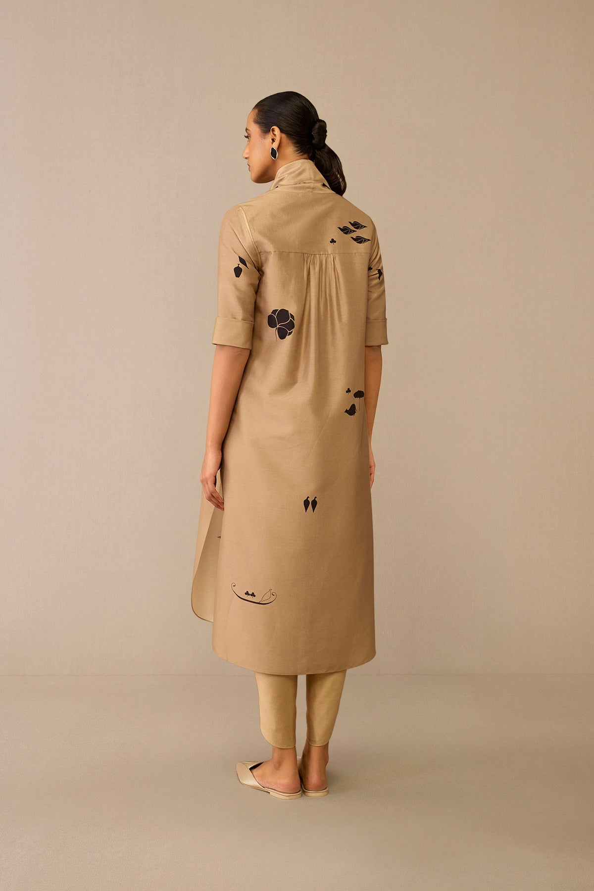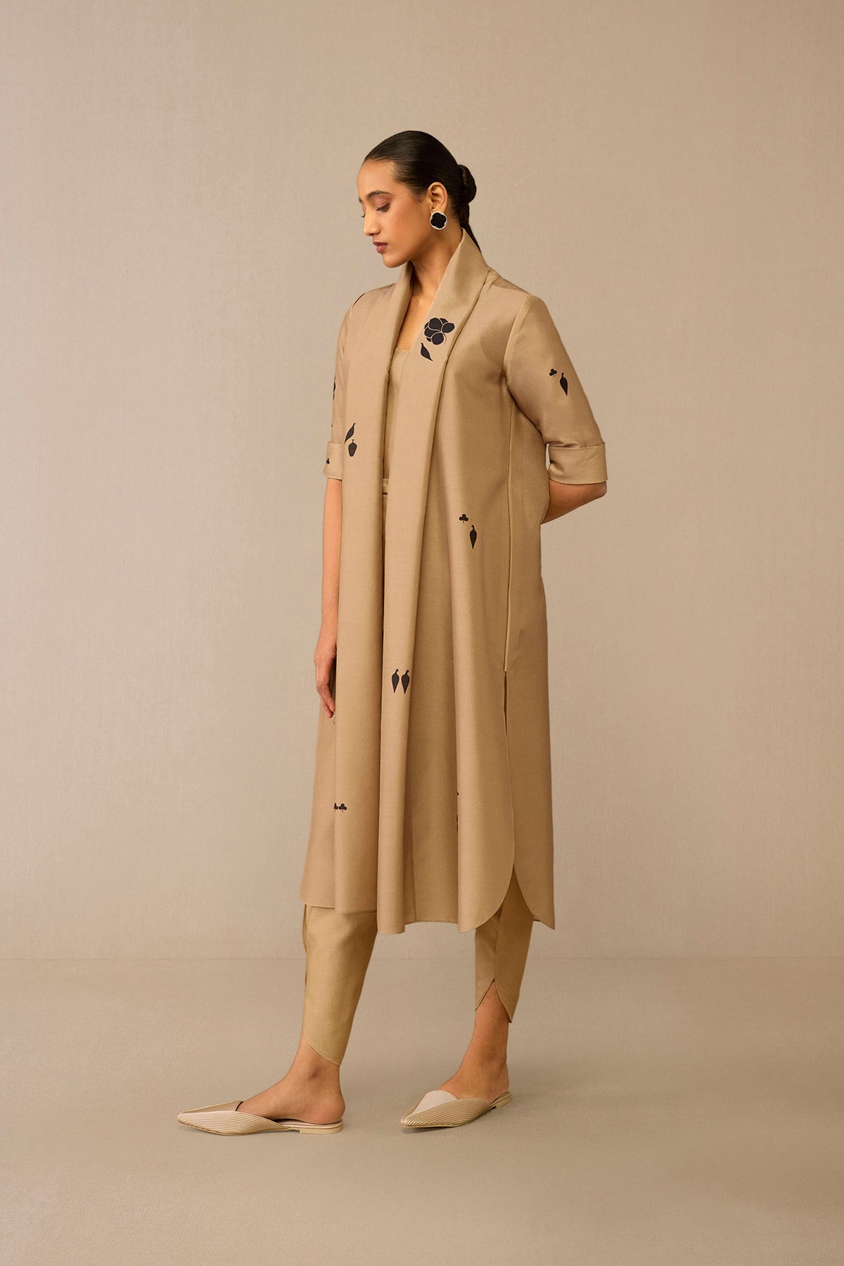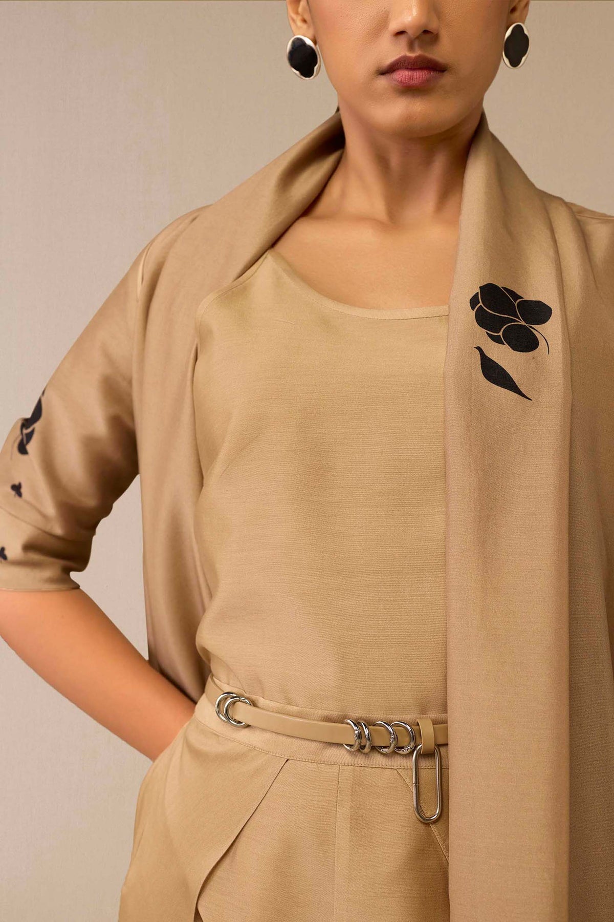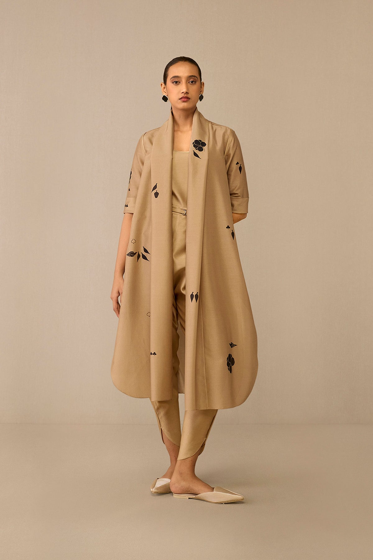 Light as a spring breeze, the dilnar throw set captures the essence of effortless grace. Crafted from lustrous beige chanderi, its flowing throw features delicate, story-like prints of birds and blooming flowers. Paired with slim dhoti-inspired pants, this set is perfect for sunny days and balmy evenings. Wear it with our ninah mules in gunmetal. Ā