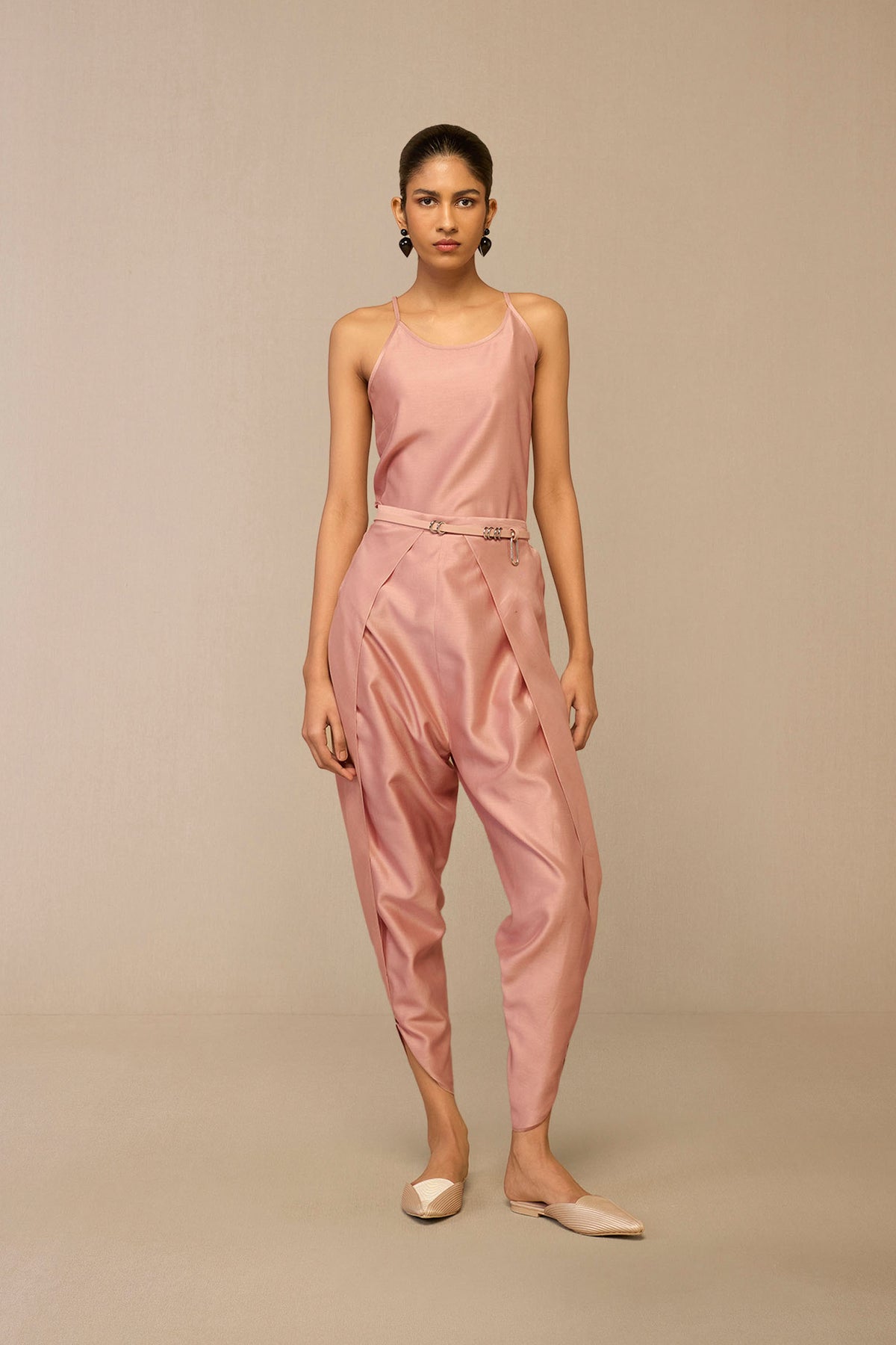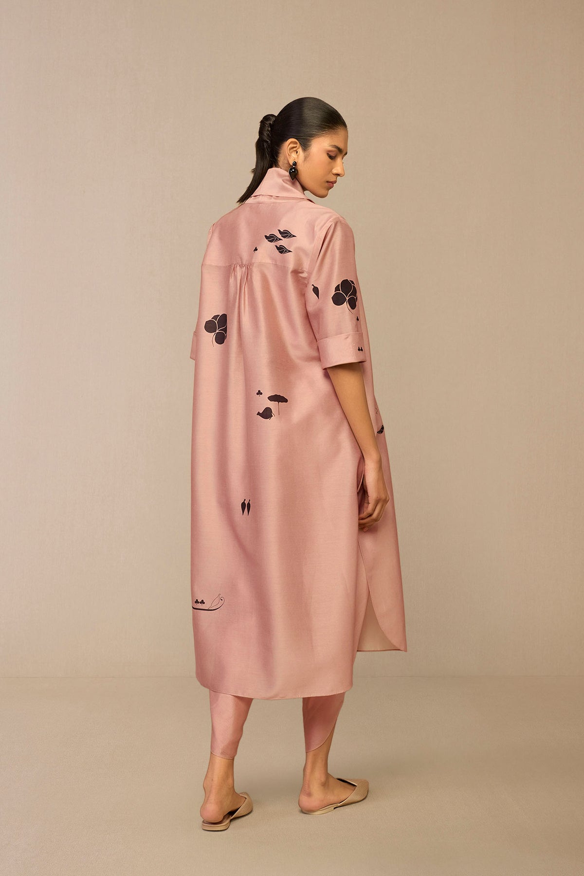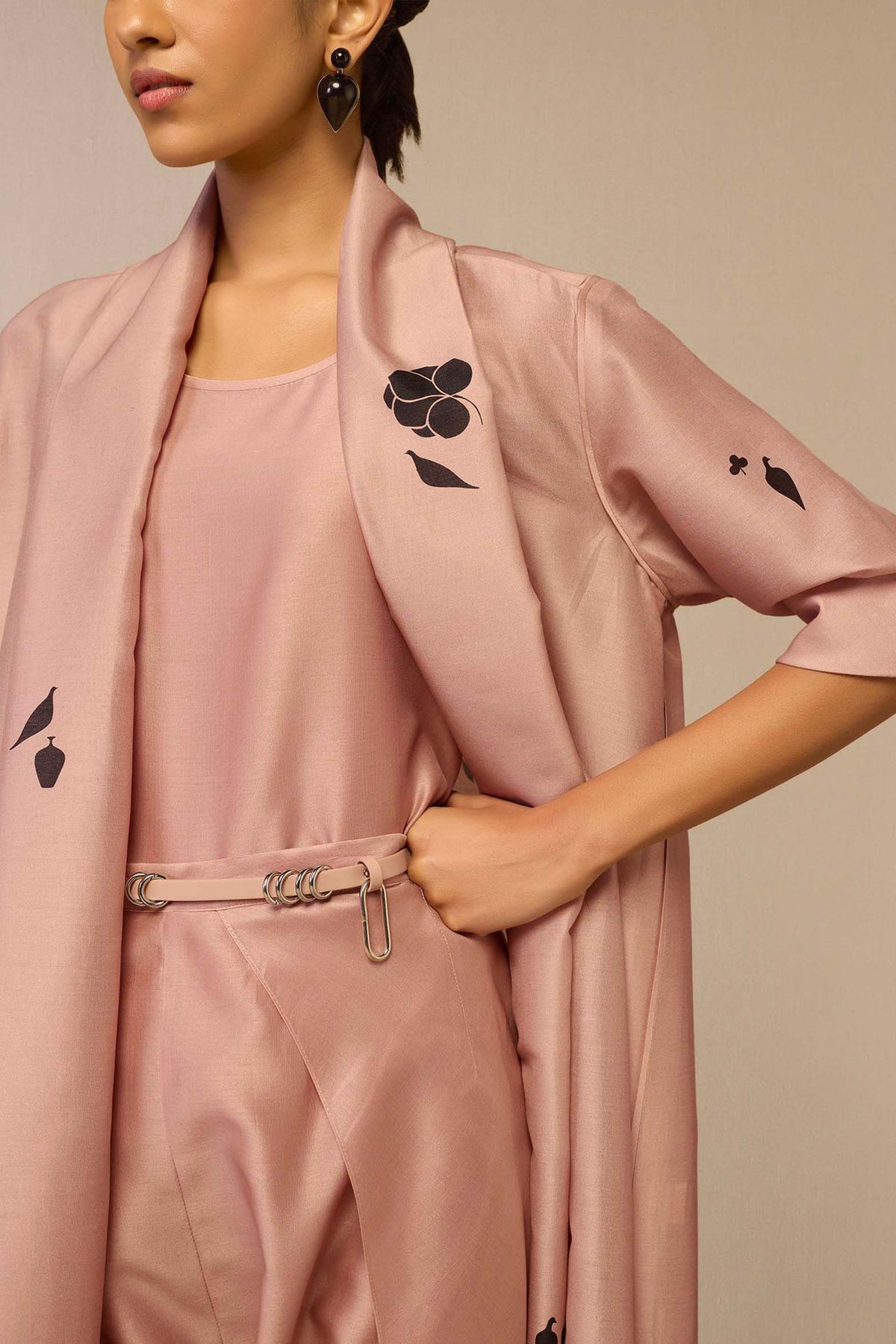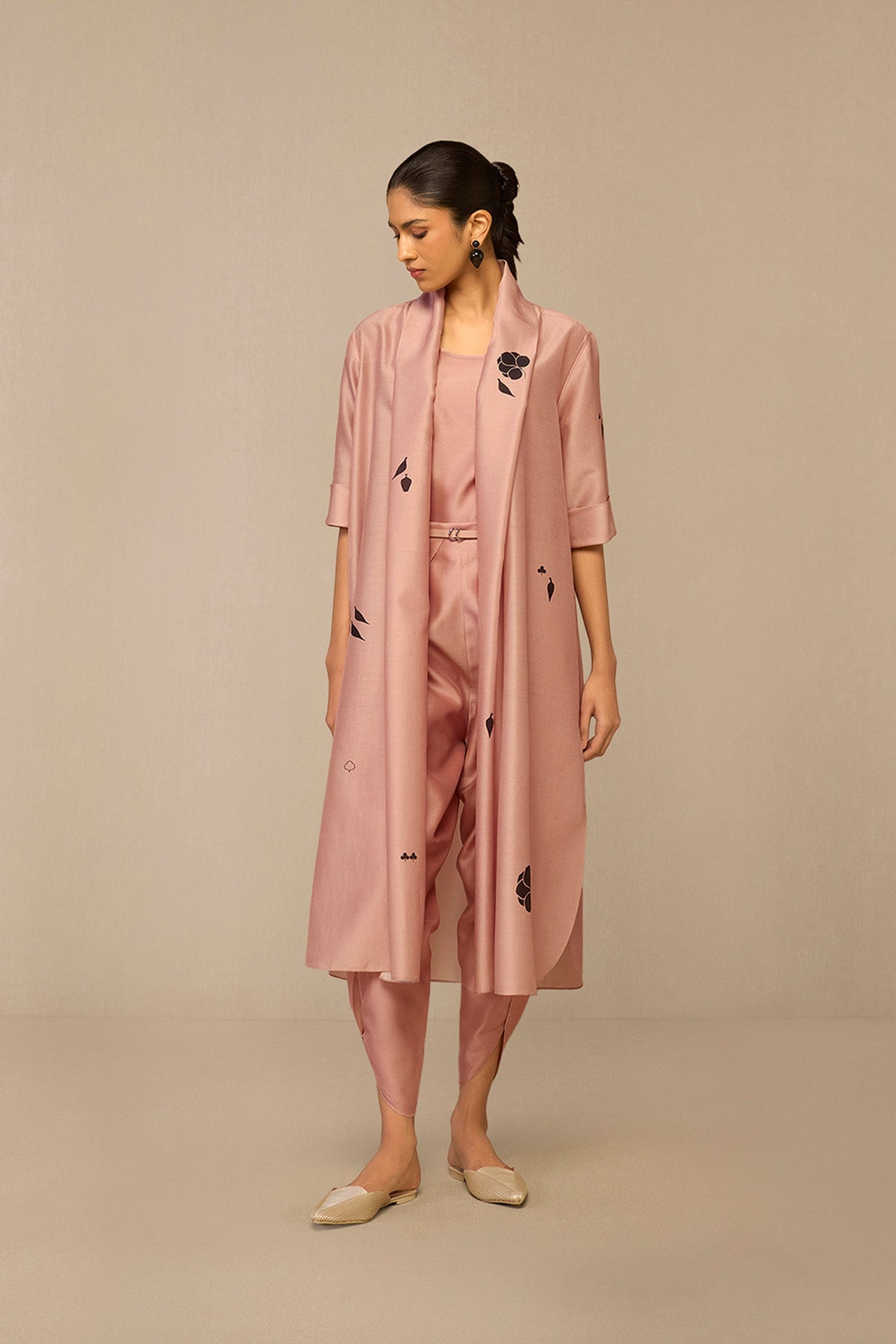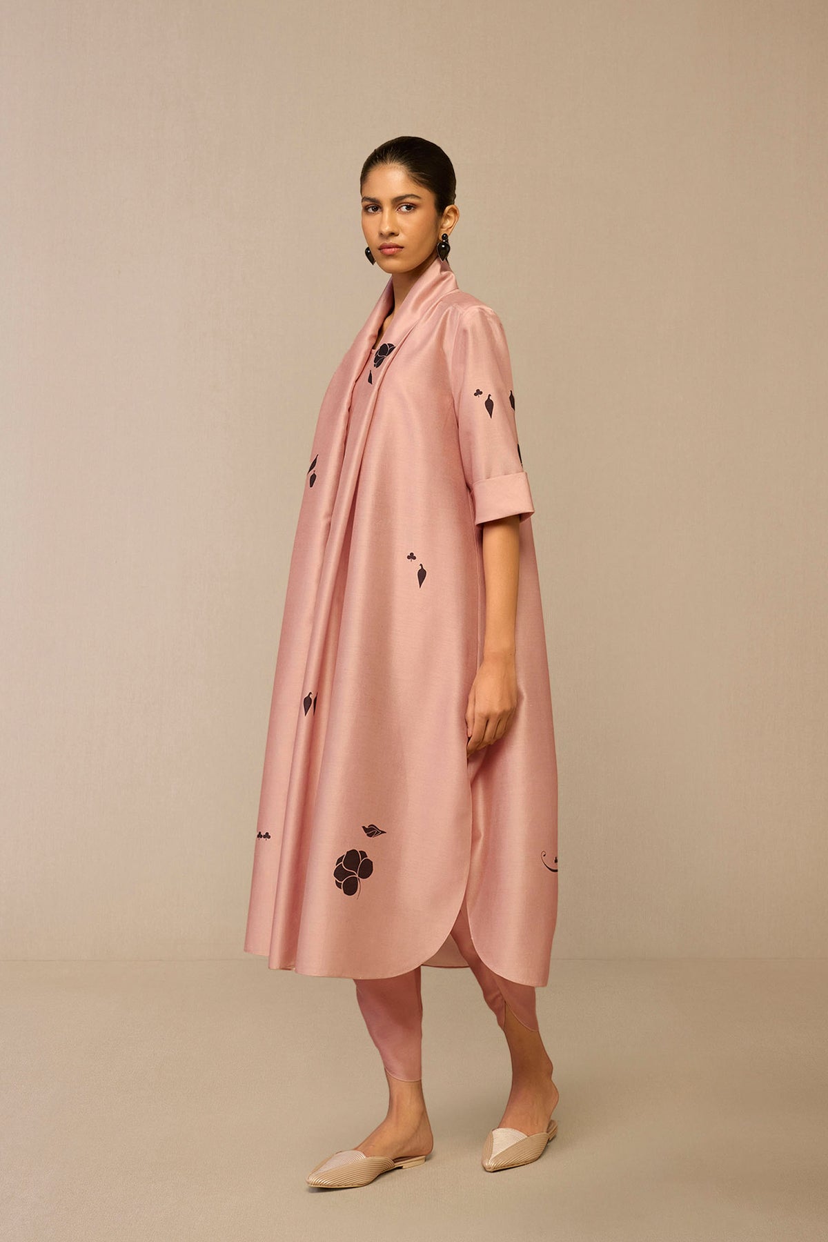 Light as a spring breeze, the dilnar throw set captures the essence of effortless grace. Crafted from lustrous blush chanderi, its flowing throw features delicate, story-like prints of birds and blooming flowers. Paired with slim dhoti-inspired pants, this set is perfect for sunny days and balmy evenings. Wear it with our ninah mules in gunmetal.