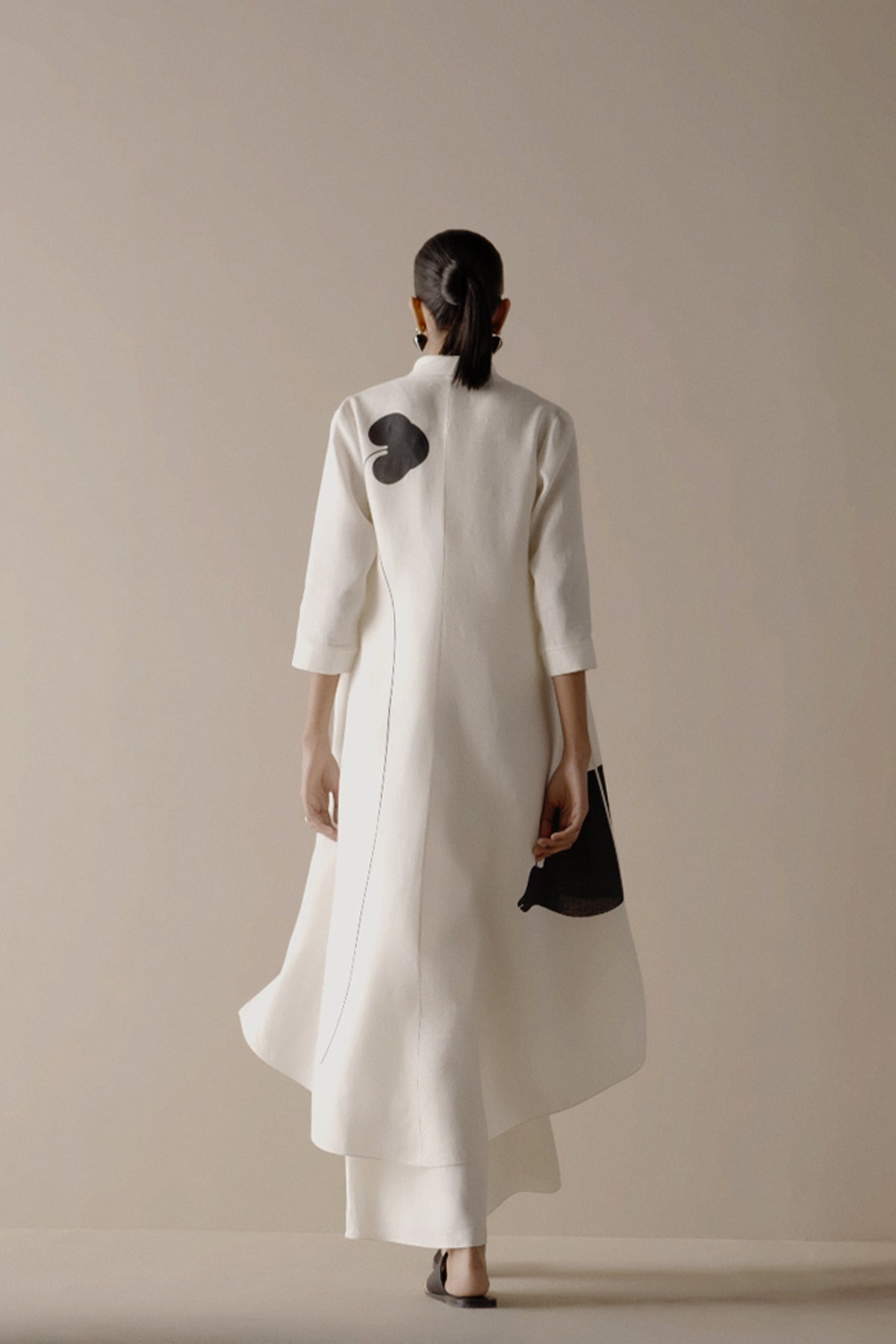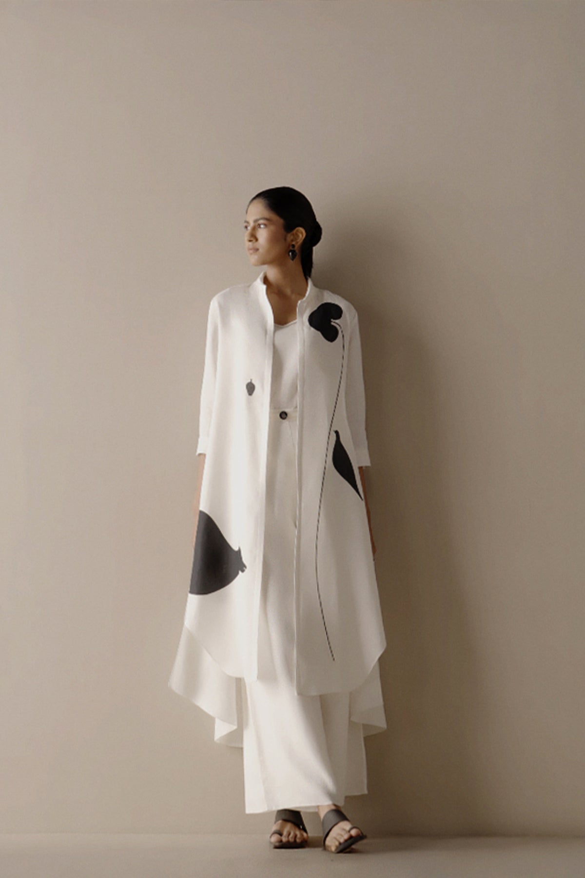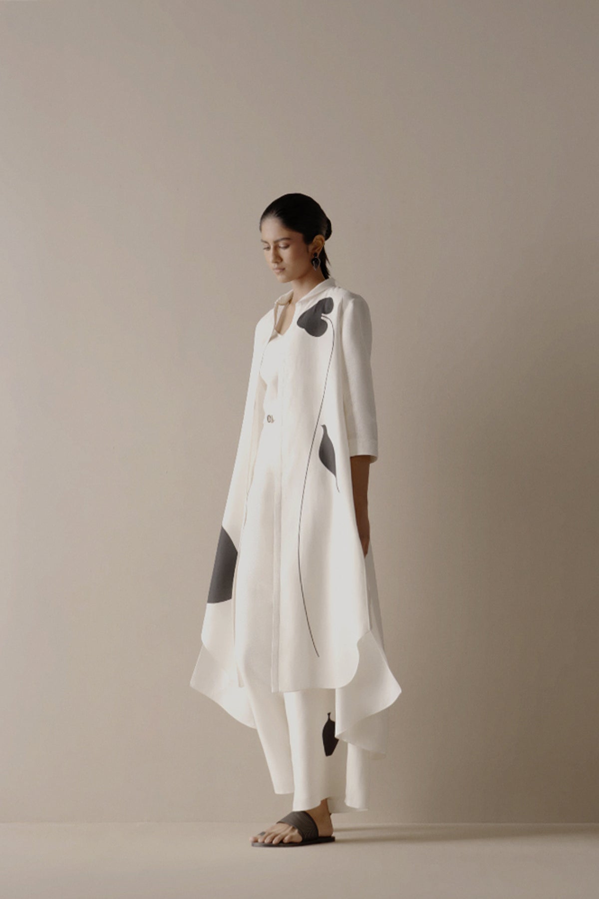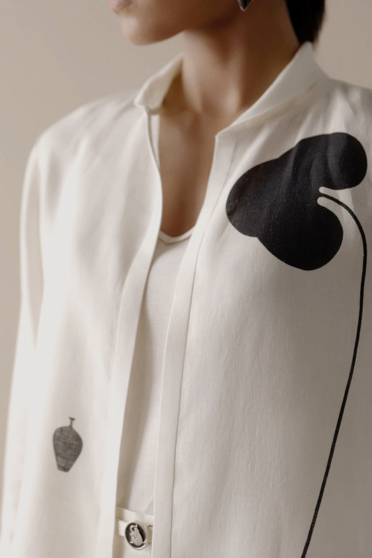 The dilnawaz jacket set is a quiet celebration of nature’s beauty, woven into pure ivory linen. With minimalistic prints of birds, cows, and blooming flowers, it tells a soft, evocative story. The jacket’s gently curved hem pairs perfectly with a matching inner top and wide-leg palazzos. A faux leather belt with an enamel buckle completes the set. Perfect for casual lunches and afternoon outings, wear dilnawaz with our emira slip-ons and amina clutch.