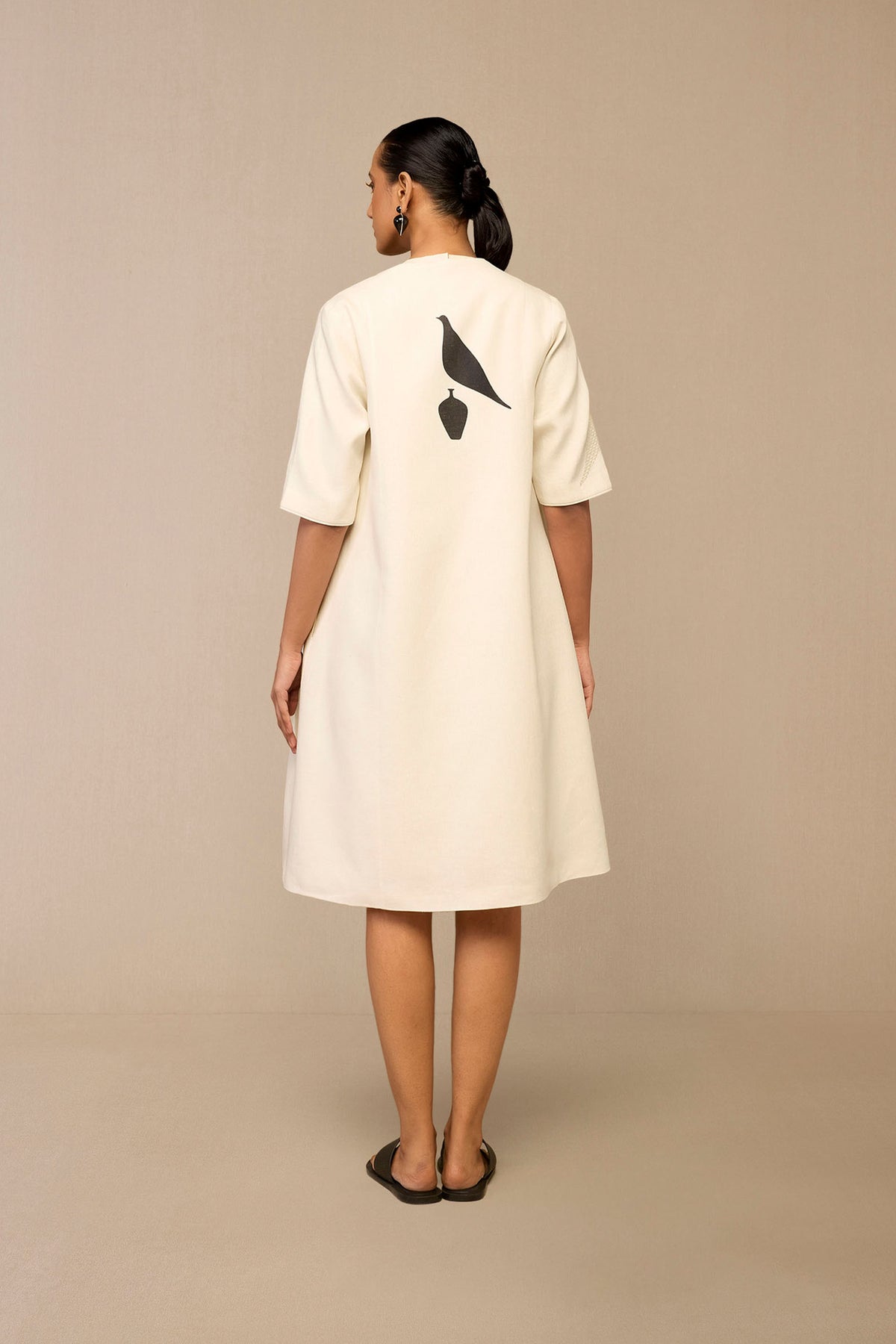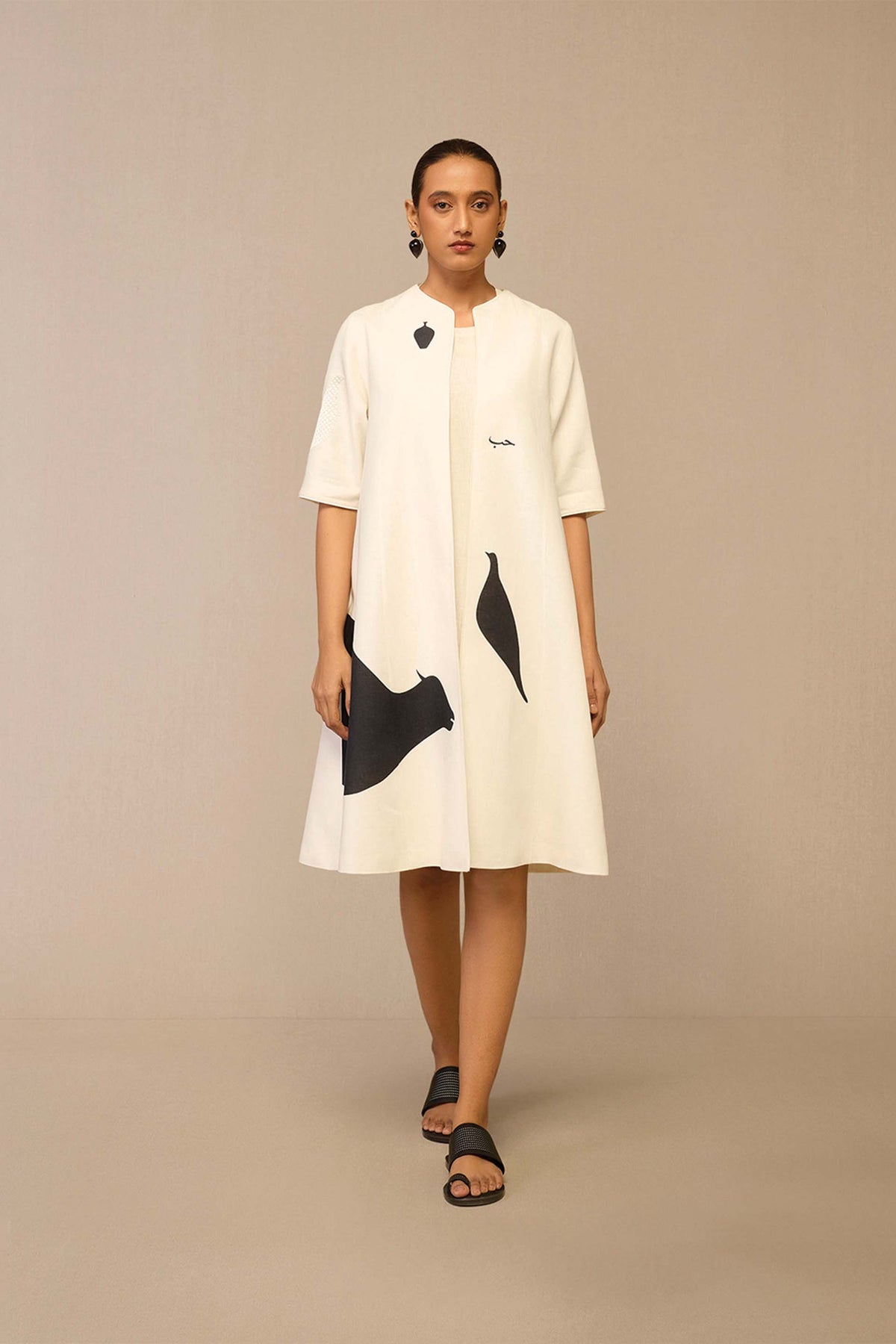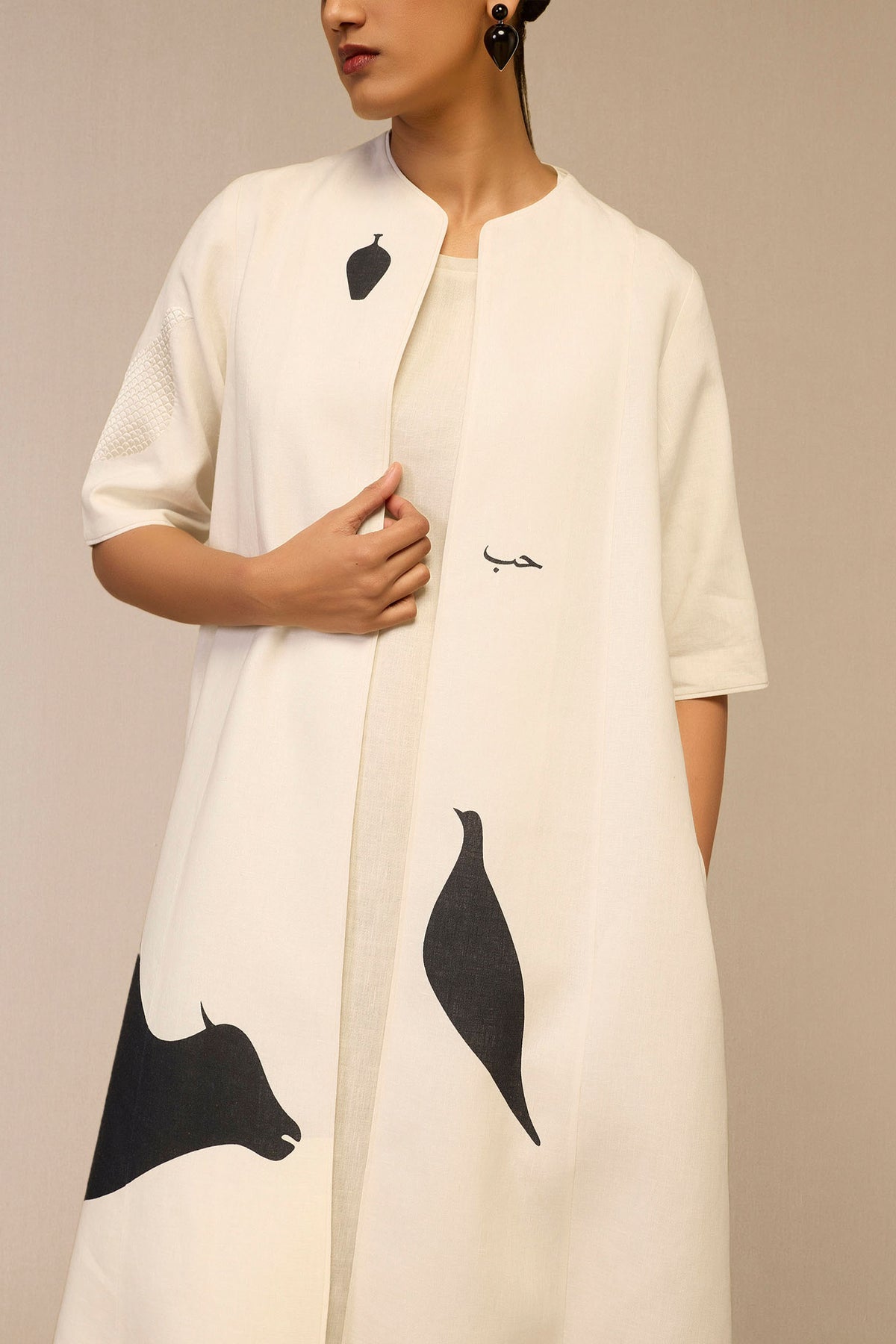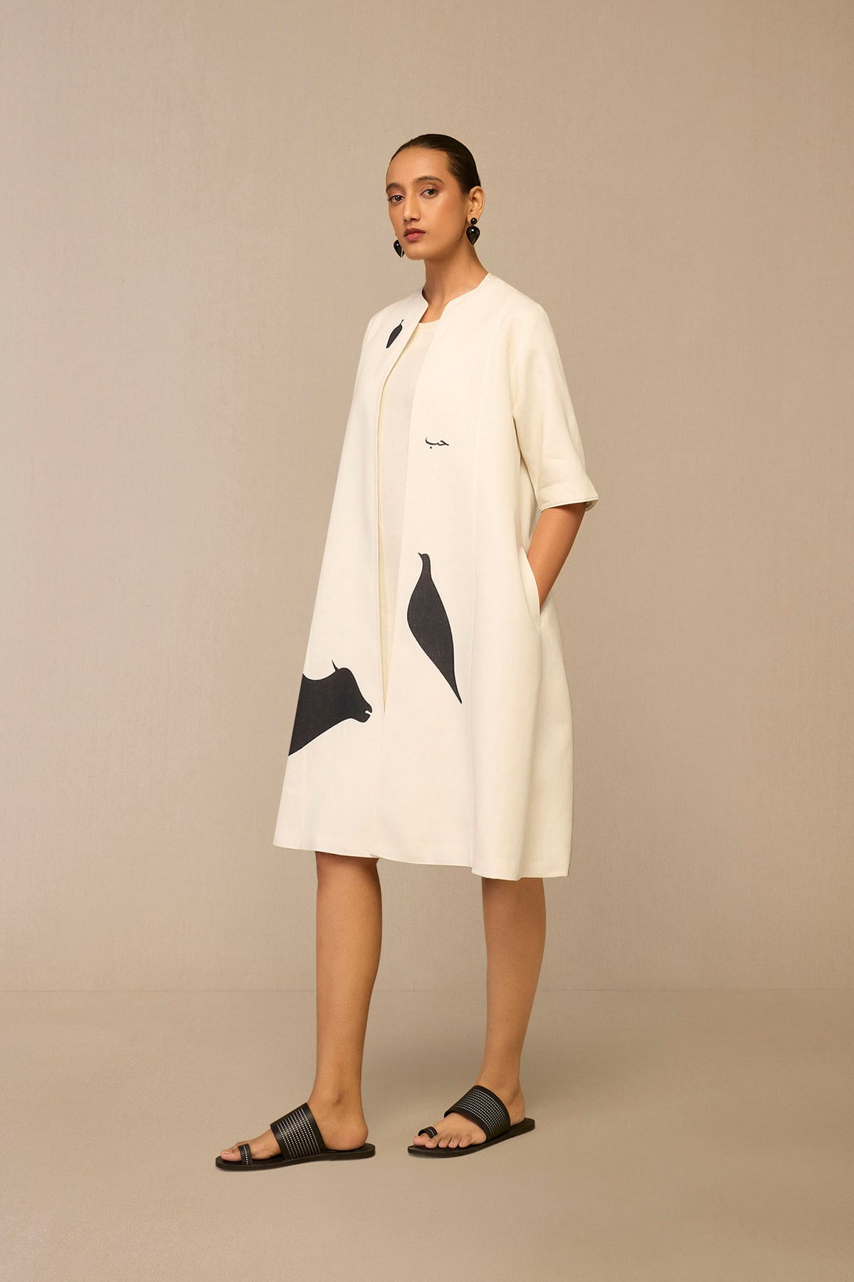 Crafted from pristine ivory cotton linen, the dilzafer jacket set is where art meets elegance. The jacket features black prints of cows and birds — a symbolic dialogue with nature, etched onto fabric. Its gently flared a-line silhouette, complete with a breezy inner dress and practical pockets add a touch of ease. Perfect for garden soirées or cultural outings, pair dilzafer with our emira slip-ons and calla backpack.