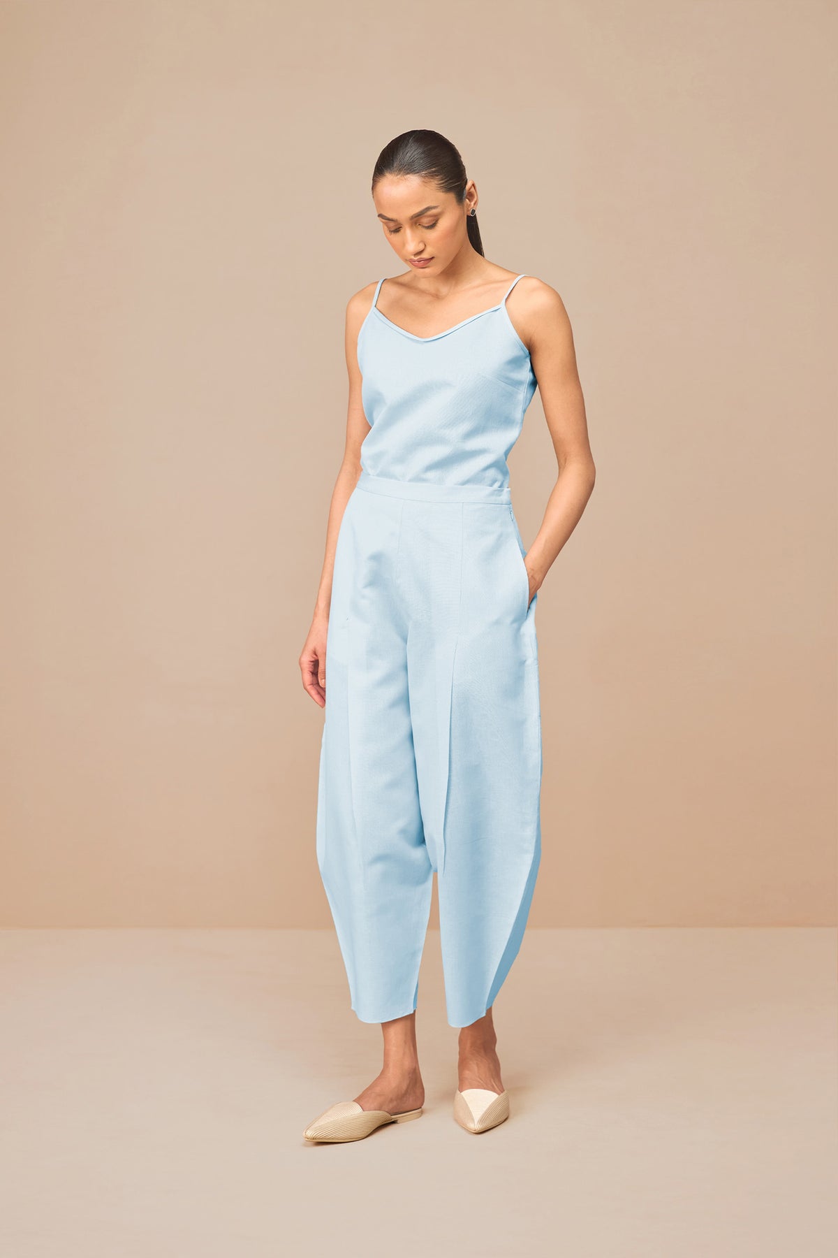 Ice blue like the summer sky when the sun is at its highest, elea is a three-piece charmer. The jacket is made from a breathable cotton silk (chanderi) with intricate cut-work embroidery forming faint peacock motifs on each side and running down the sleeves. The sheer sheen of the jacket is offset by an accompanying inner top with spaghetti straps and an ankle length pant with a dhoti inspired silhouette. The set is complete with a soft faux leather belt in the same pale blue with an enamel buckle. Elea is the summer brunch outfit of your dreams, paired with our eden slip-ons and marham bucket bag in tan.