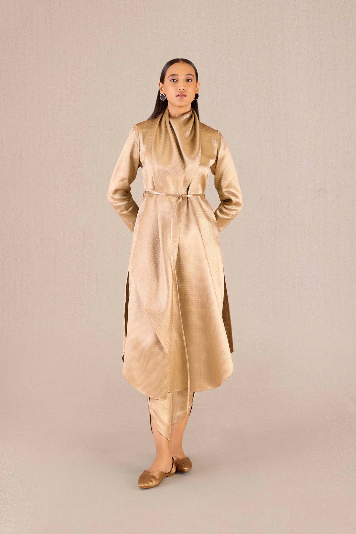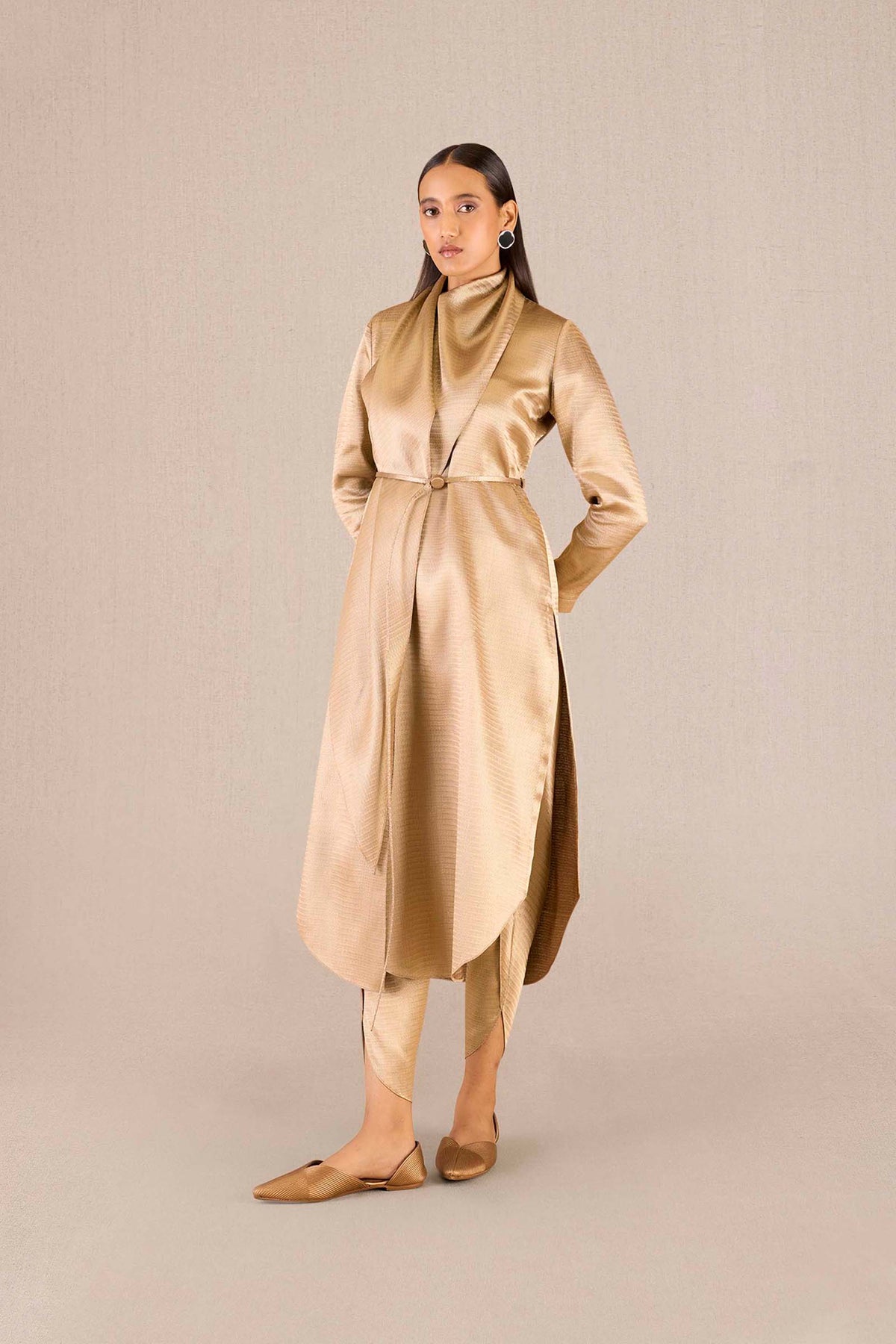 Sweeping gold brocade drapes itself around the neck of the tunic and down into full sleeves, providing our Ruhma tunic set with a unique silhouette. The matching pants keep the signature drape of this set, and the long belt that comes with the set ties the whole outfit together. Pair Ruhma with our Zahra flats and Iman clutch for a golden look that turns heads at your next festive celebration. Ā Ā Ā Ā Ā Ā Ā Ā