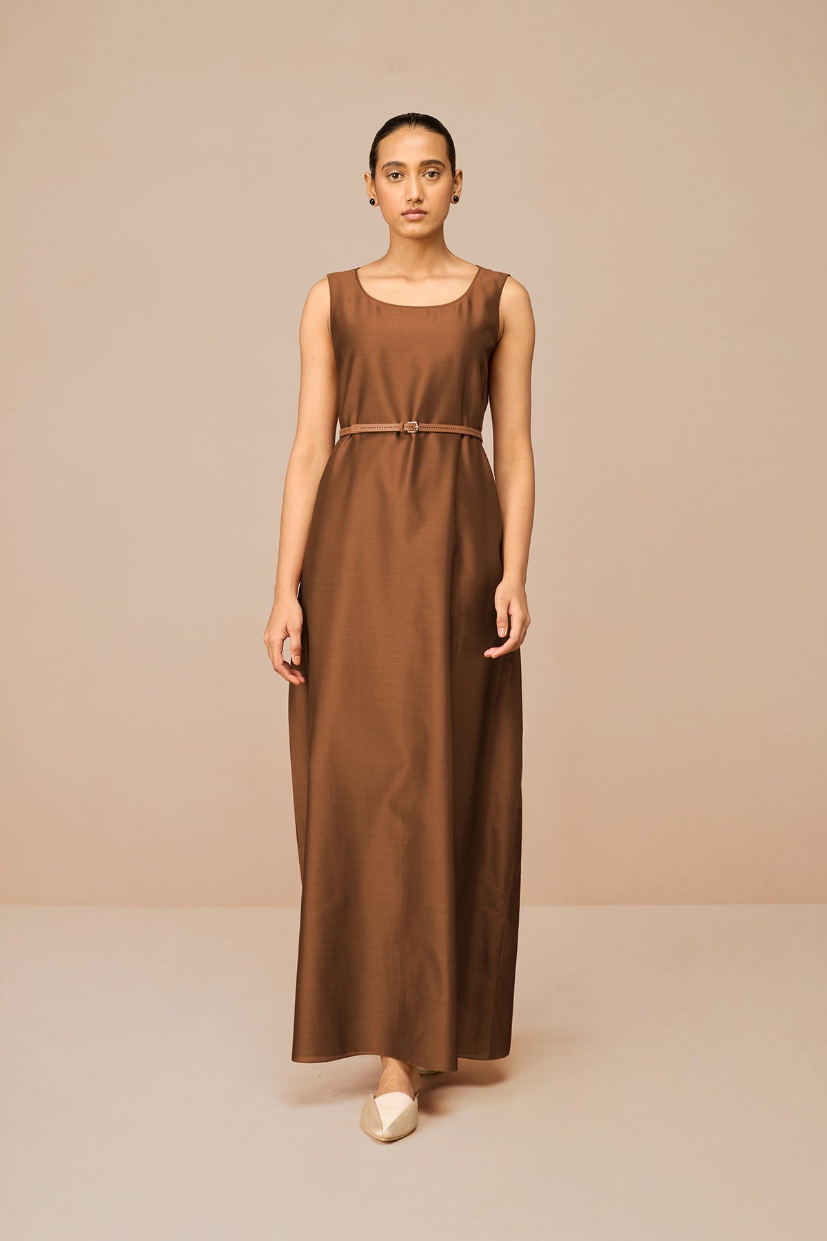 Like freshly tilled earth, mirdea’s rich brown colour gleams under the sunlight. Made of luxe cotton silk, light and airy, mirdea is a simple jacket set where the details shine. A wide lapel, blocks of beige bordering the sleeves and hemline with cut-work details running down the seams of the jacket against an ivory backdrop make the set. The set is complete with a matching inner dress and a faux leather belt. Pair mirdea with our ninah mules and myah mini clutch in pearl white for a look that stuns at any weekend get together.