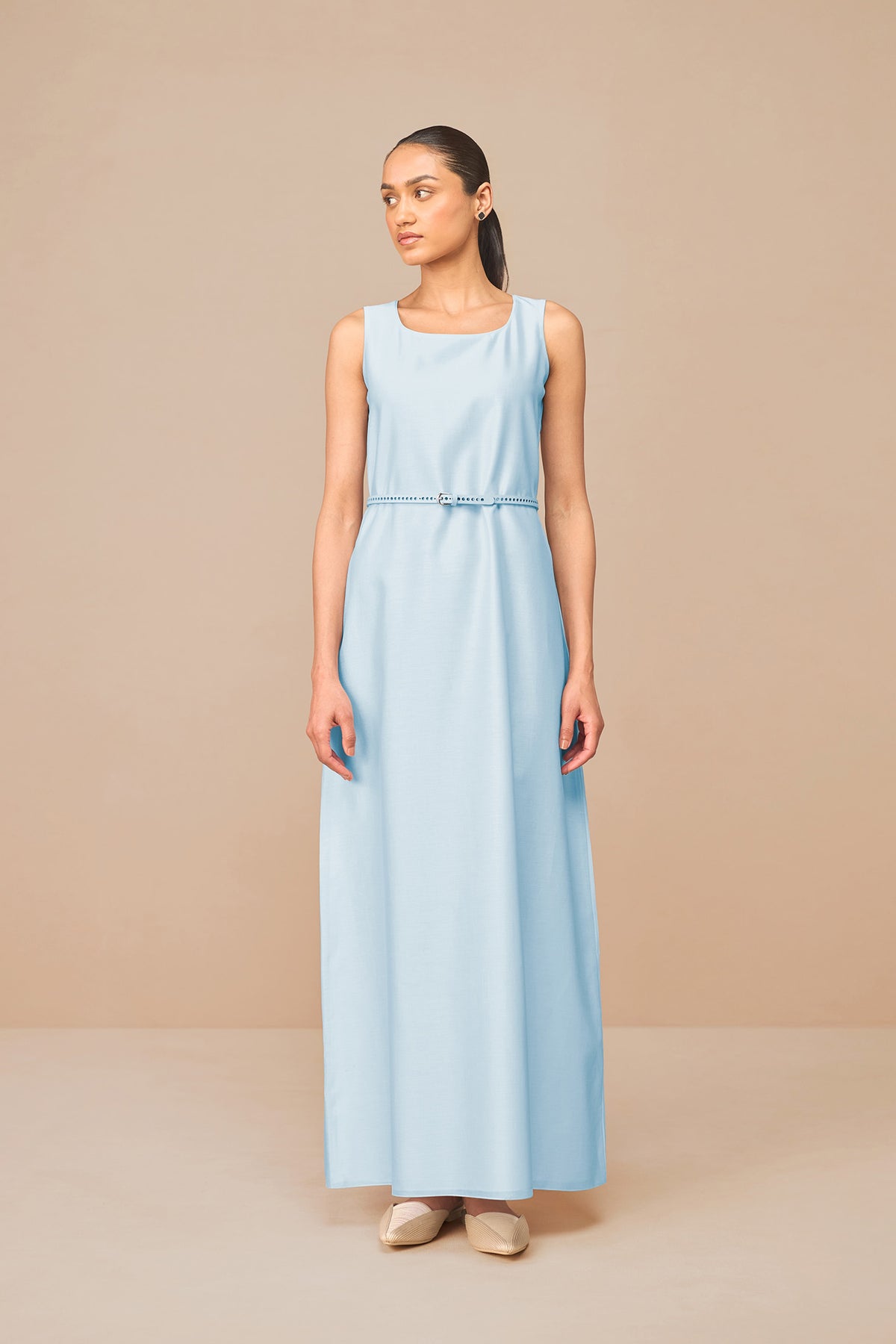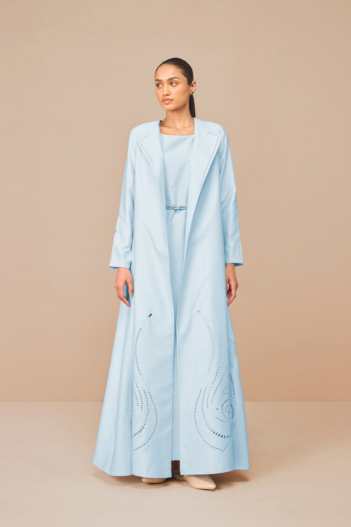 Meet raysa, the jacket set that glimmers under the summer sun. Delicate chanderi (cotton silk) serves as a canvas for intricate cut-work, resham and dori embroidery, taking the form of peacocks and blooming flowers. Accompanied by an inner dress with a soft square neckline in the same soothing beige and a faux leather belt. The draped lapels lend raysa an understated elegance that makes her perfect for family gatherings with the grass under your feet and a clear sky above.
