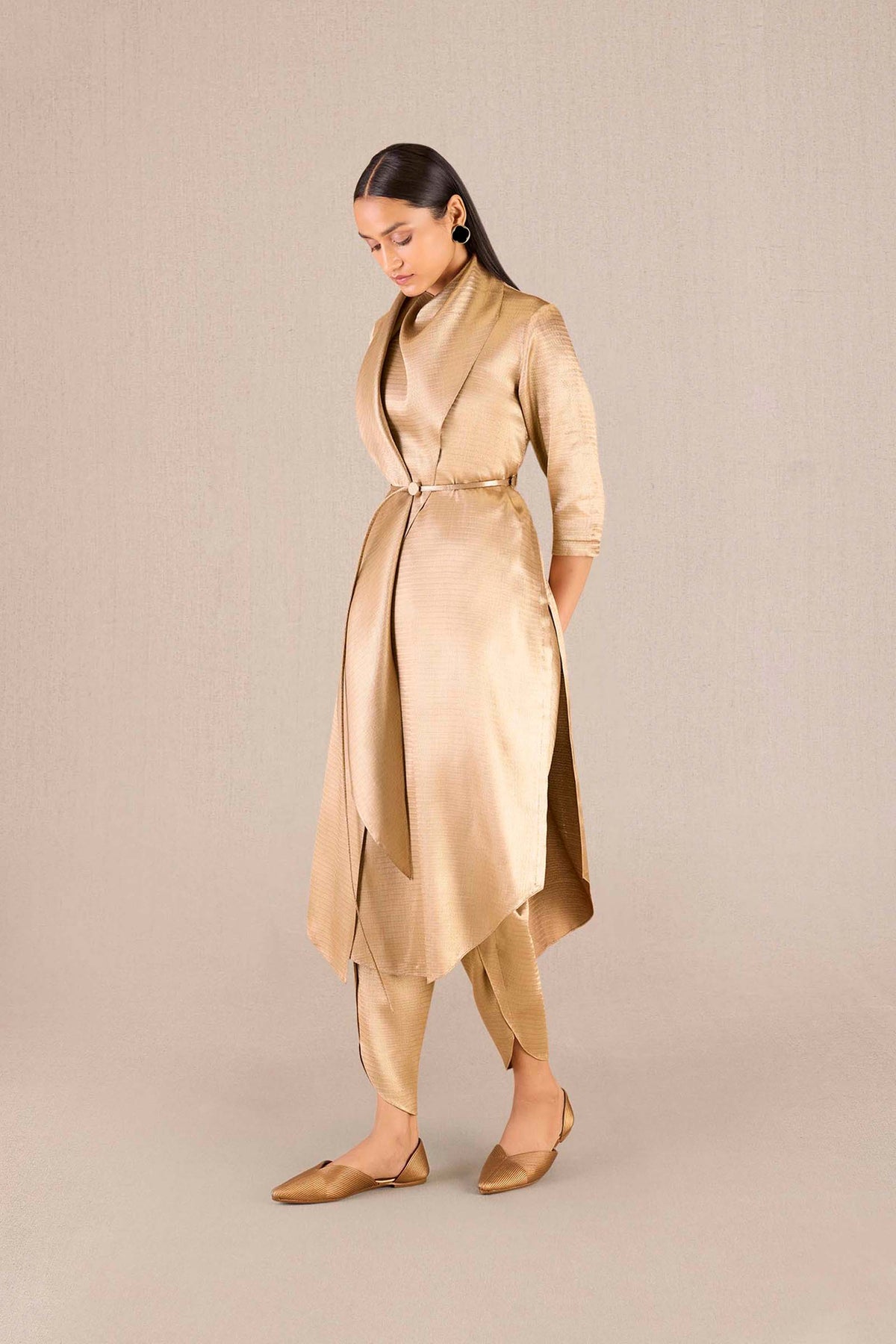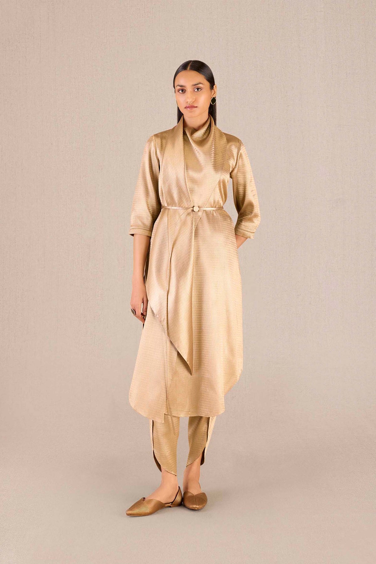 Sweeping gold brocade drapes itself around the neck of the tunic, providing our ruhma tunic set with a unique silhouette. The matching pants keep the signature drape of this set, and the long belt that comes with the set ties the whole outfit together. Pair ruhma with our zahra flats and iman clutch for a golden look that turns heads at your next festive celebration..