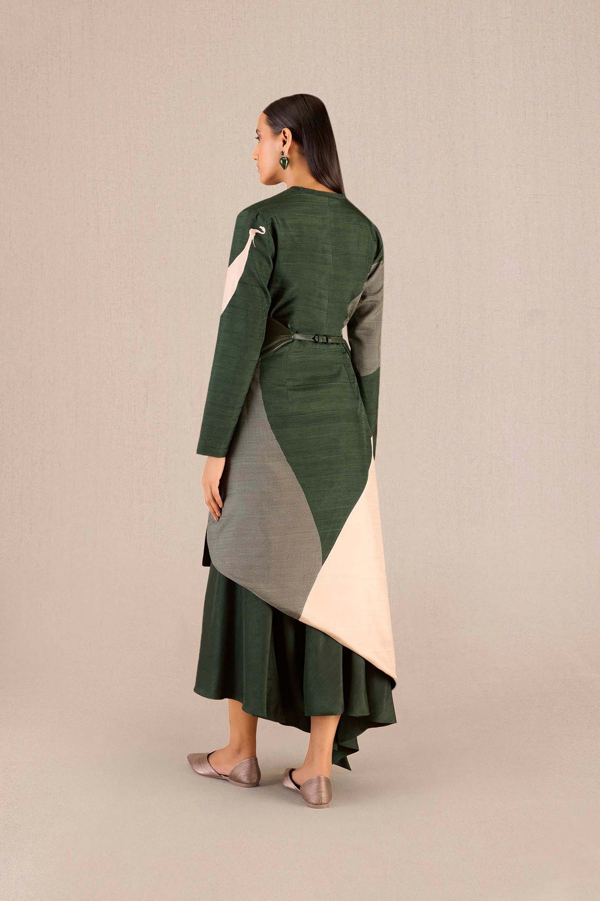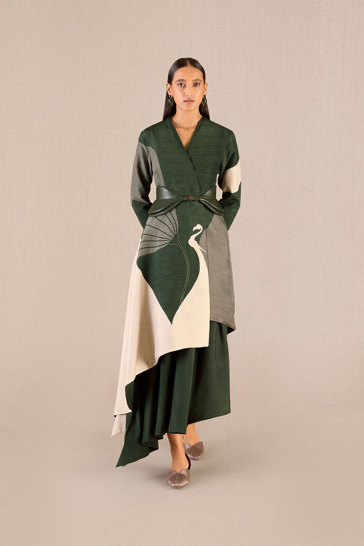 The pleats of the serena jacket cascade over its asymmetrical hem, falling over the skirt below in soft layers. Flowers, leaves and peacocks pattern the rich green silk. The fluid prints on the jacket and its full sleeves complement the entire set, which includes a matching inner top, asymmetrical skirt and a sculpted belt in faux leather embellished by a brass button with a cut-out floral motif. Wear serena with our zahra flats and aiza sling bag for a day out with your girls.