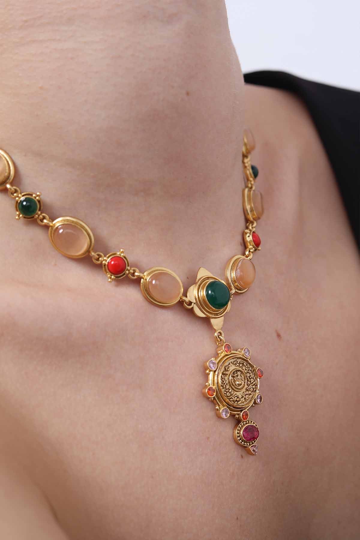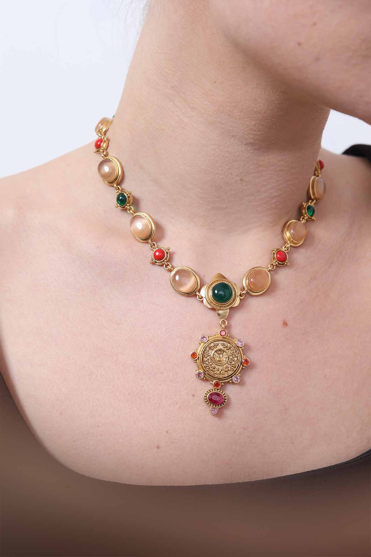 Featuring luminous cabochon stones in earthy nudes, vibrant corals, and deep greens, the design gracefully leads to a captivating gold medallion. Embellished with multicolored gems and a delicate ruby colored drop, this statement piece evokes the mystique of cosmic alignment, making it perfect for both everyday royalty