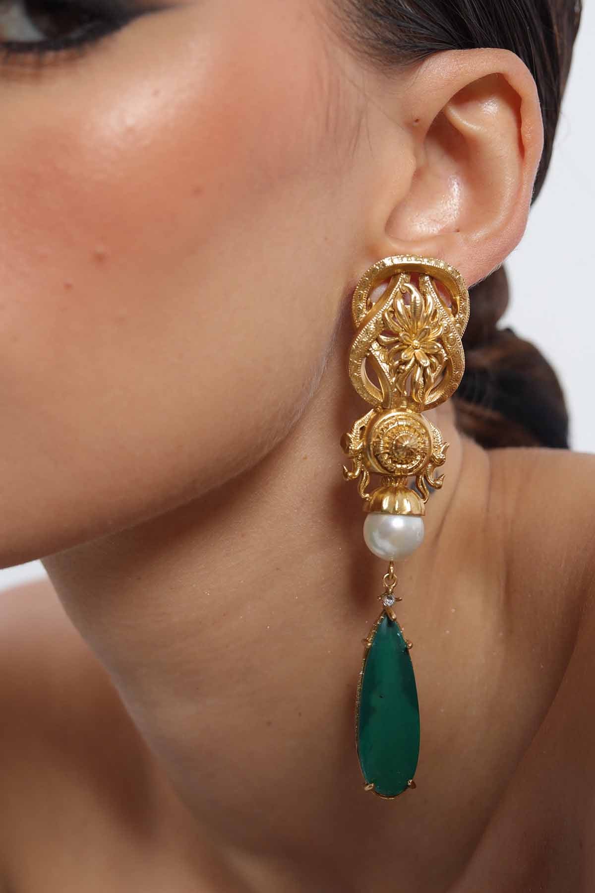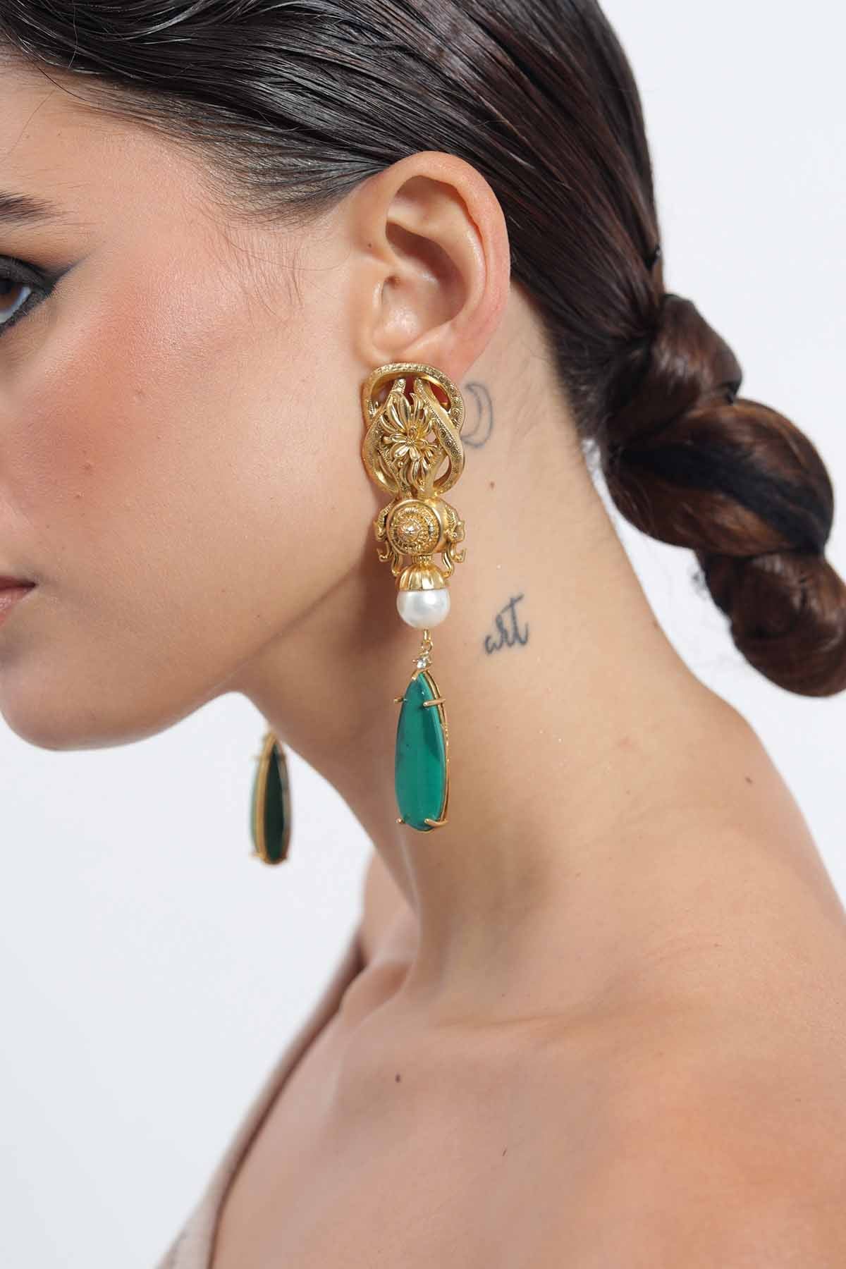 An ode to grandeur, these earrings marry ornate baroque-inspired goldwork with the purity of a pearl and the striking depth of a faux malachite drop. Intricately detailed, they channel old-world regality while retaining a modern sculptural drama. Each element - the embossed crest, the luminous pearl, the emerald-toned teardrop, plays its part in creating a statement piece that feels both timeless and commanding.