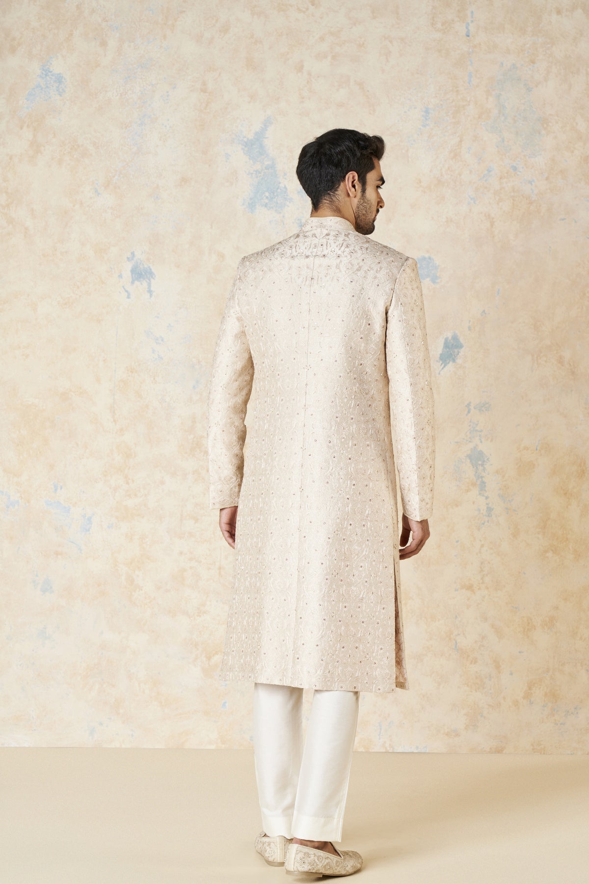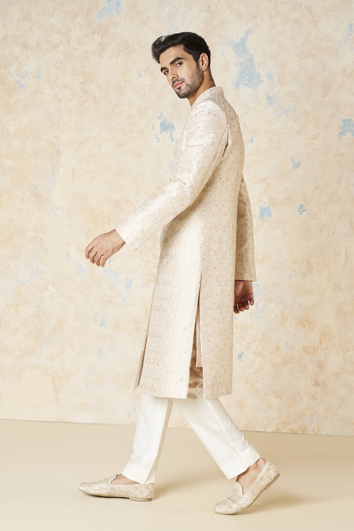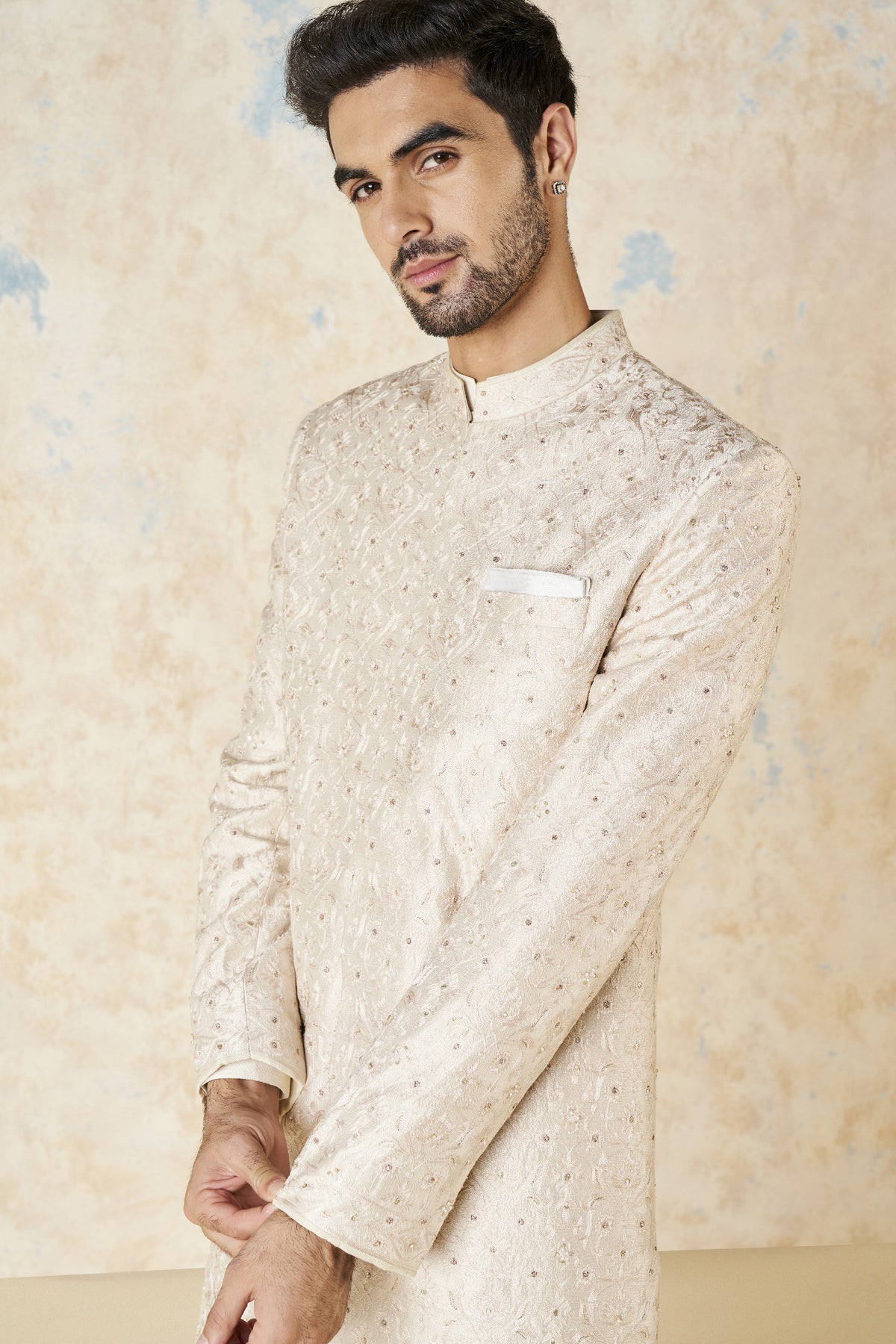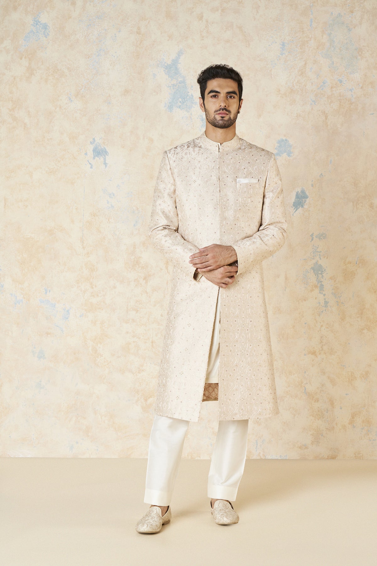 Crafted with aari and zardozi embroidery, the aajay sherwani is perfect for modern celebrations. Elevated with detailed motifs, this occasion wear essential is a great addition to your wardrobe.