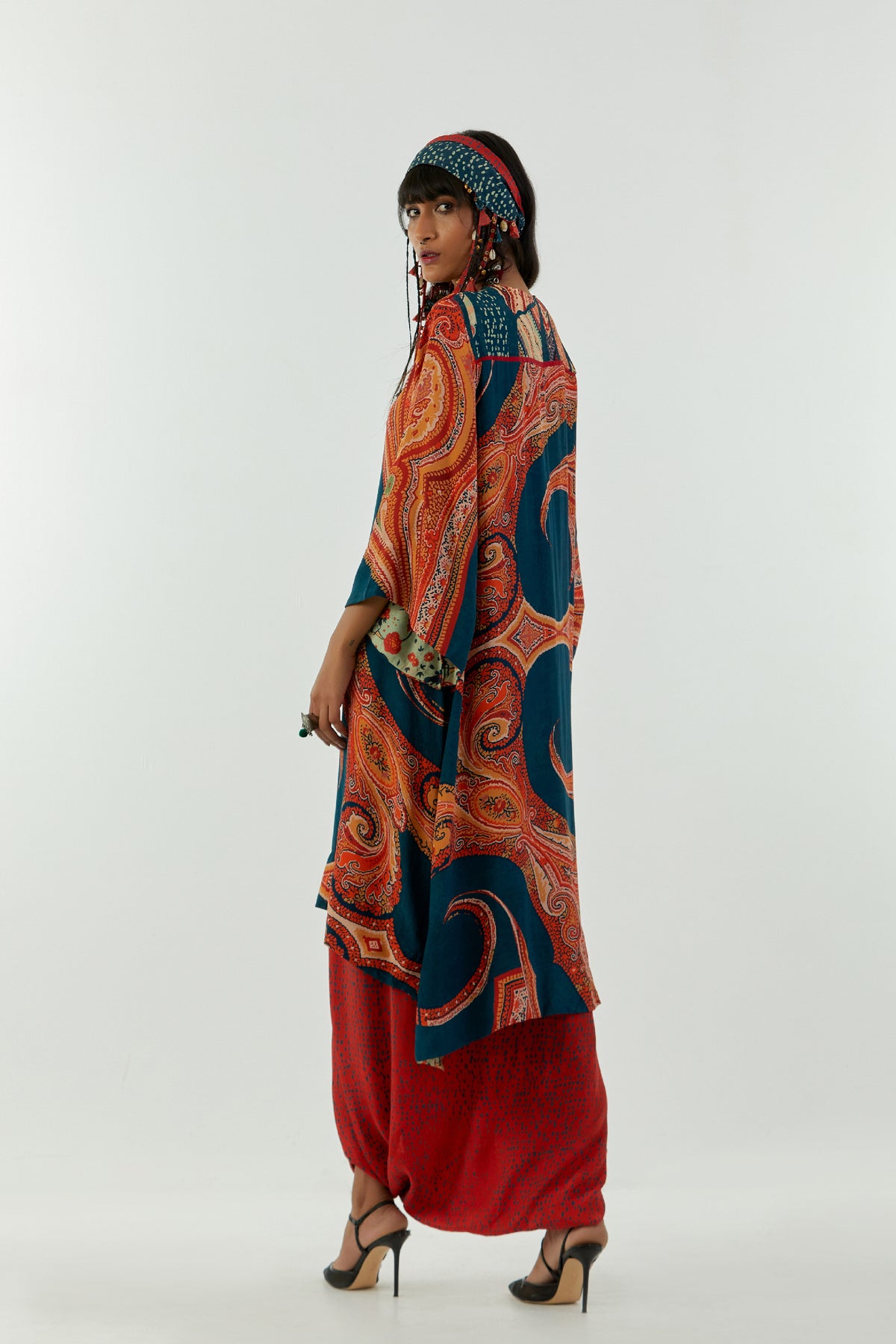 Ambi print long kurta with tribal tassel detailing in front, paired with printed drape trouser.