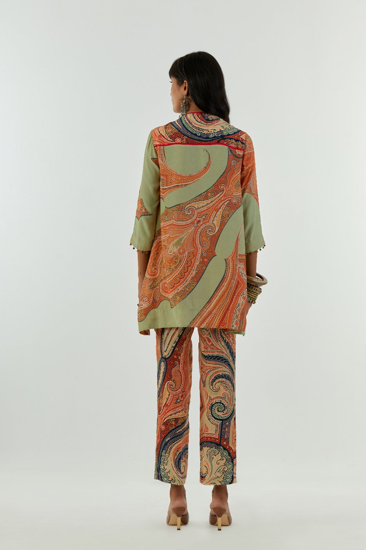 Ambi print short kurta with embroidery in front and paired with printed straight trouser.