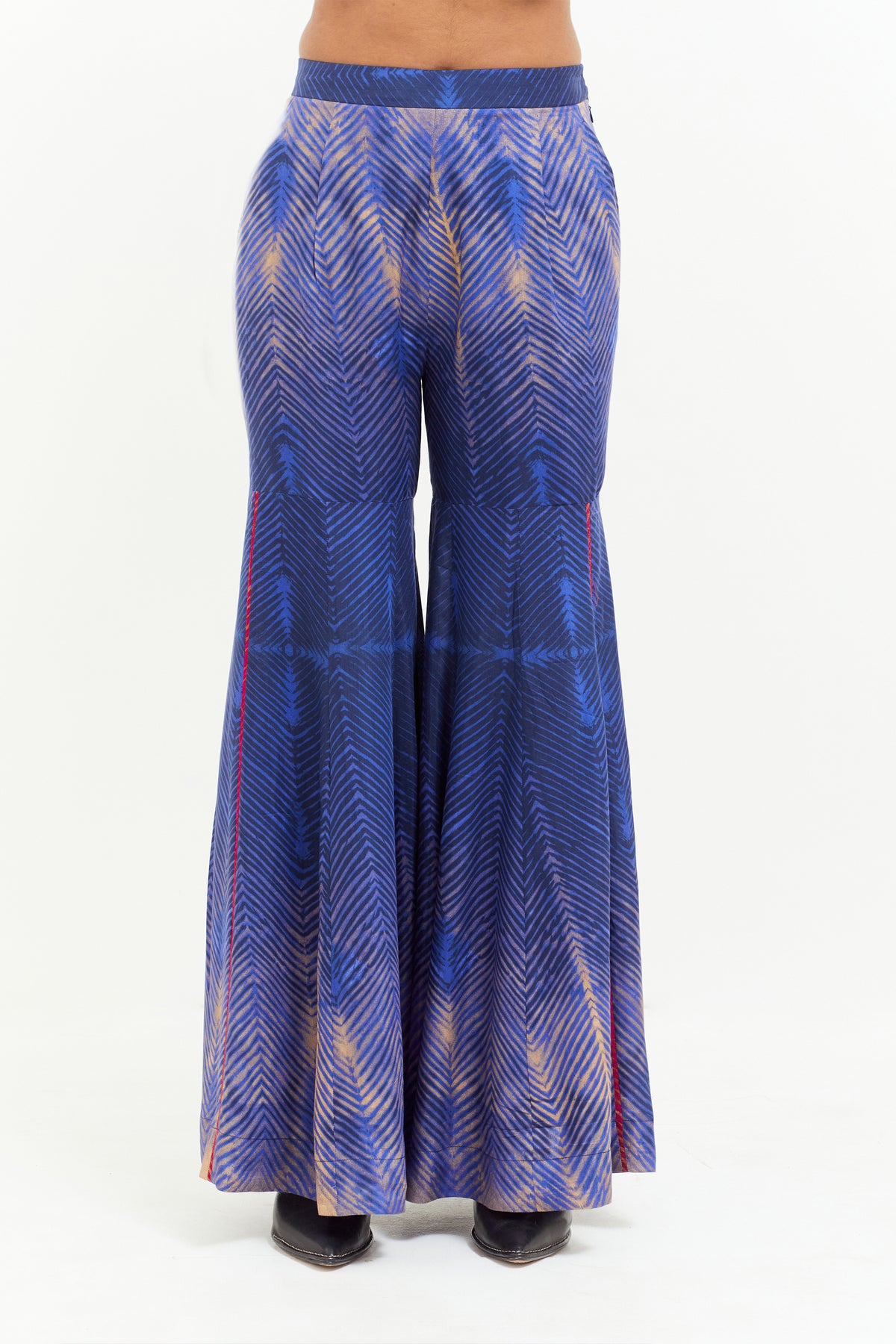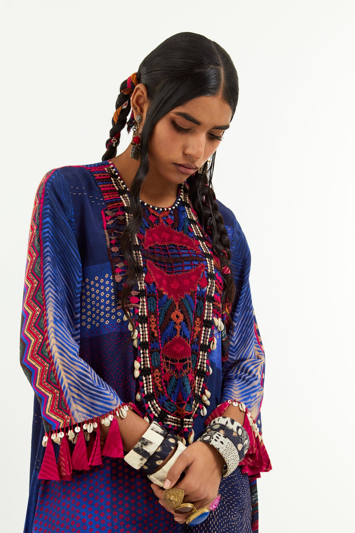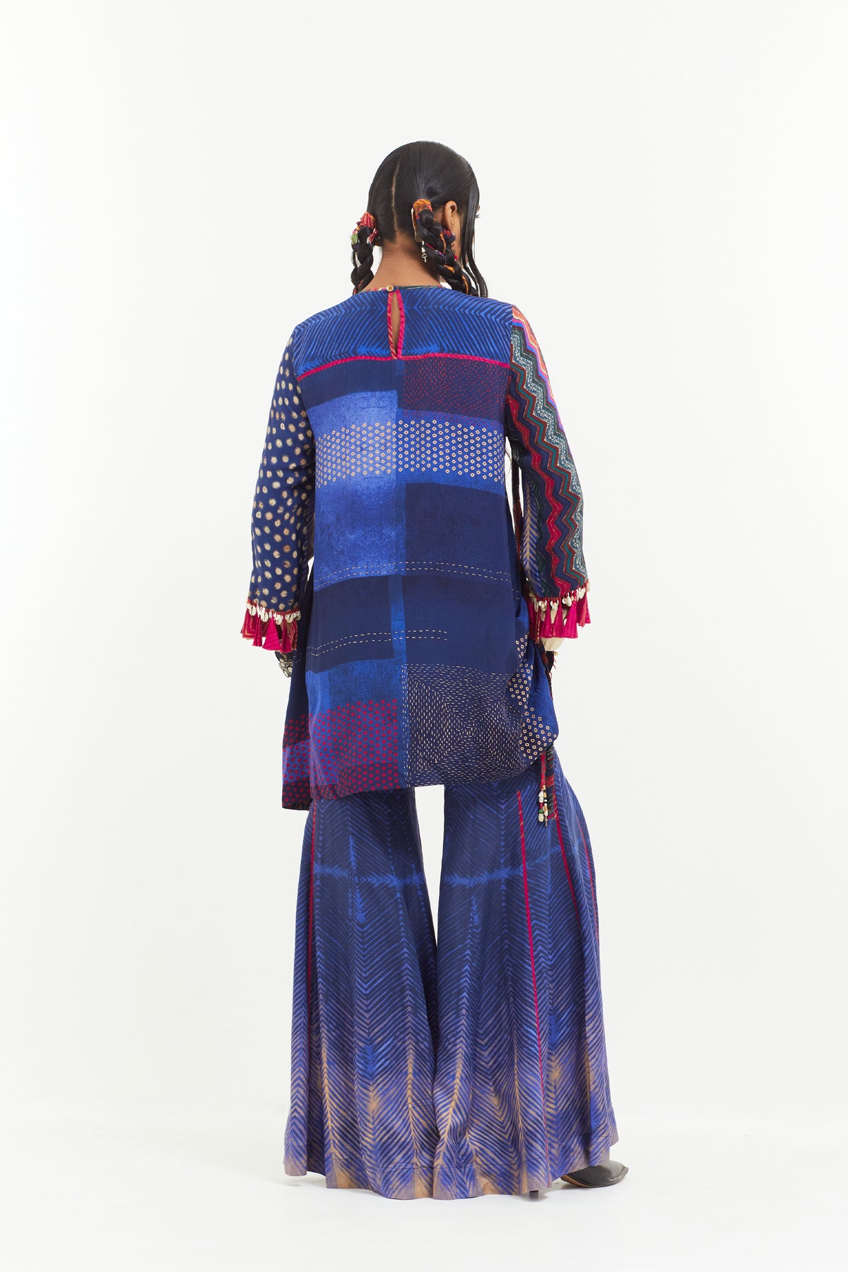 Relaxed fit short solid kurti with printed inserts paired with shibori printed sharara trouser.