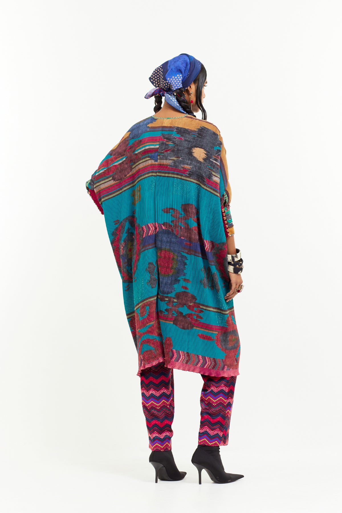 Printed crinkle tunic with embroidered yoke, tribal tassel detail and seam inserts paired with printed trouser.