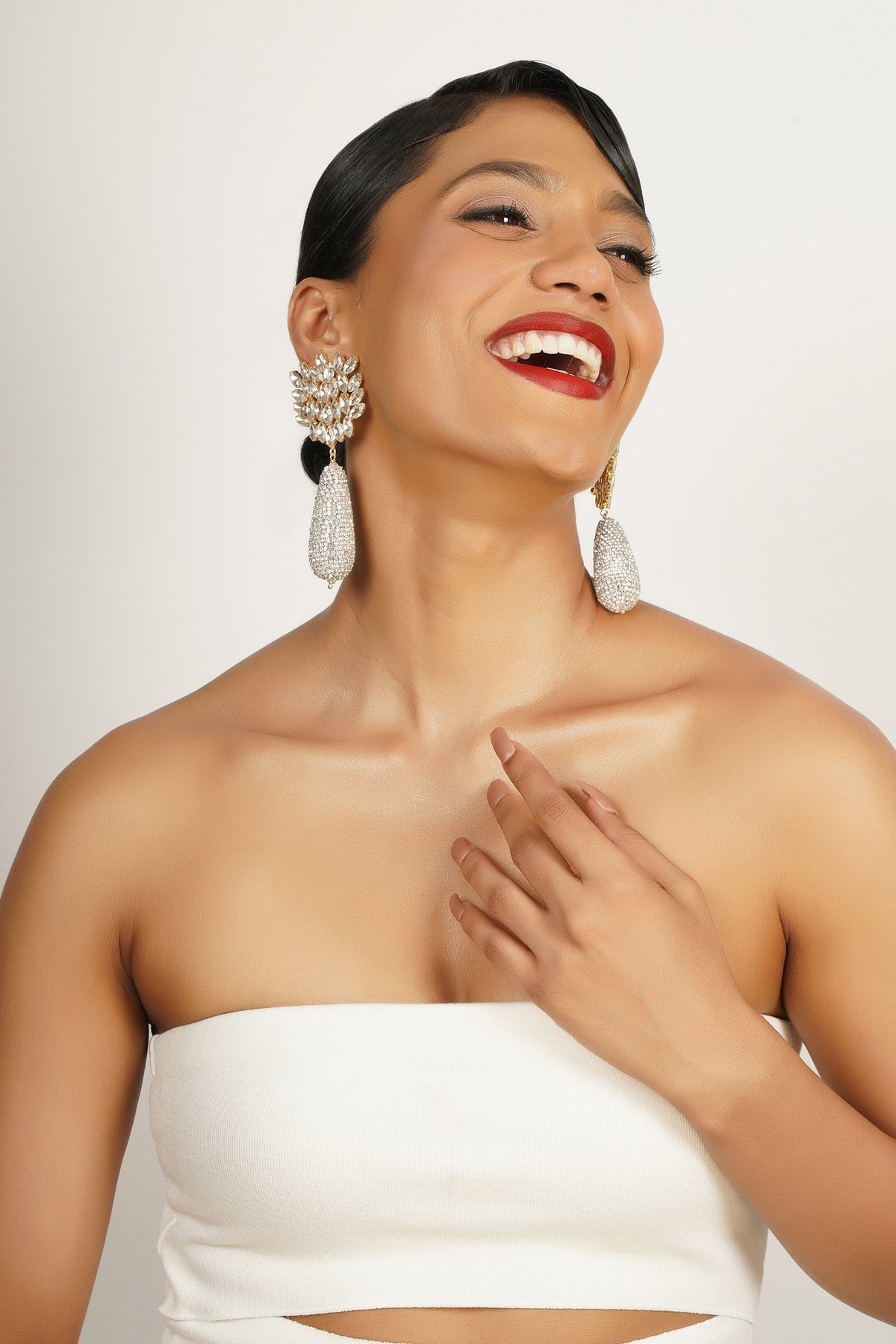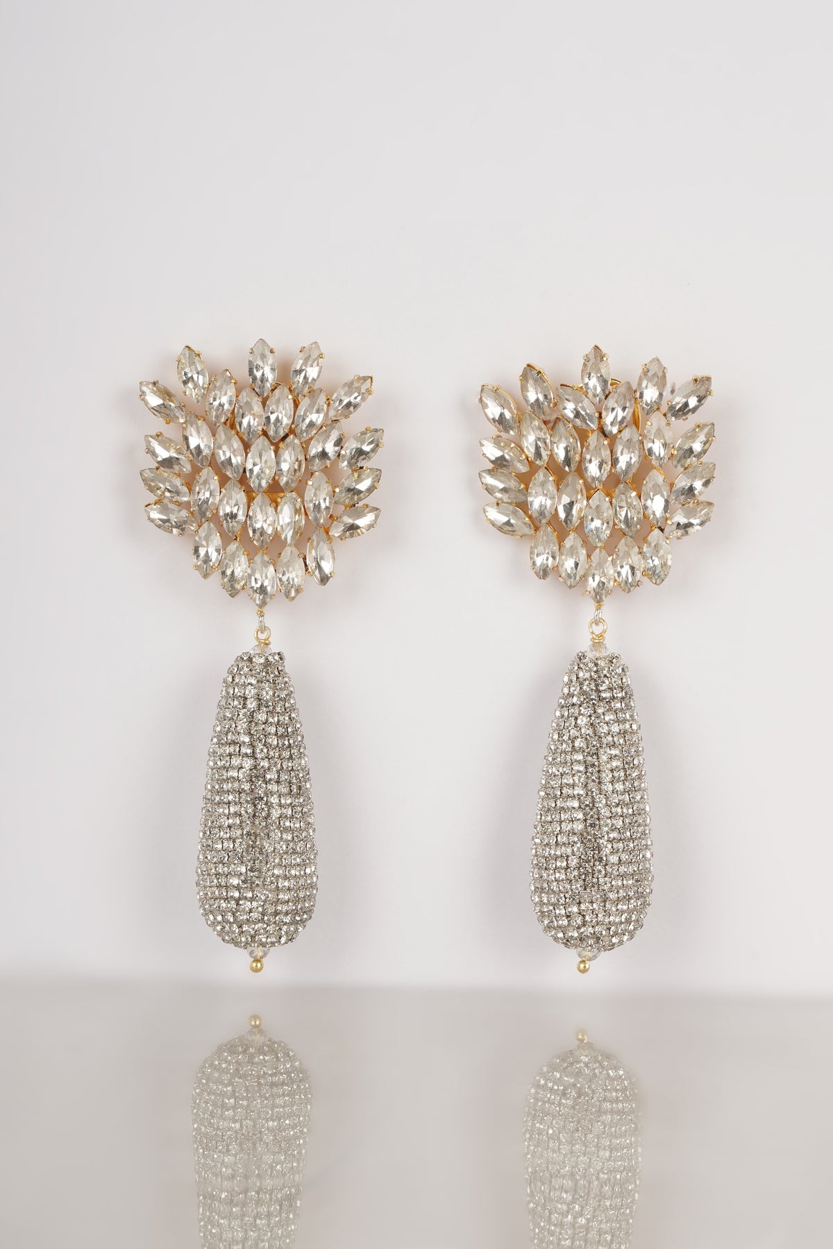 Introducing our "Floral cascade" earrings, an embodiment of elegance and sophistication. Crafted from premium crystals, these earrings boast a timeless silver hue, accentuated by a delicate flower-shaped top and a graceful tear drop design. Enhance your charm with these versatile earrings, perfect for adding a touch of allure to any outfit. Discover the allure of our floral cascade earrings, meticulously designed for the fashion aficionado. Ideal for weddings, parties, or everyday glam, these earrings effortlessly elevate your style. Shop now to experience the essence of floral elegance.